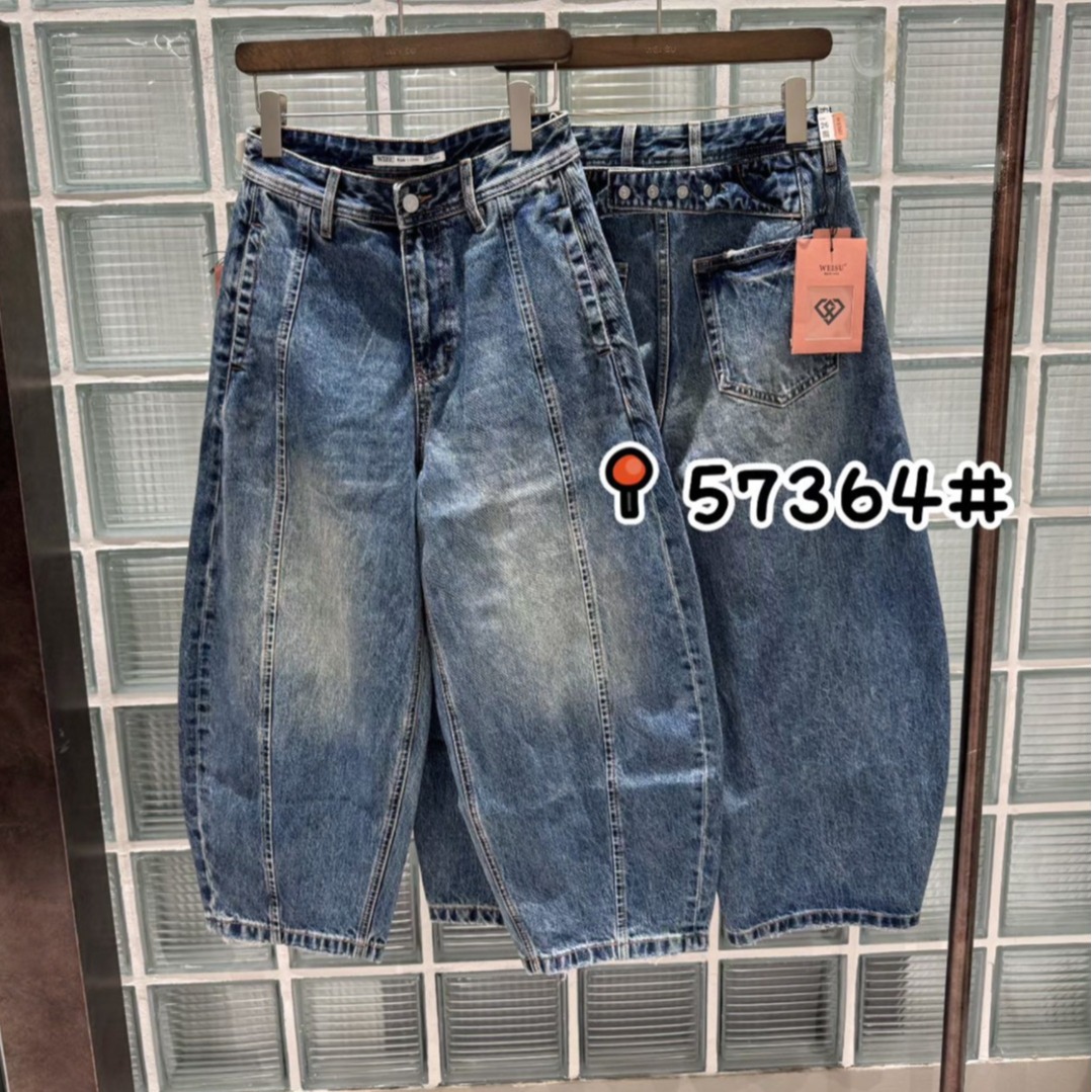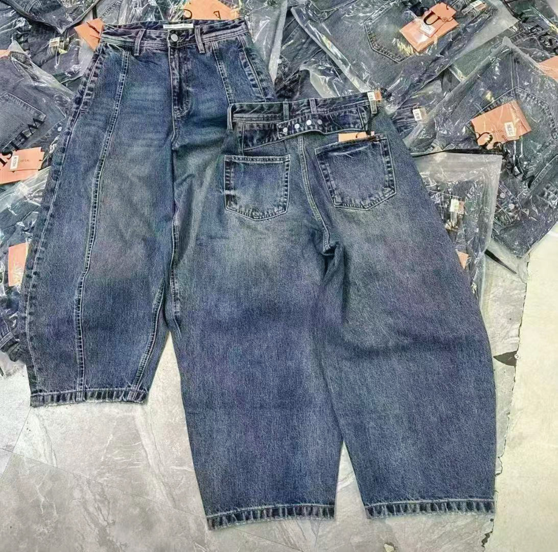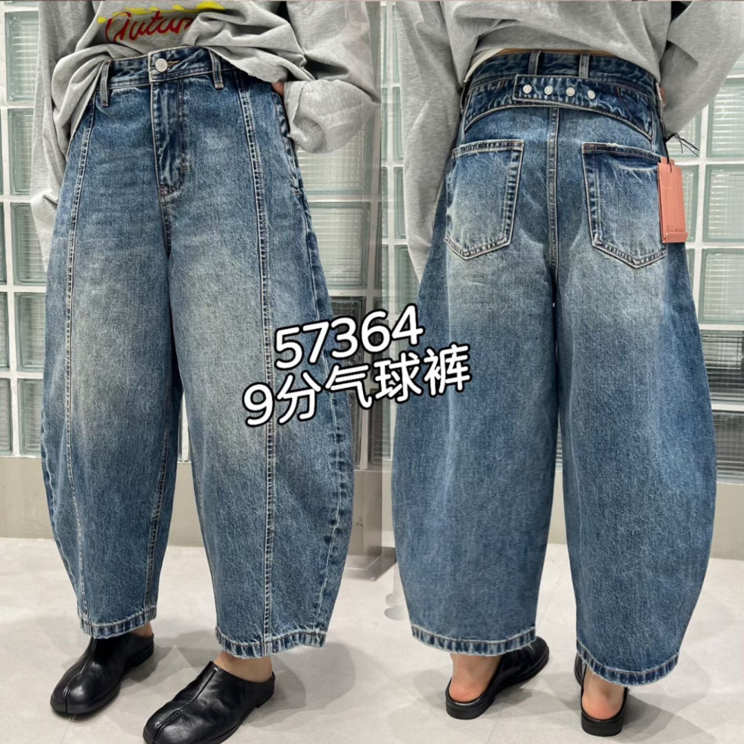 weisu 오직 속도 57364 유럽 상품 데님 풍선 바지 여성 봄 하이웨이스트 버클 넓은 다리 루즈핏 모통이 칼 9부 바지