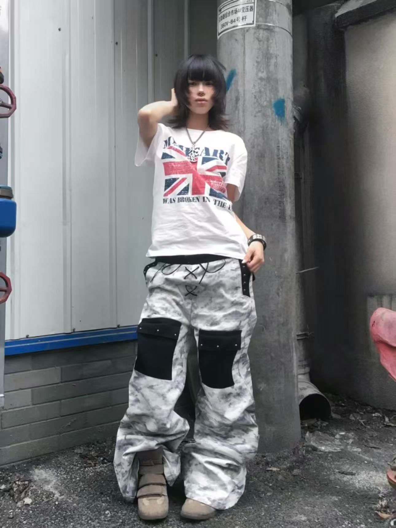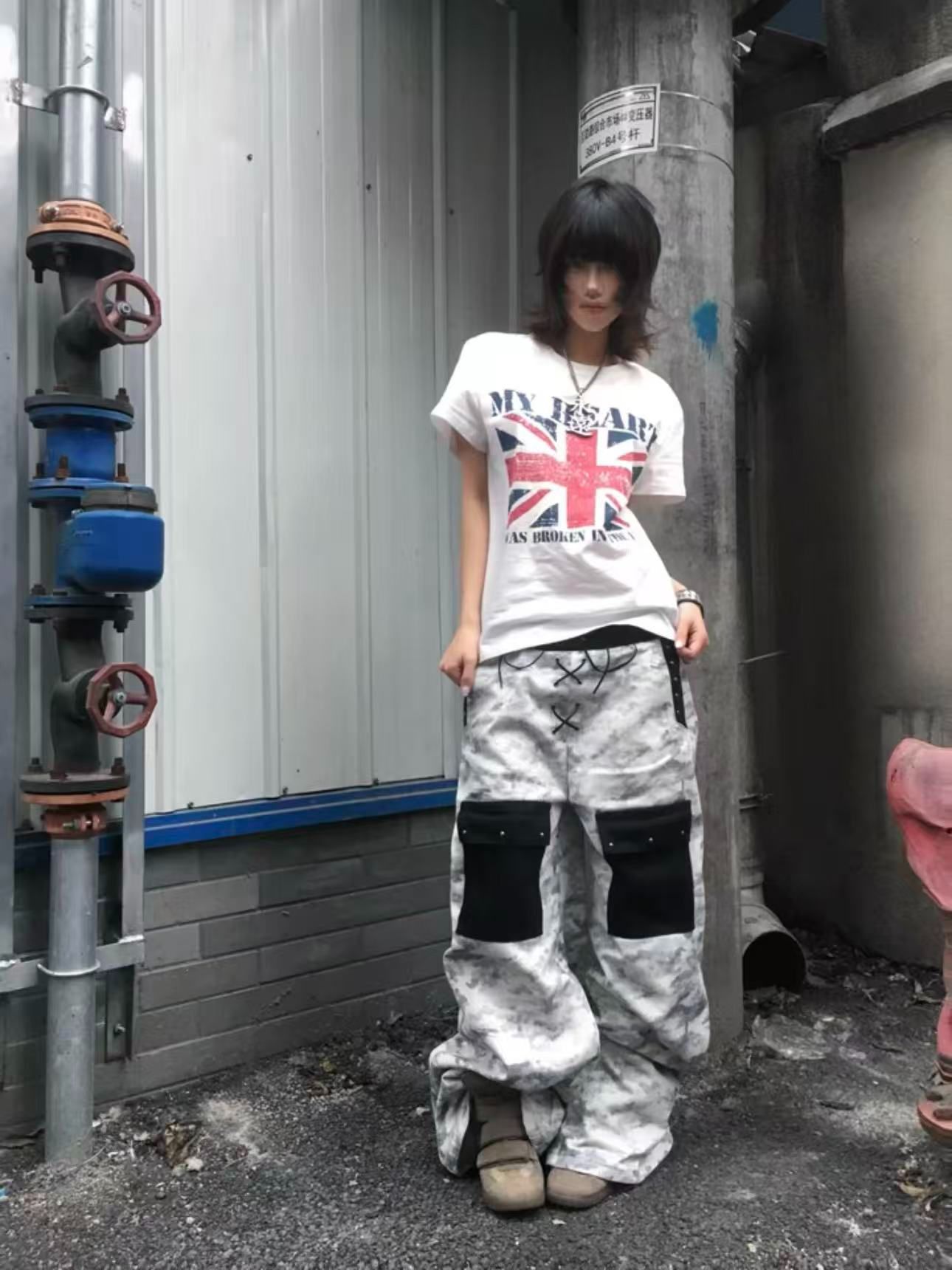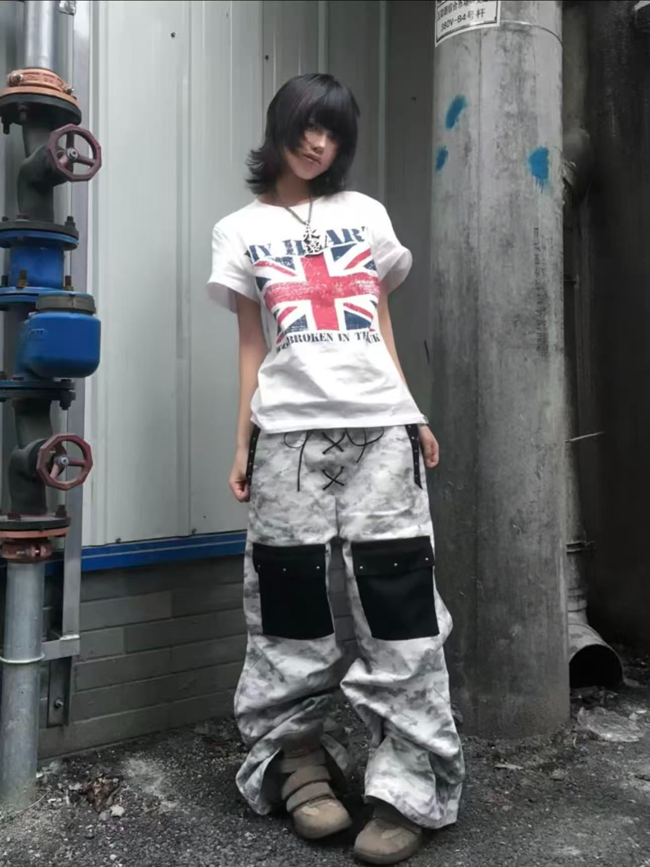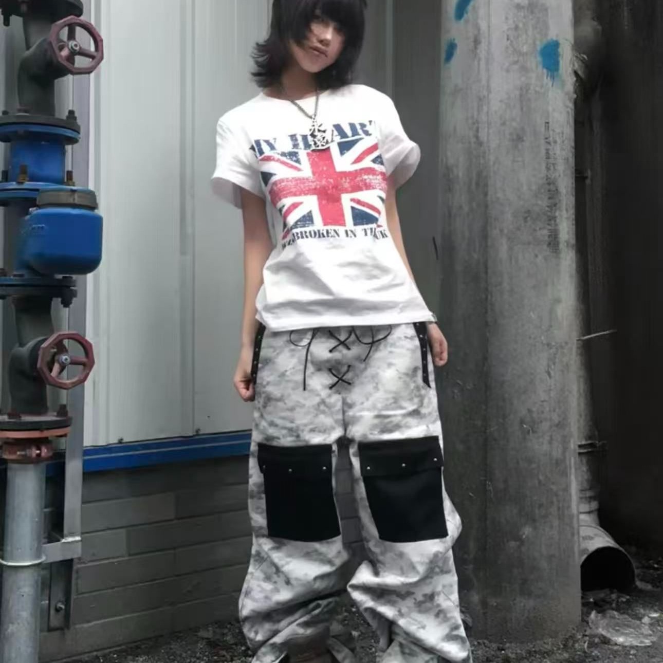아메리칸 알파벳 배너 프린트 운동 웨이 바지 여성 루즈핏 느긋한 도루 센스 다용도 넓은 다리 스트레이트 캐주얼 바지