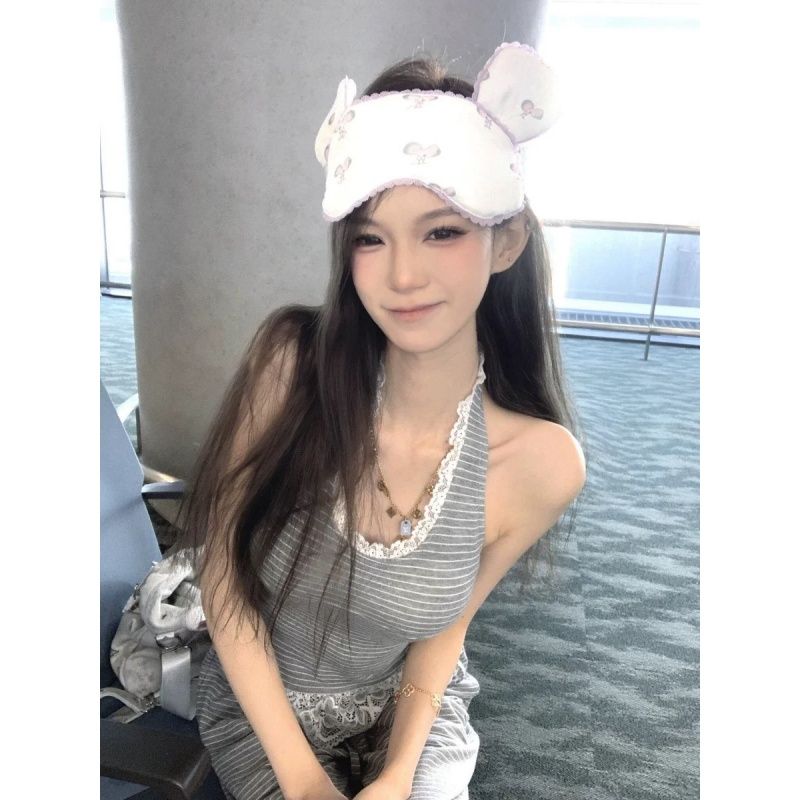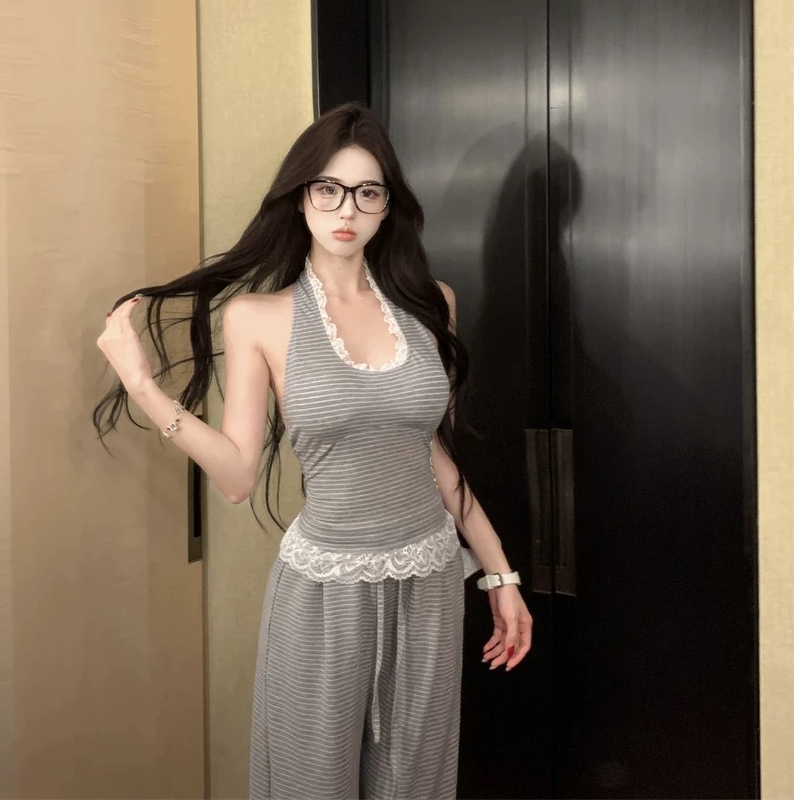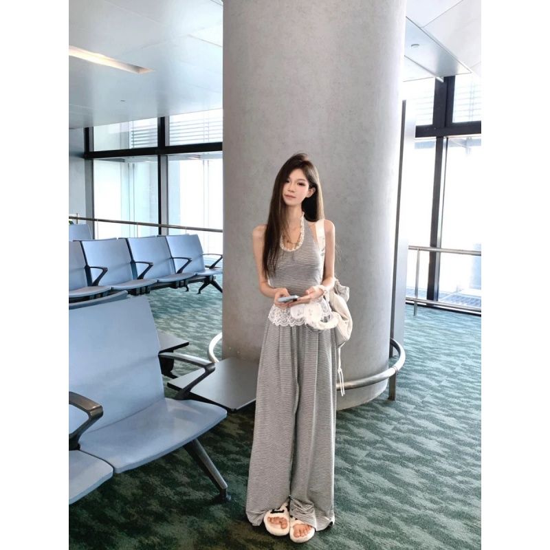 한국 스타일 달콤한 자매 캐주얼 투피스 슈트 여름 새로운 행침 목 허리 수축 슬림해 보이는 레이스 측면 넓은 다리 편안함 긴 바지 여성