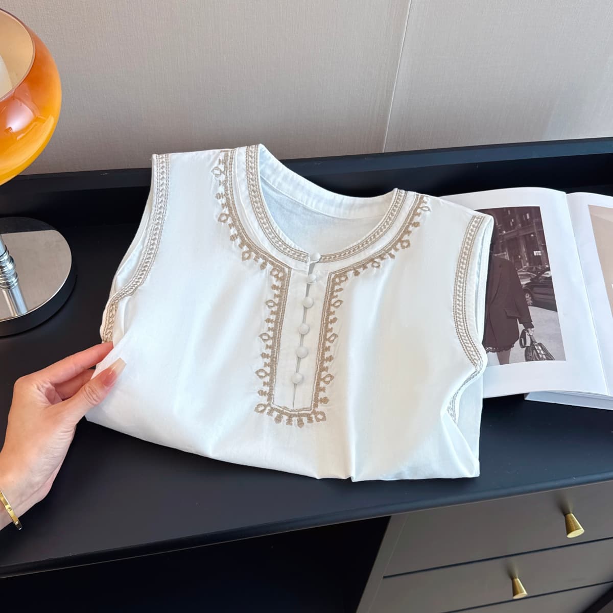 실사 오래된 돈 바람 자수 아마 조끼 여성 셔츠 외출용 프랑스식 작은 대중 맨위 얇고 가벼운 다용도 민소매 작은 셔츠