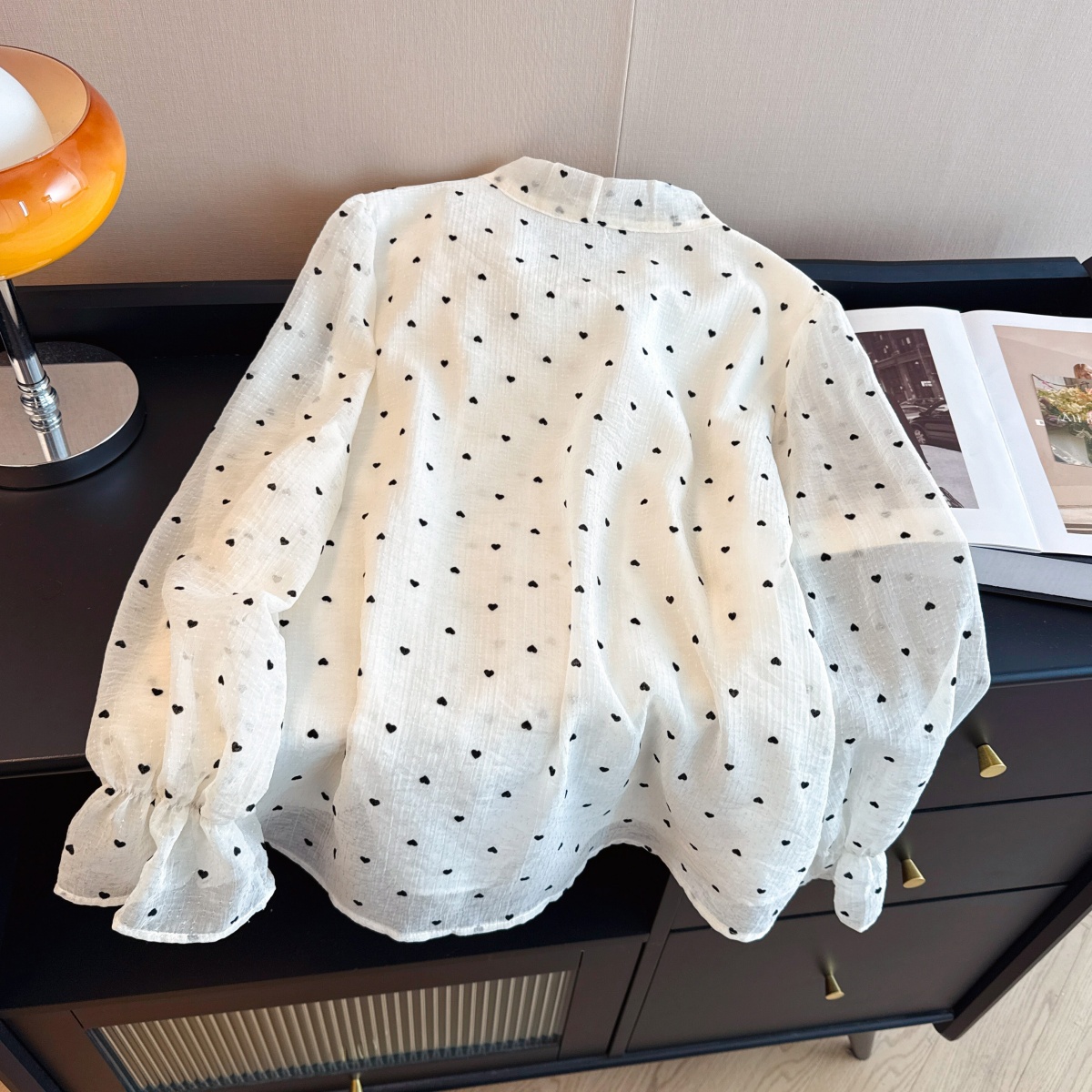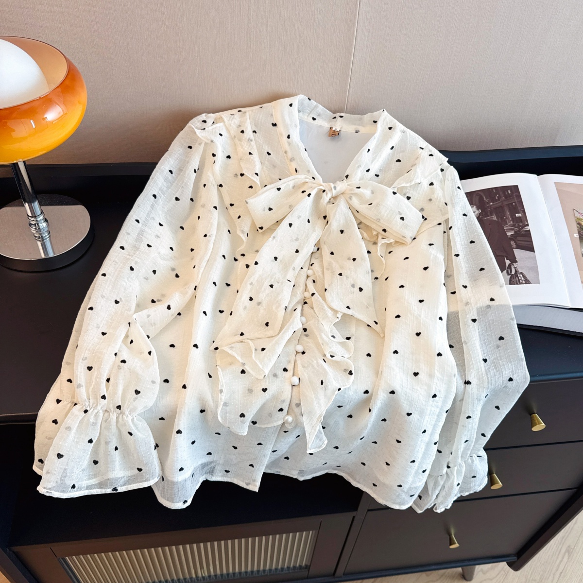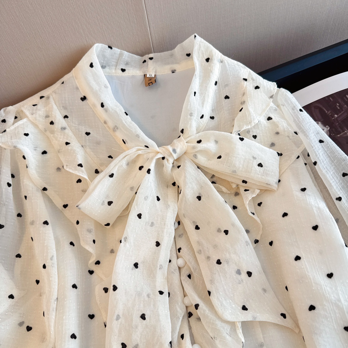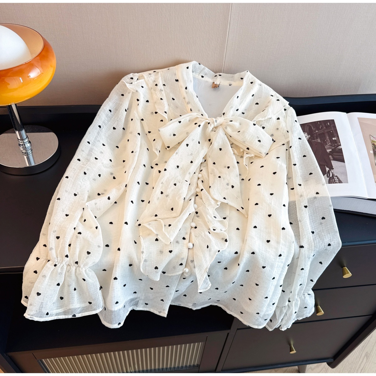 실사 재고 있음 여성 의류 프랑스식 품격 달콤함 프릴 하트 레이스업 긴팔 여성 셔츠 다용도 성숙한