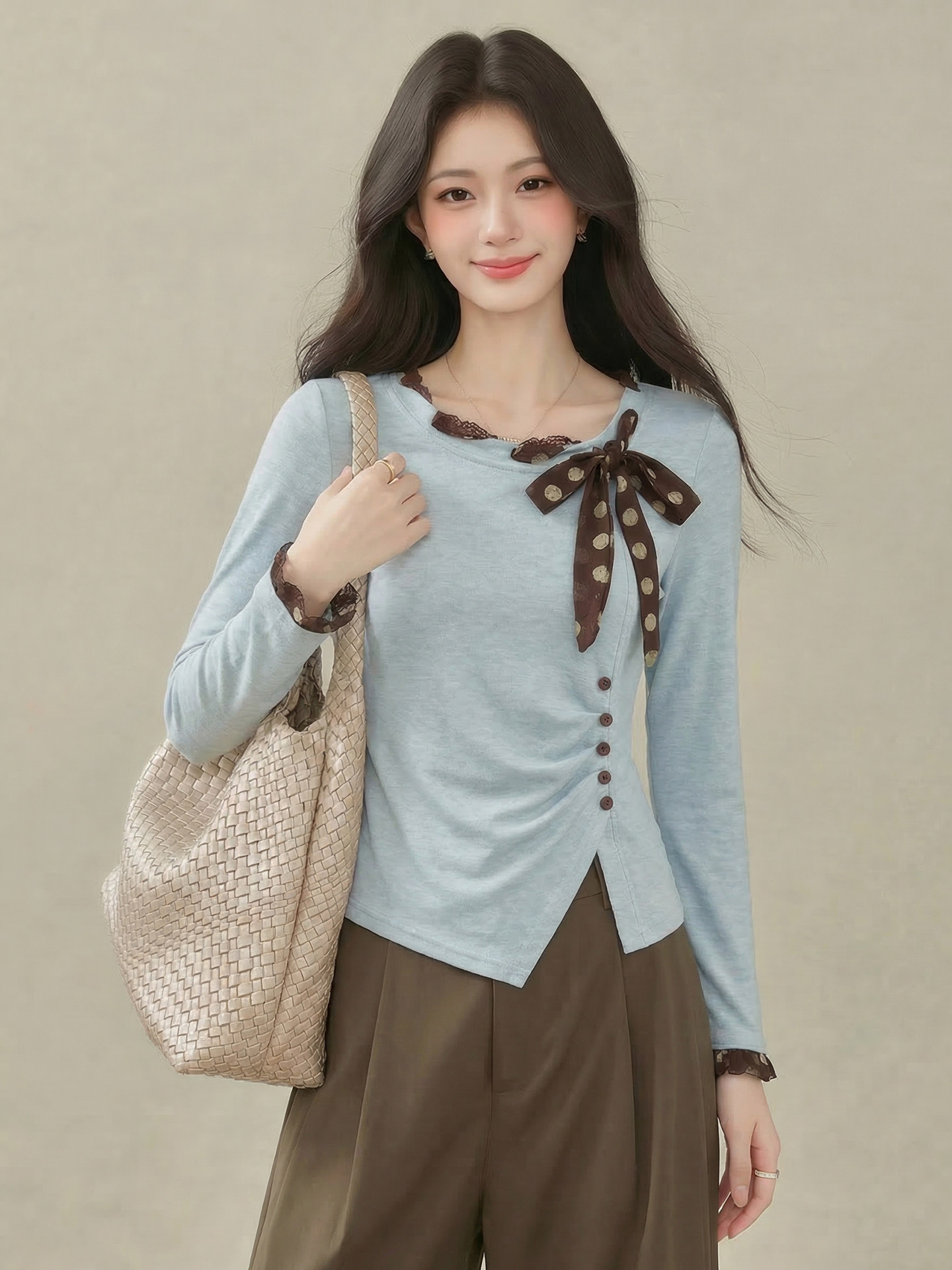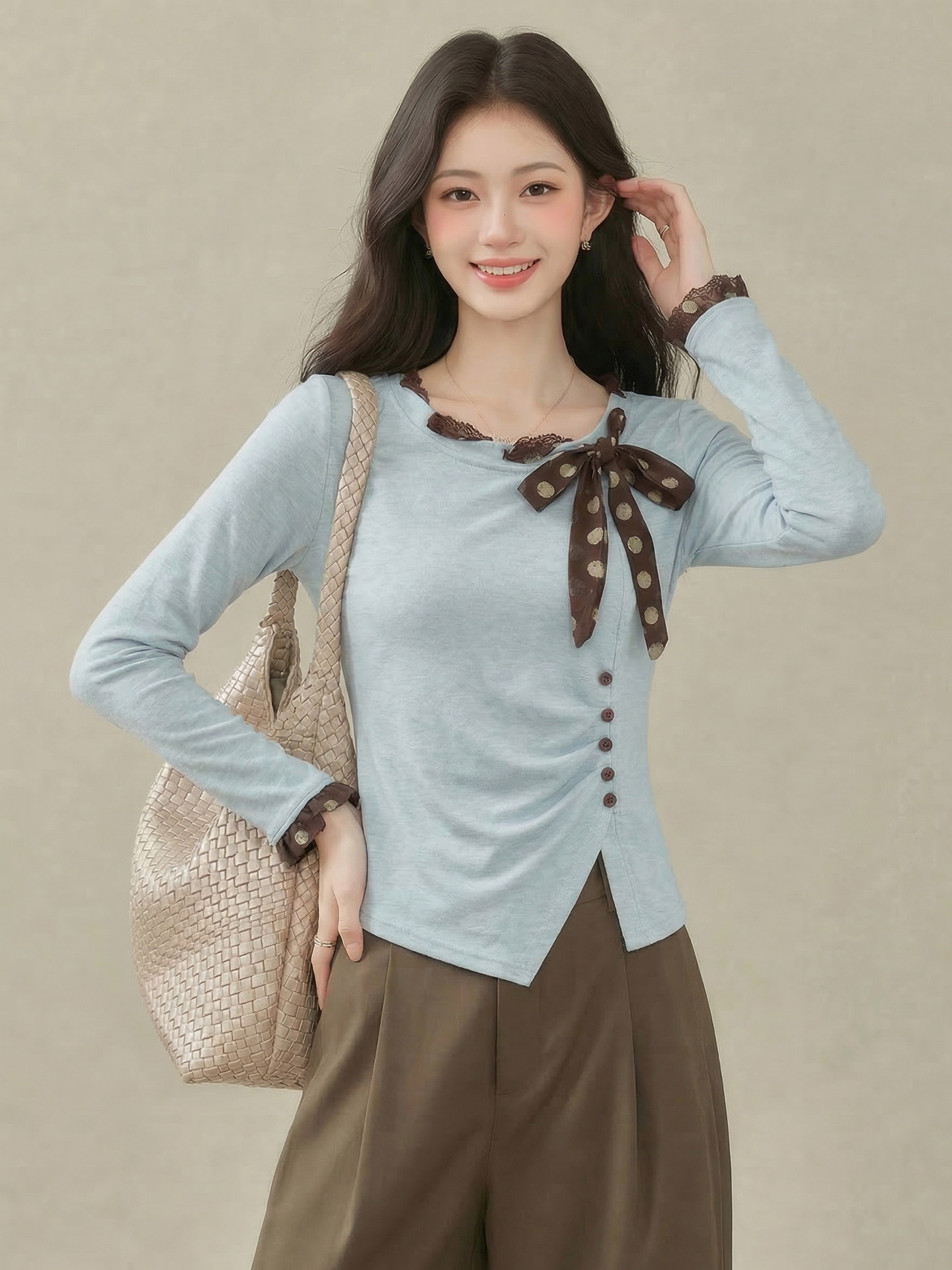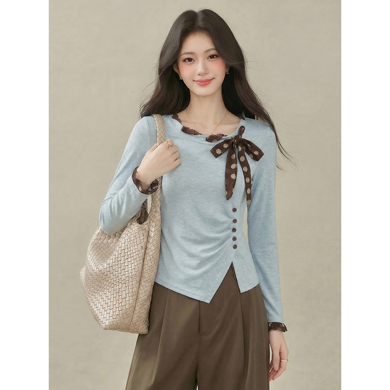 하늘색 배색 리본 티셔츠 여성 봄 새로운 도트 무늬 나비 매듭 장식 루즈핏 슬림해 보이는 캐주얼 긴팔 맨위