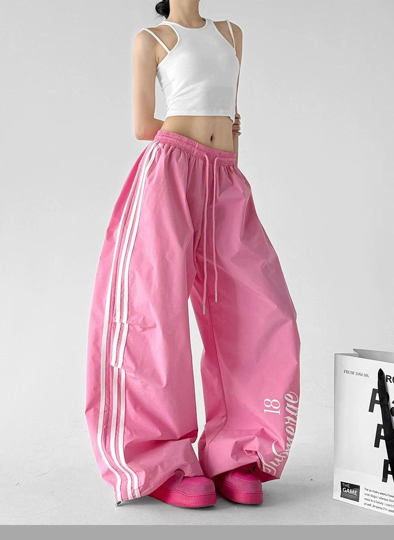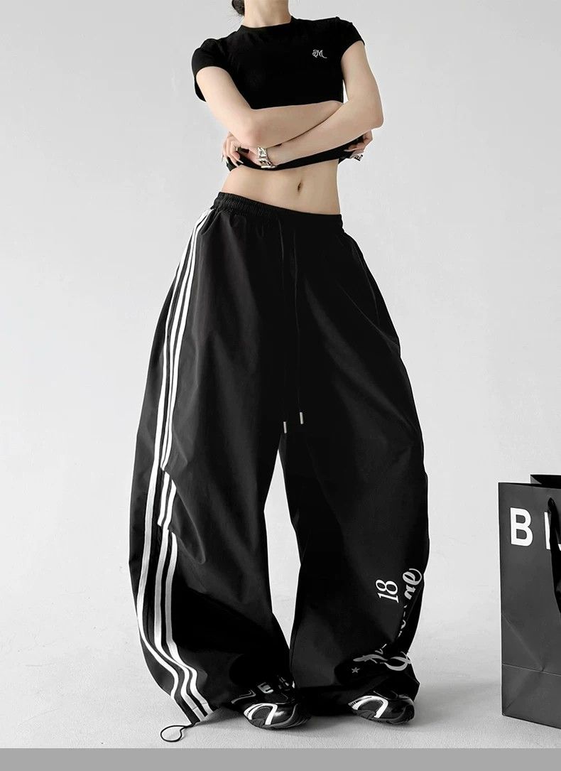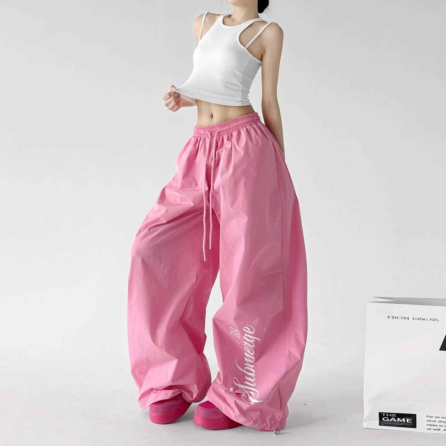 아메리칸 조수 브랜드 별 알파벳 프린트 모통이 칼 낙하산 병 바지 남자 여성 더블 허리 머리 배색 와이드 레그 팬츠