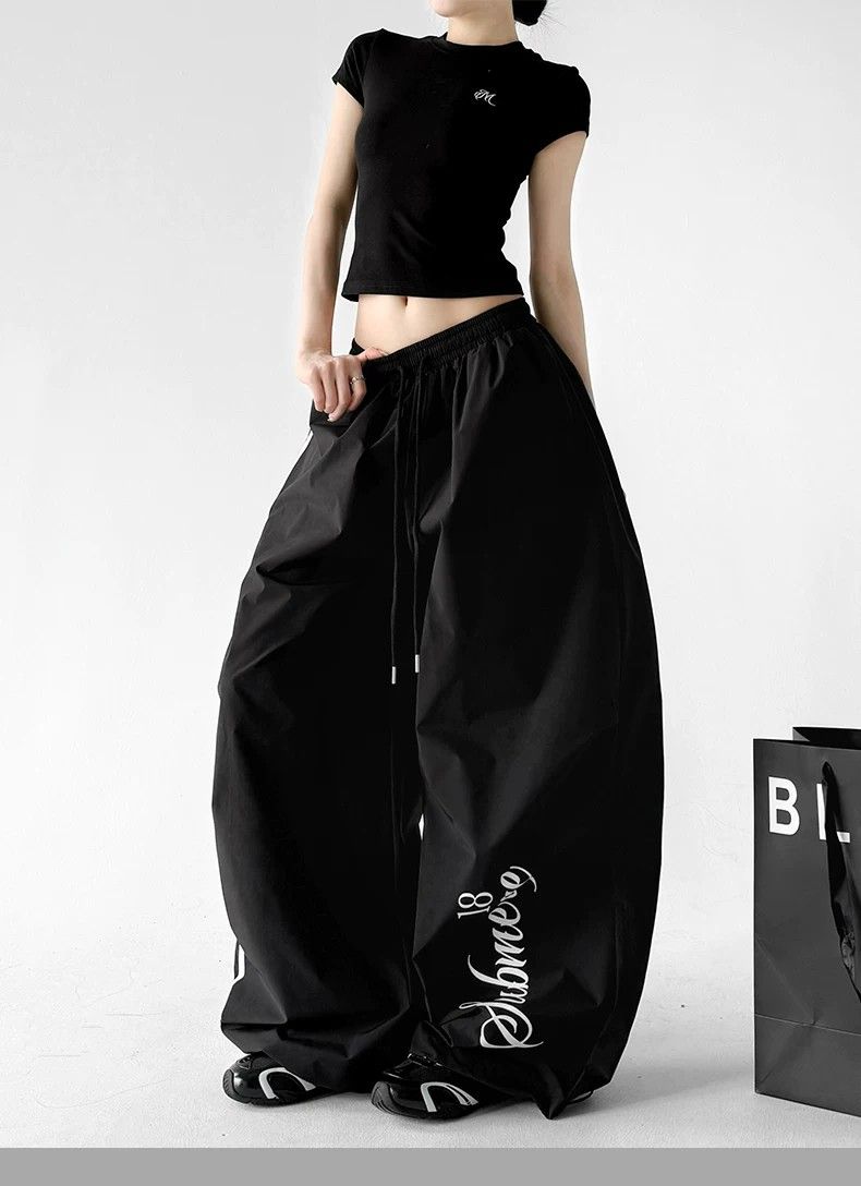 아메리칸 레트로 거리 바람 별 알파벳 프린트 와이드 레깅스 바지 봄 루즈핏 레이스업 작은 대중 디자인 모통이 칼 바지