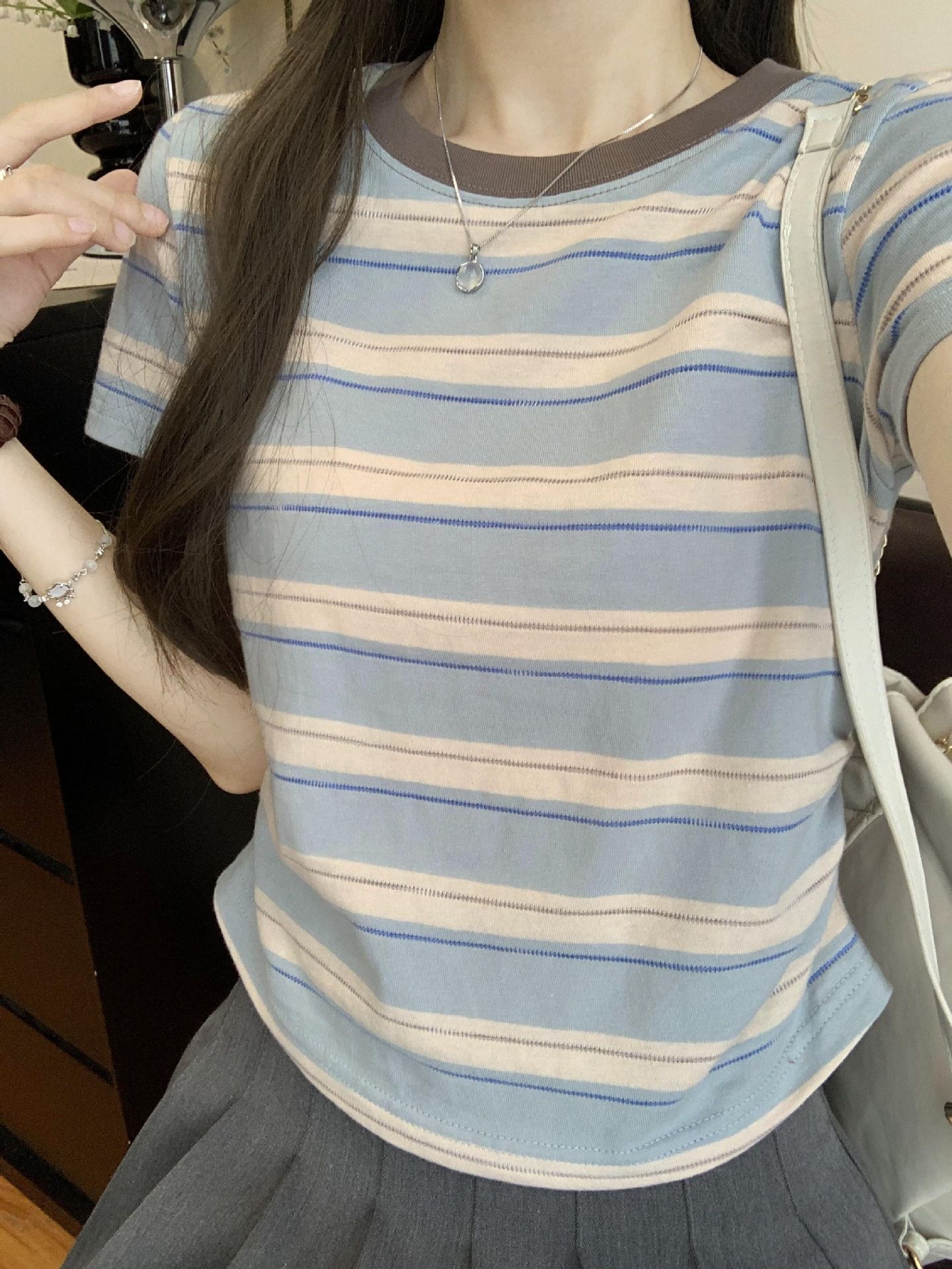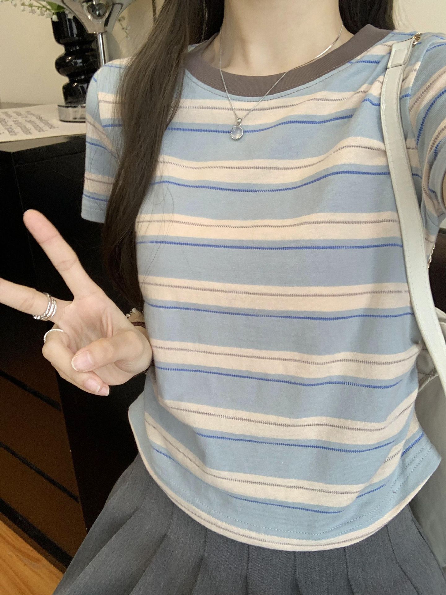 순면 스트라이프 귀여운 멩 부서 고양이 만화 프린트 빛 아시아 인 바람 반팔 몸매 가꾸기 슬림해 보이는 맨위 여성