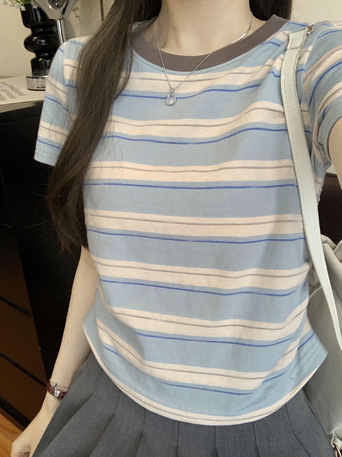 스트라이프 배색 긍정적 인 어깨 주름 반팔 티셔츠 여성 여름 몸매 가꾸기 디자인 센스