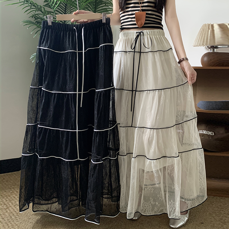 프랑스식 레이스 반신 스커트 빅 사이즈 여성 의류 하이웨이스트 슬림해 보이는 패치워크 거즈 스커트 품격 우아한 롱 스커트 플리츠 빅 플레어 스커트