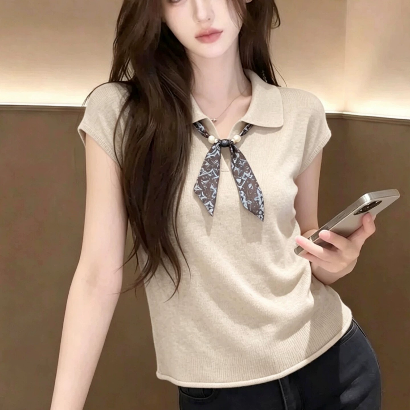 디자인 센스 회색 스카프 POLO 칼라 니트 반팔 여성 여름 2026 새로운 얇은 스타일 니트 스웨터 작은 날다 소매 맨위