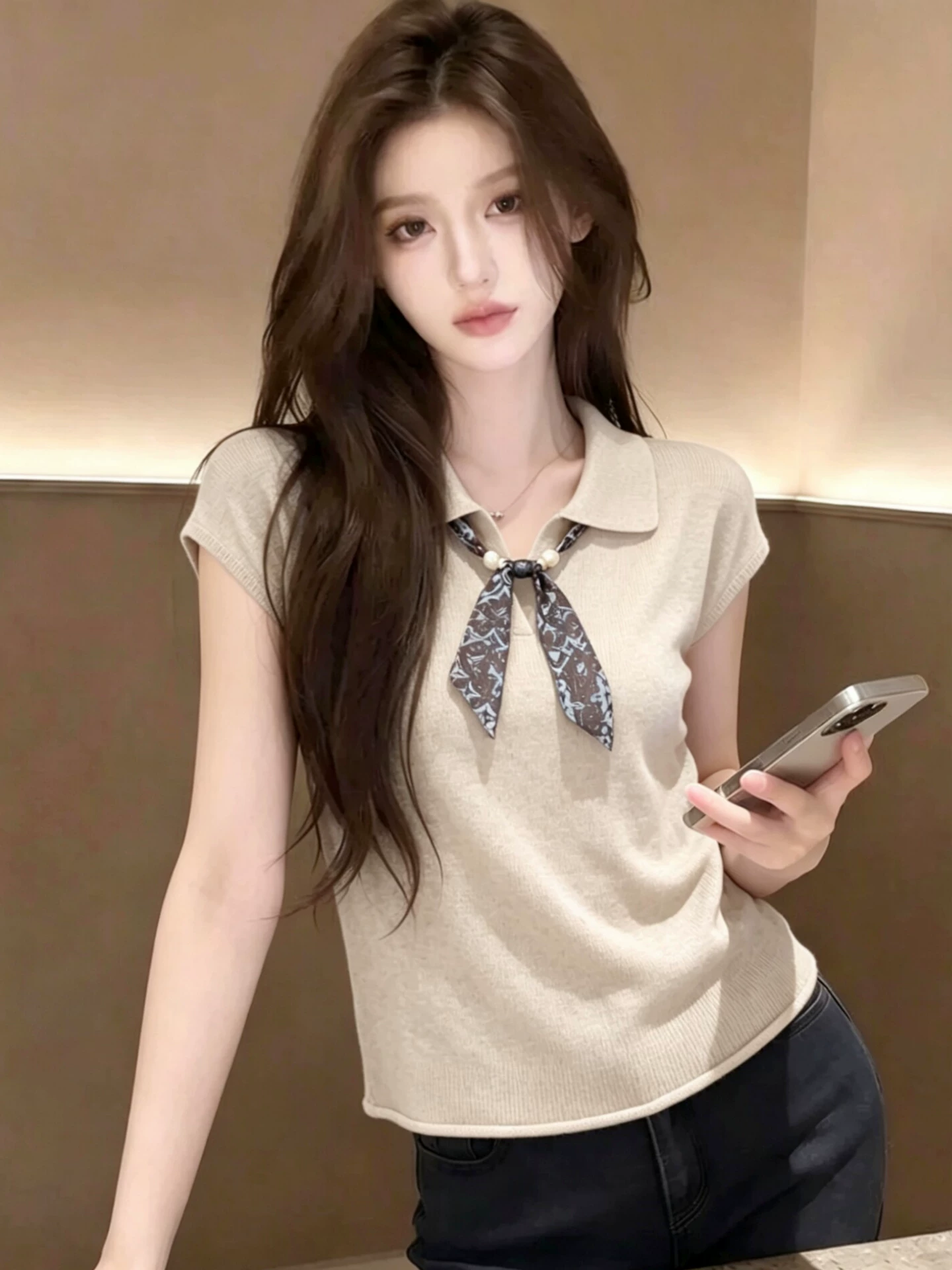 베이지 색 민소매 니트 조끼 여성 여름 얇은 스타일 블라우스 2026 새로운 맨위