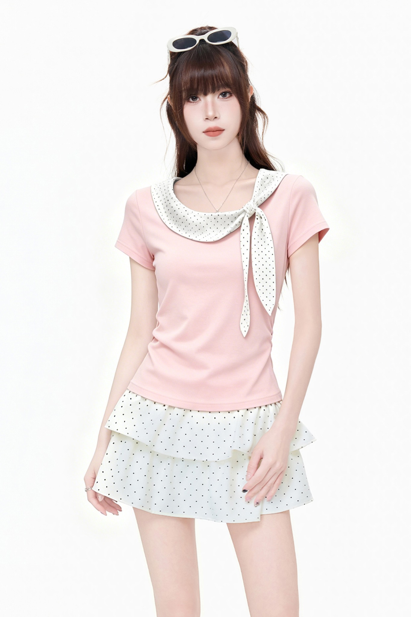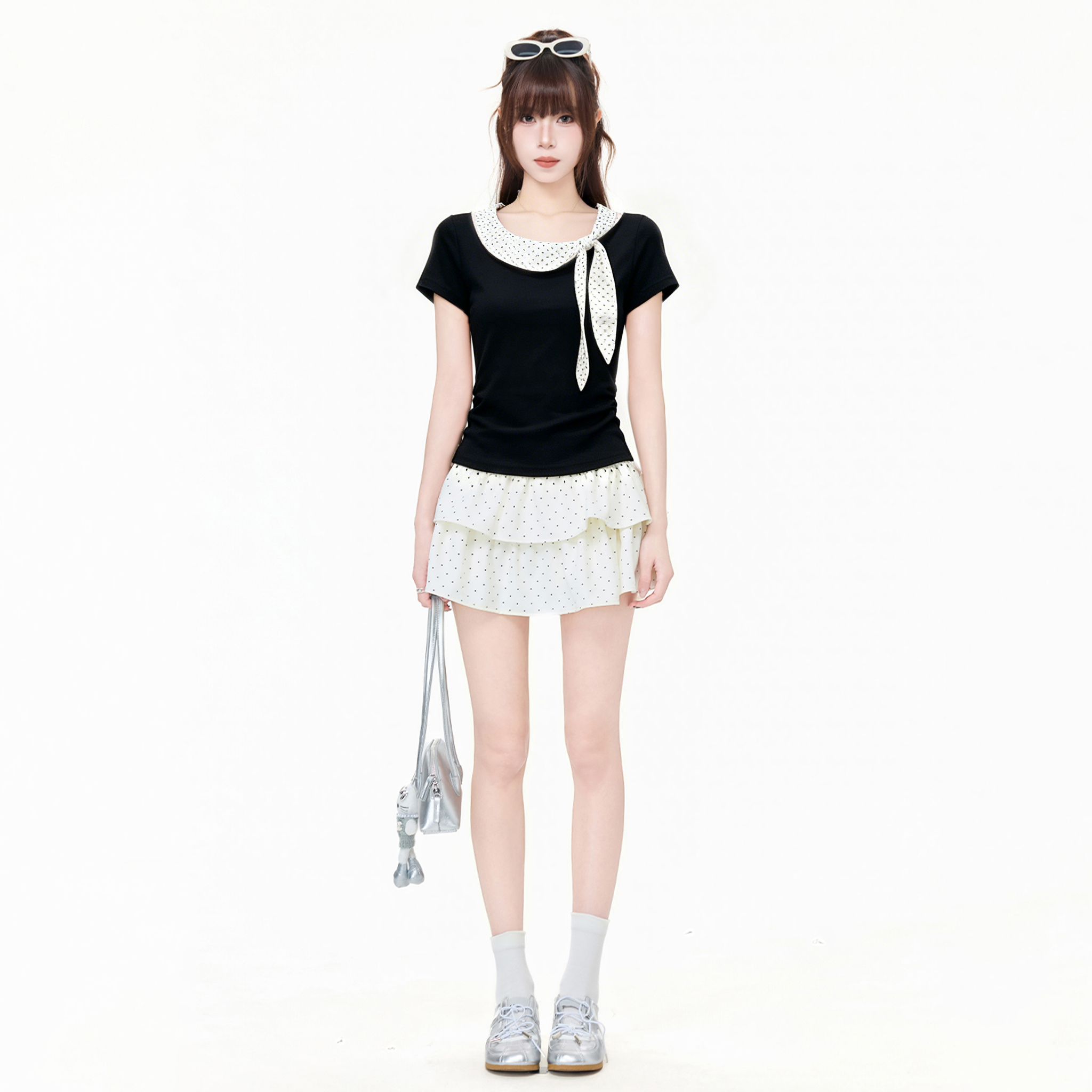 실사 정가 도트 무늬 자수 패치워크 페이크 레이어드 반팔 티셔츠 여성 2026 여름 나비 매듭 캐주얼 다용도 맨위