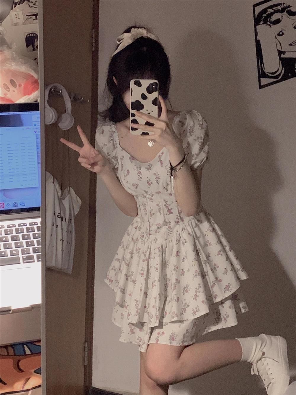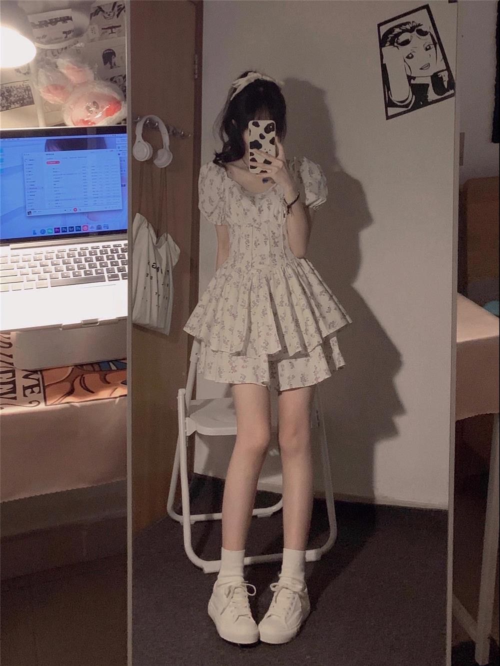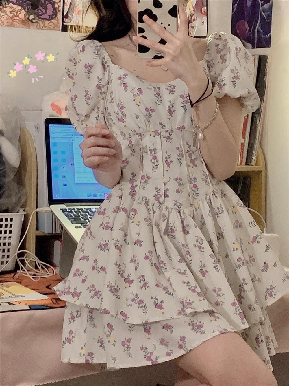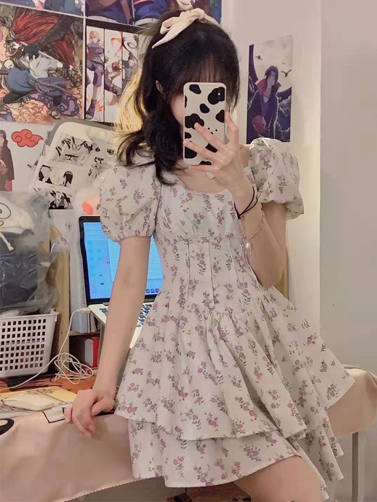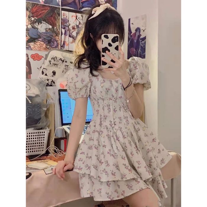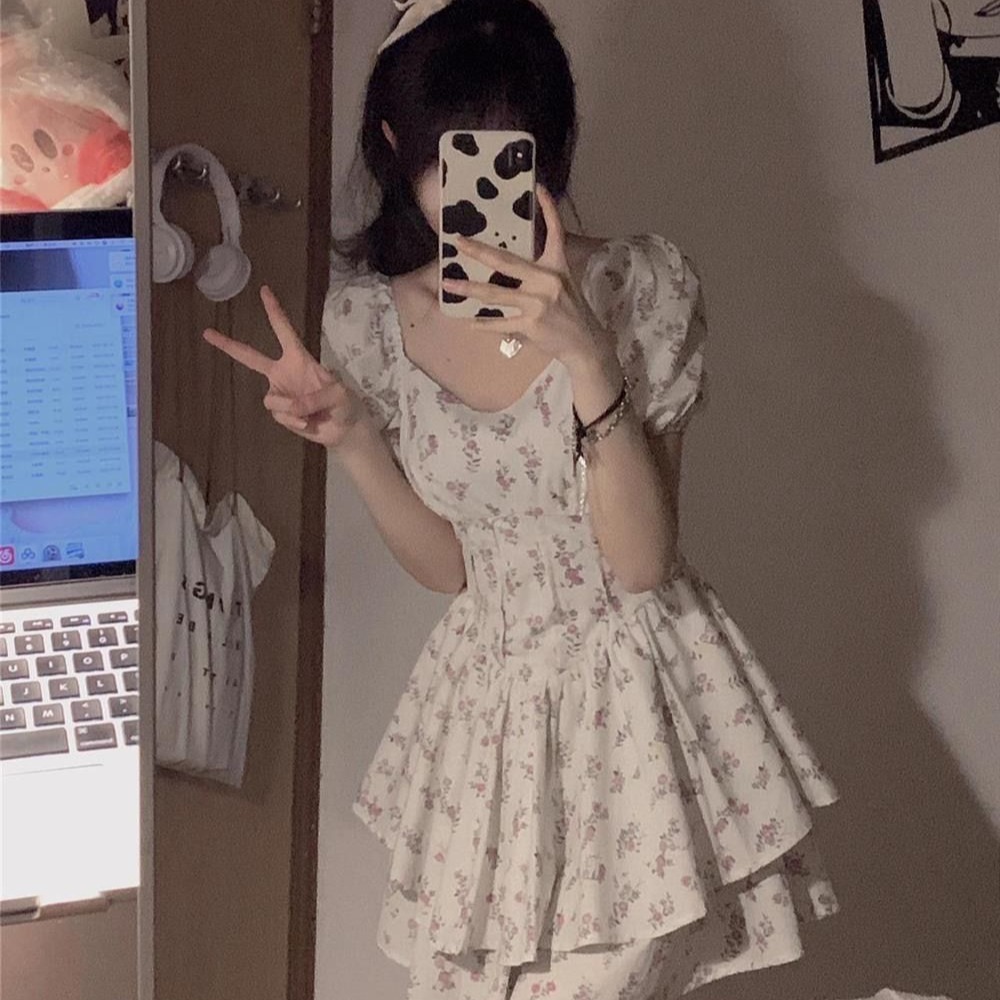 부드러운 바람 광장 칼라 거품 소매 꽃무늬 여성 드레스 여름 2026 년 새로운 달콤한 매운맛 미니 스커트 퍼프 스커트 치마