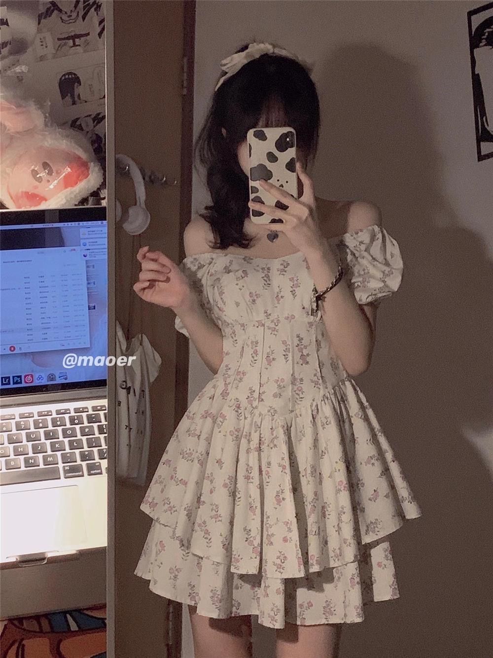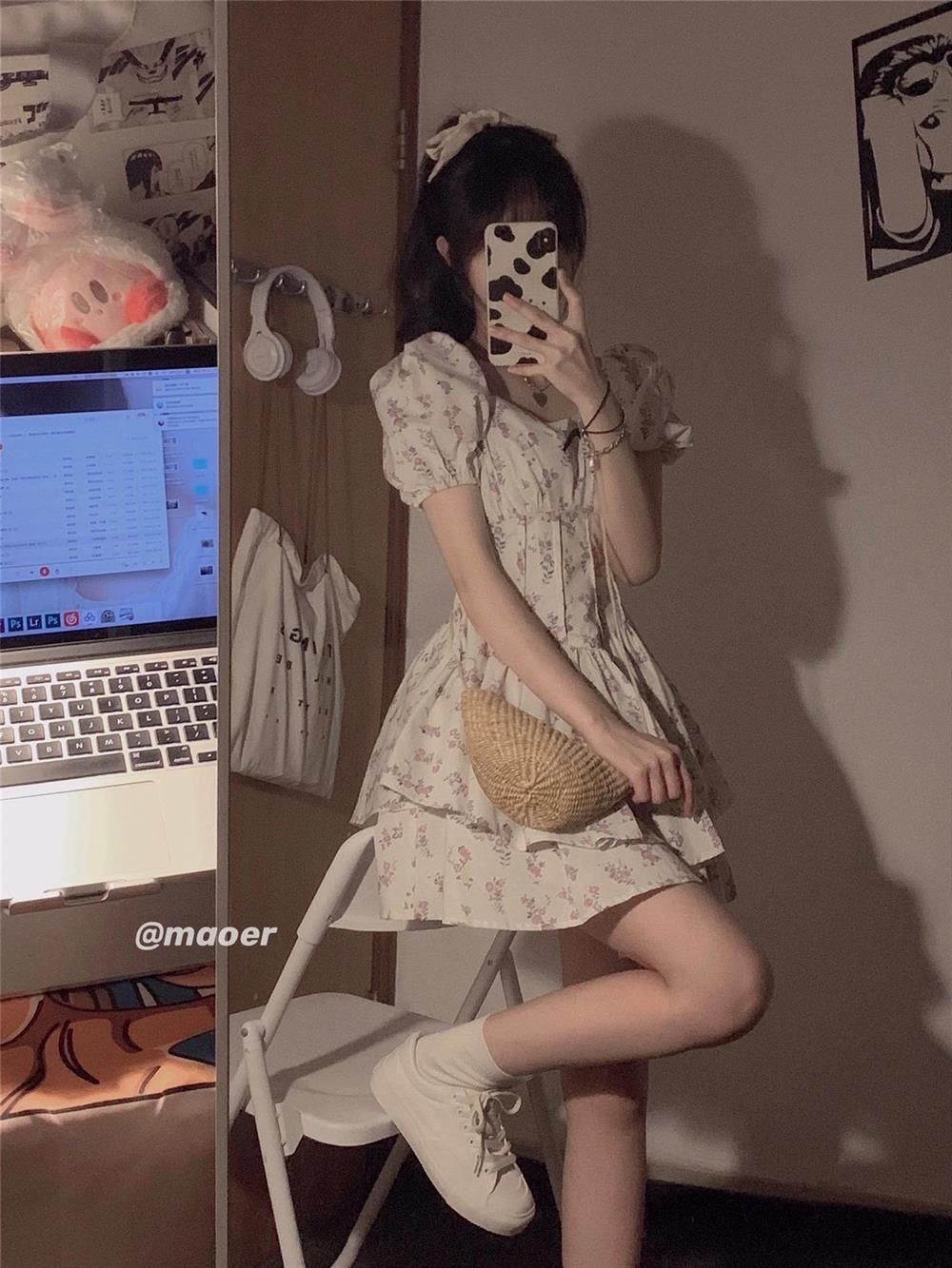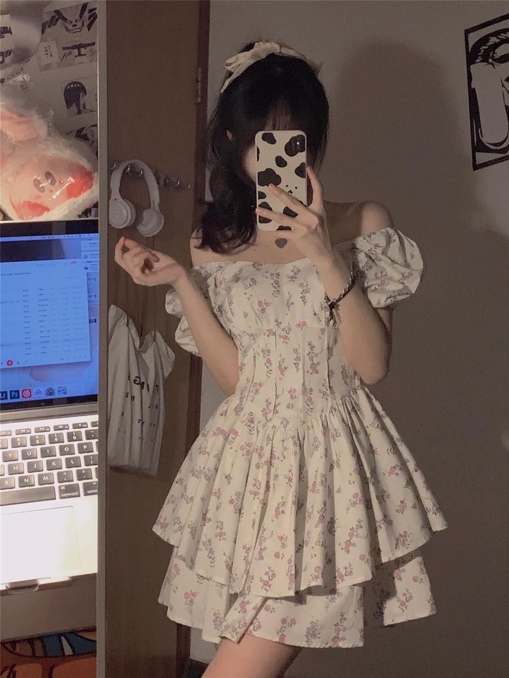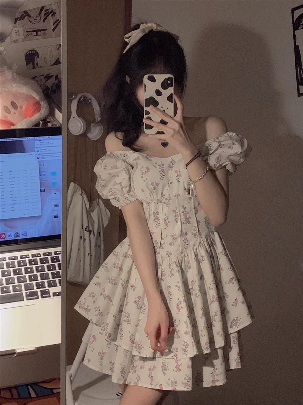 부드러운 바람 광장 칼라 거품 소매 꽃무늬 여성 드레스 여름 2026 년 새로운 달콤한 매운맛 미니 스커트 퍼프 스커트 치마