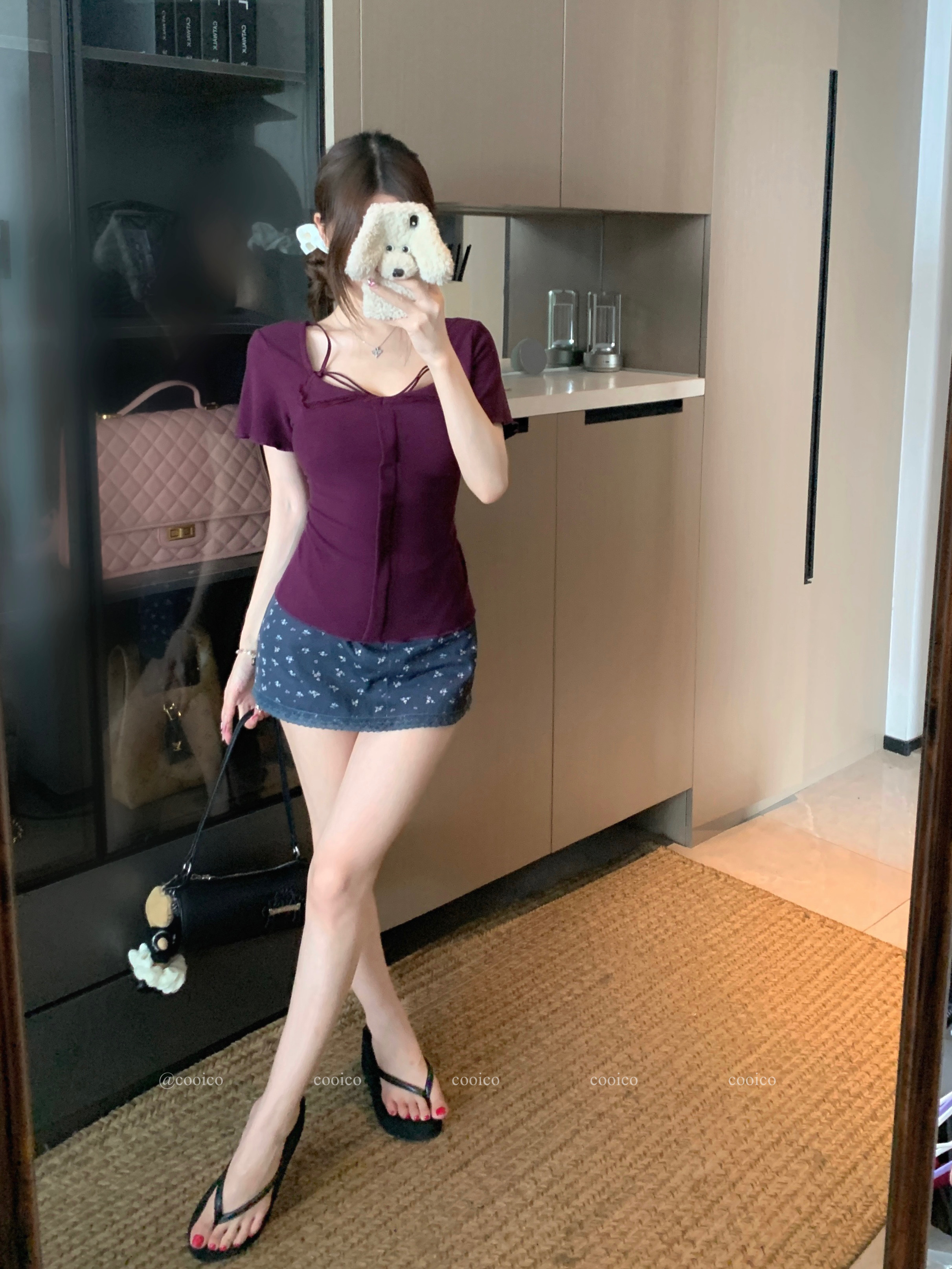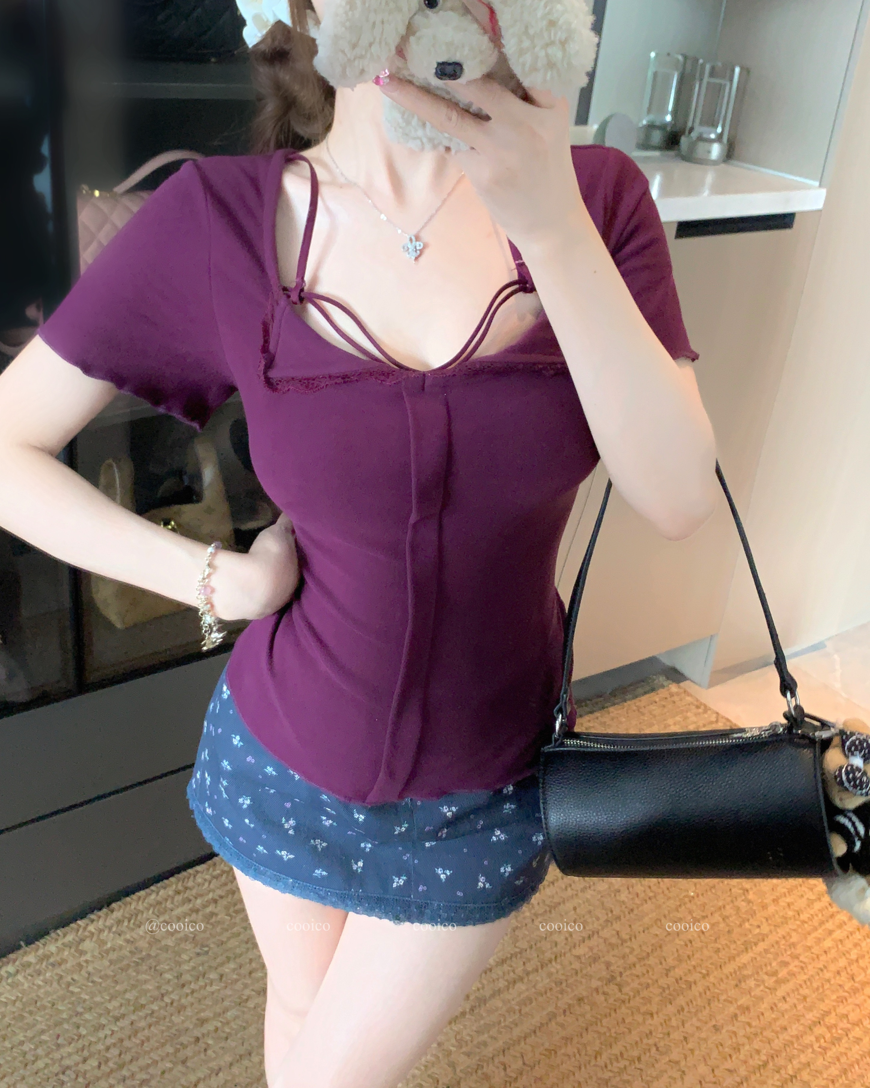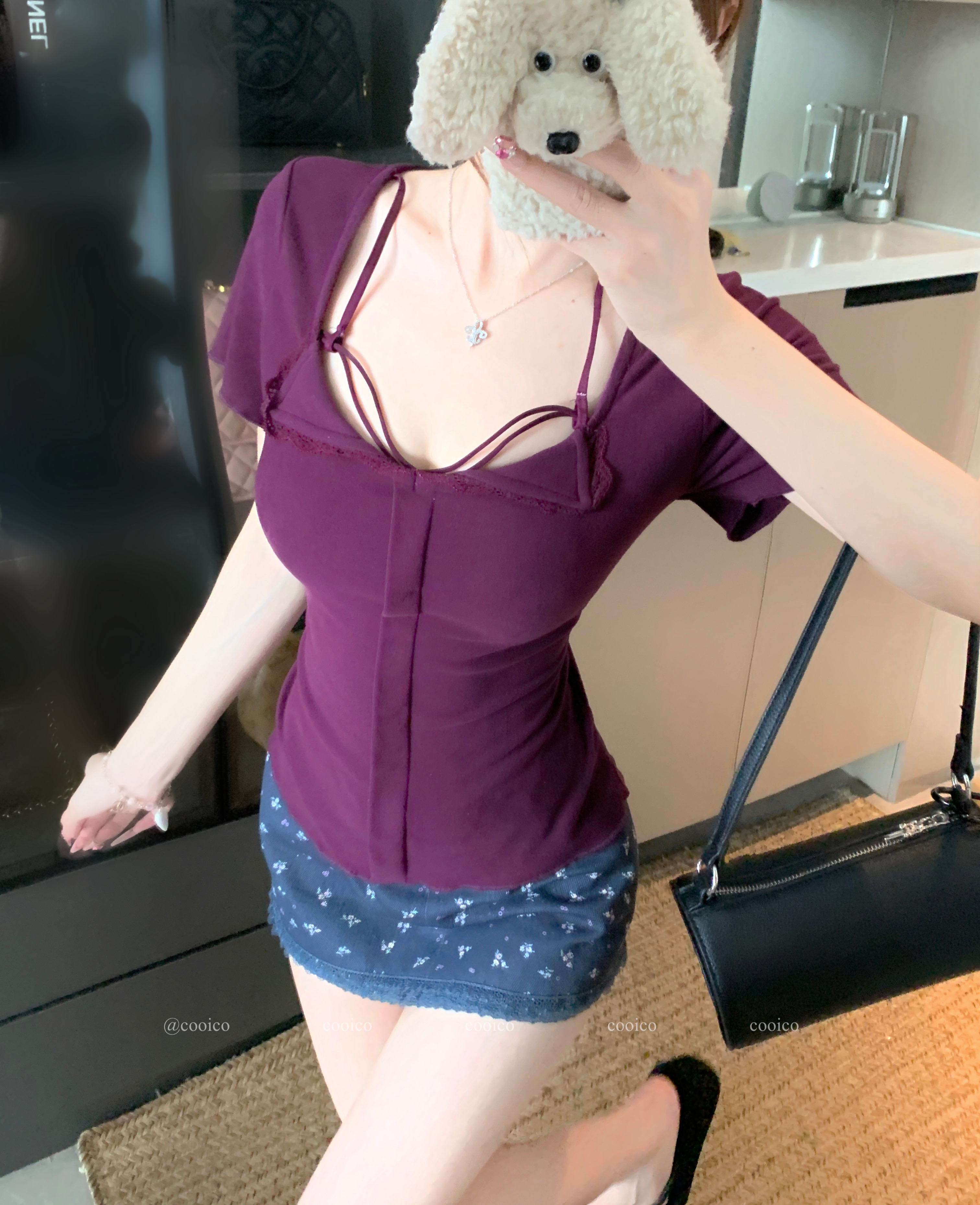 실사 빅 사이즈 아메리칸 레트로 핫걸 레이스 조각 비스듬한 어깨 반팔 티셔츠 여성 순수한 욕망 허리 수축 여름 작은 맨위