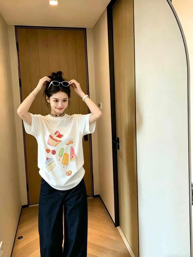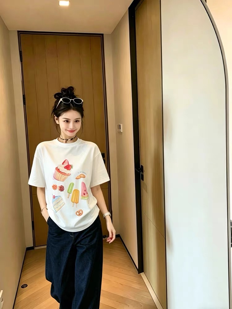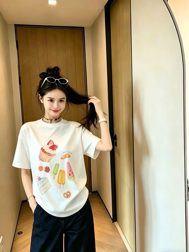 220 그램 순면 프린트 반팔 티셔츠 여성 2026 년 봄 여름 드레스 반팔 티셔츠 여성 한국 스타일 프린트