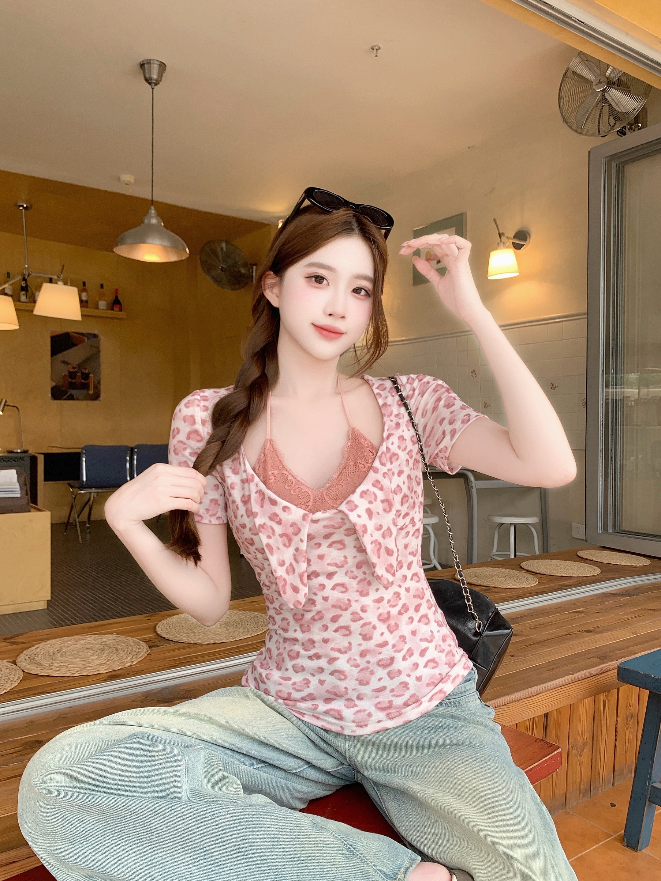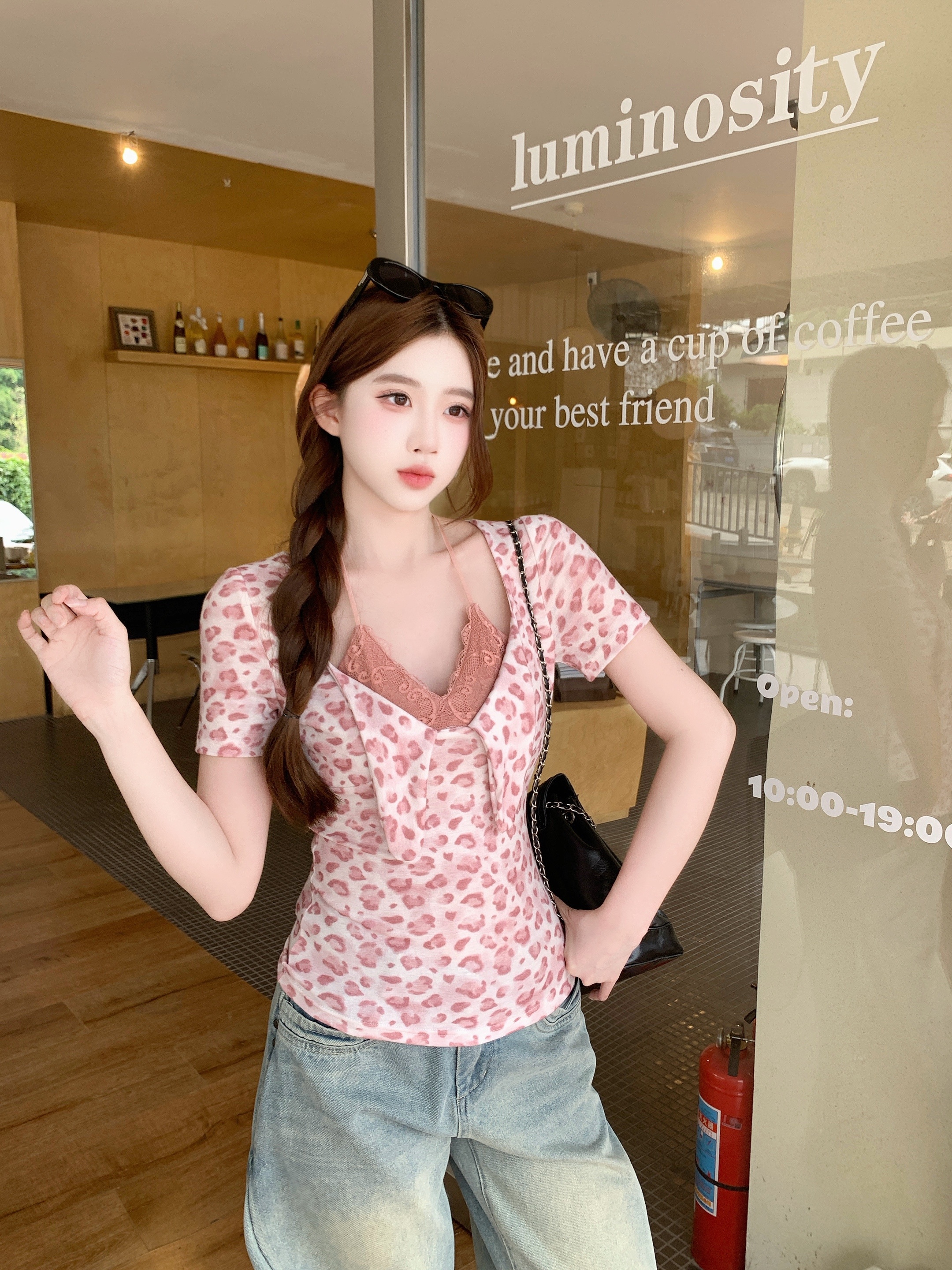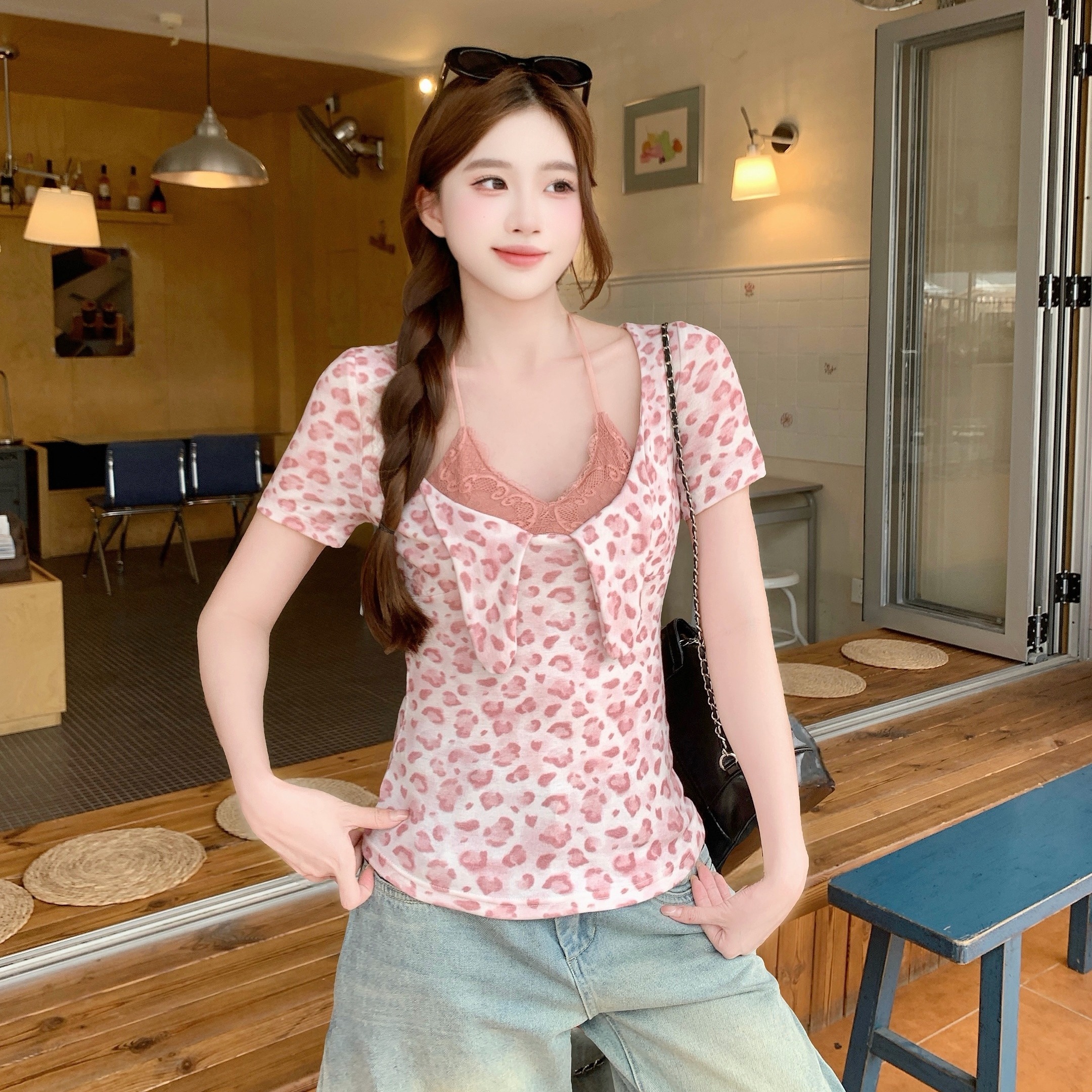 실사 빅 사이즈 아메리칸 레트로 핫걸 레이스 조각 비스듬한 어깨 반팔 티셔츠 여성 순수한 욕망 허리 수축 여름 작은 맨위