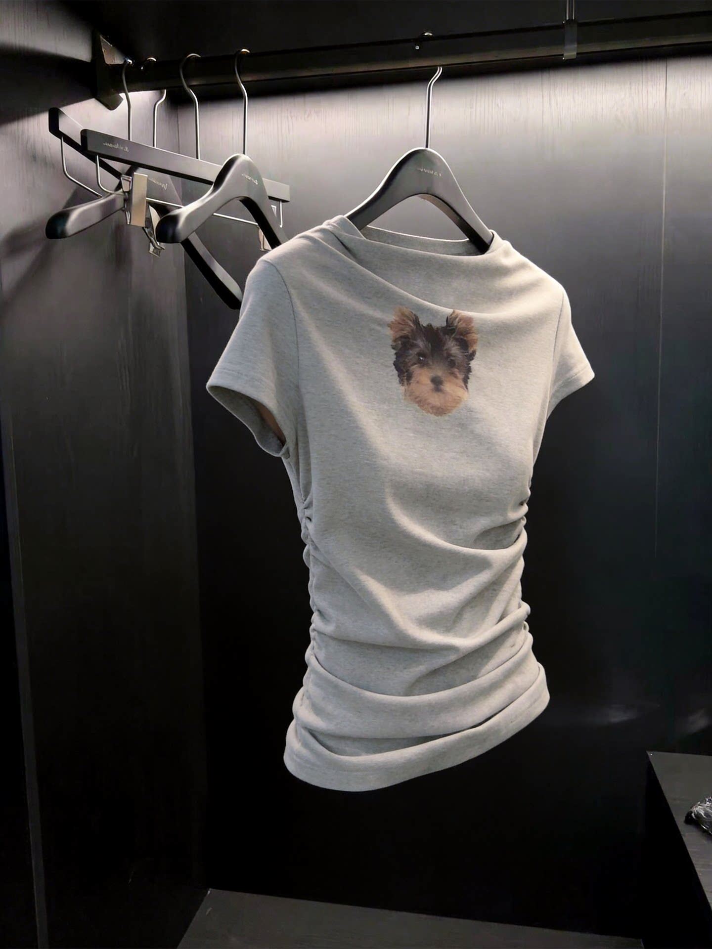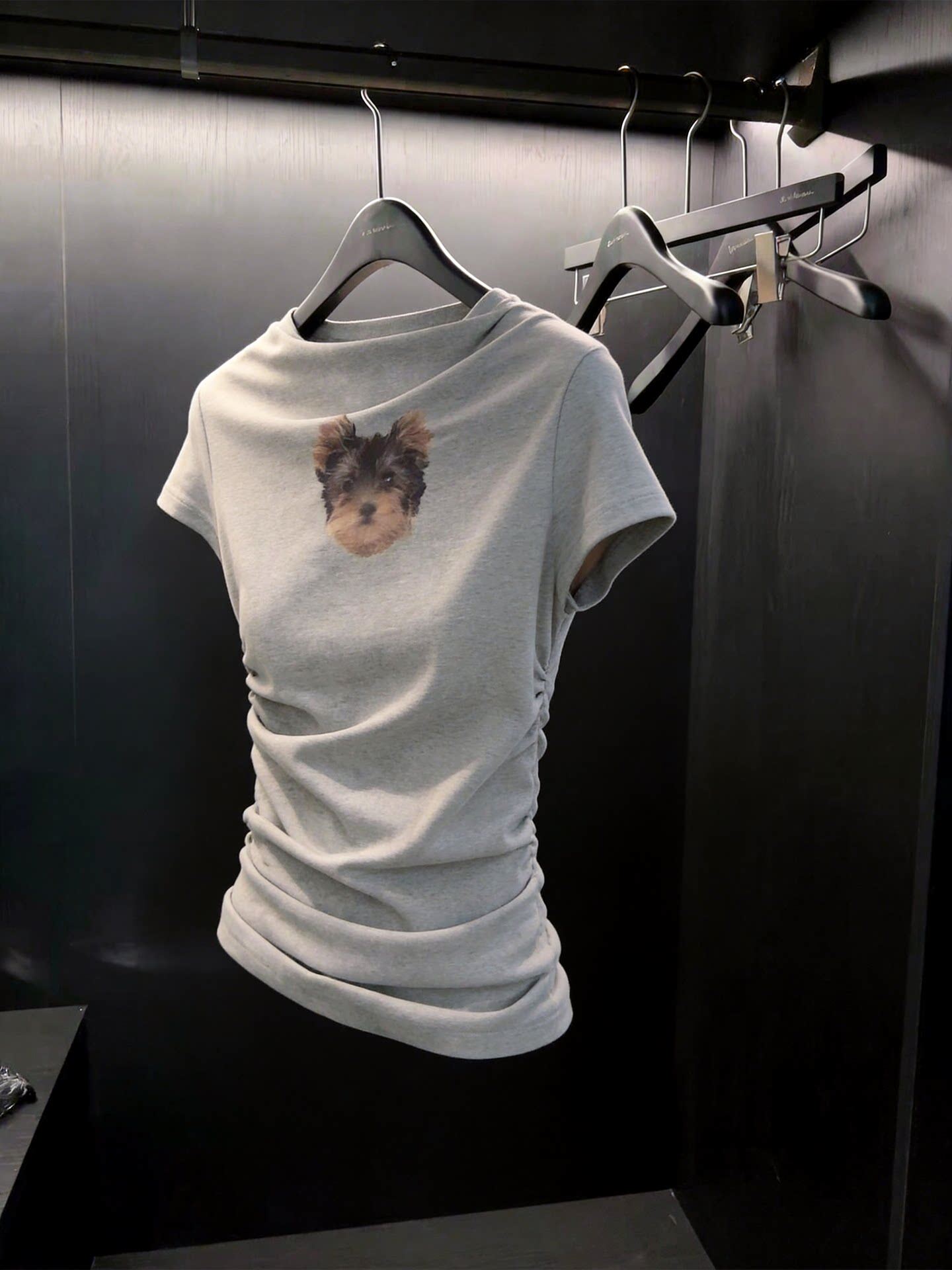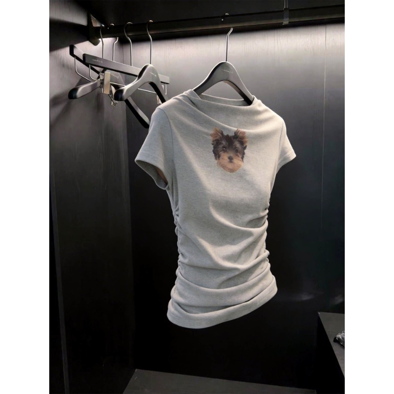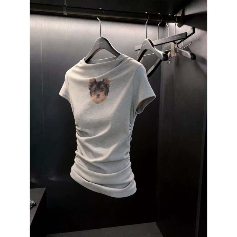 프랑스식 고급 센스 작은 대중 프린트 주름 반팔 티셔츠 여성 여름 새로운 Chic 몸매 가꾸기 슬림해 보이는 디자인 센스 맨위