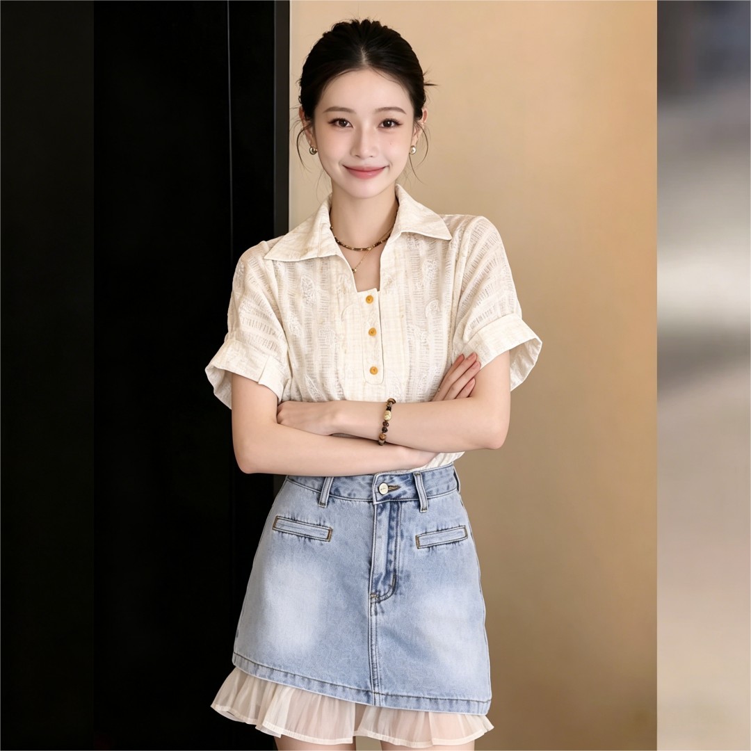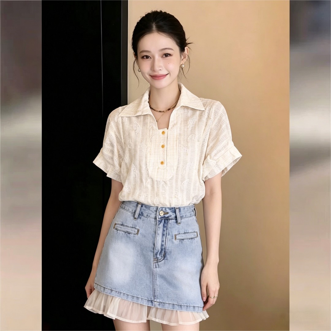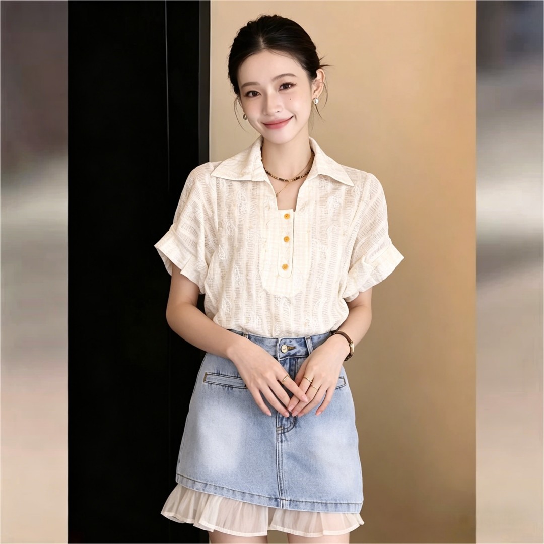 실사 프랑스식 패션 통기성 얇고 가벼운 자카드 POLO 칼라 반팔 여성 셔츠 2026 여름 다용도 맨위