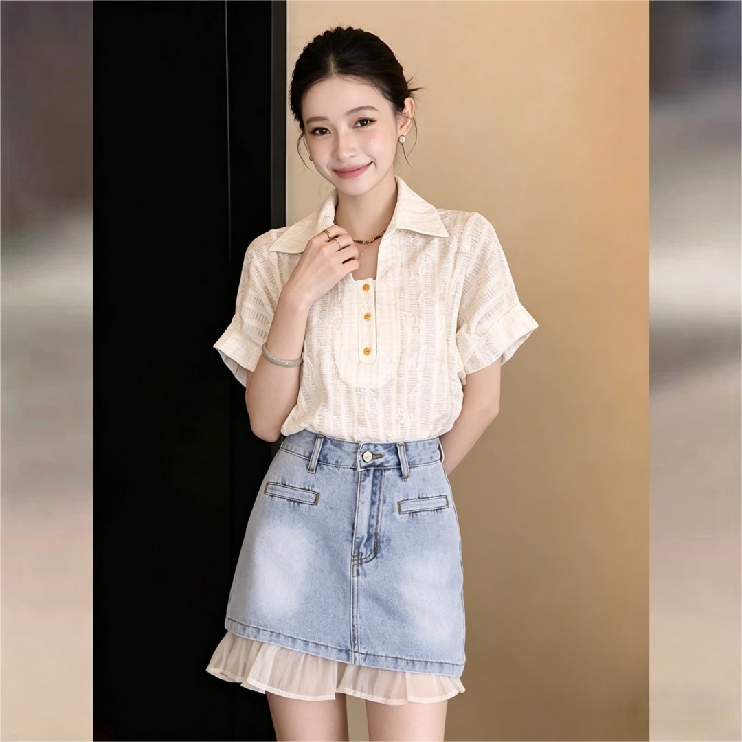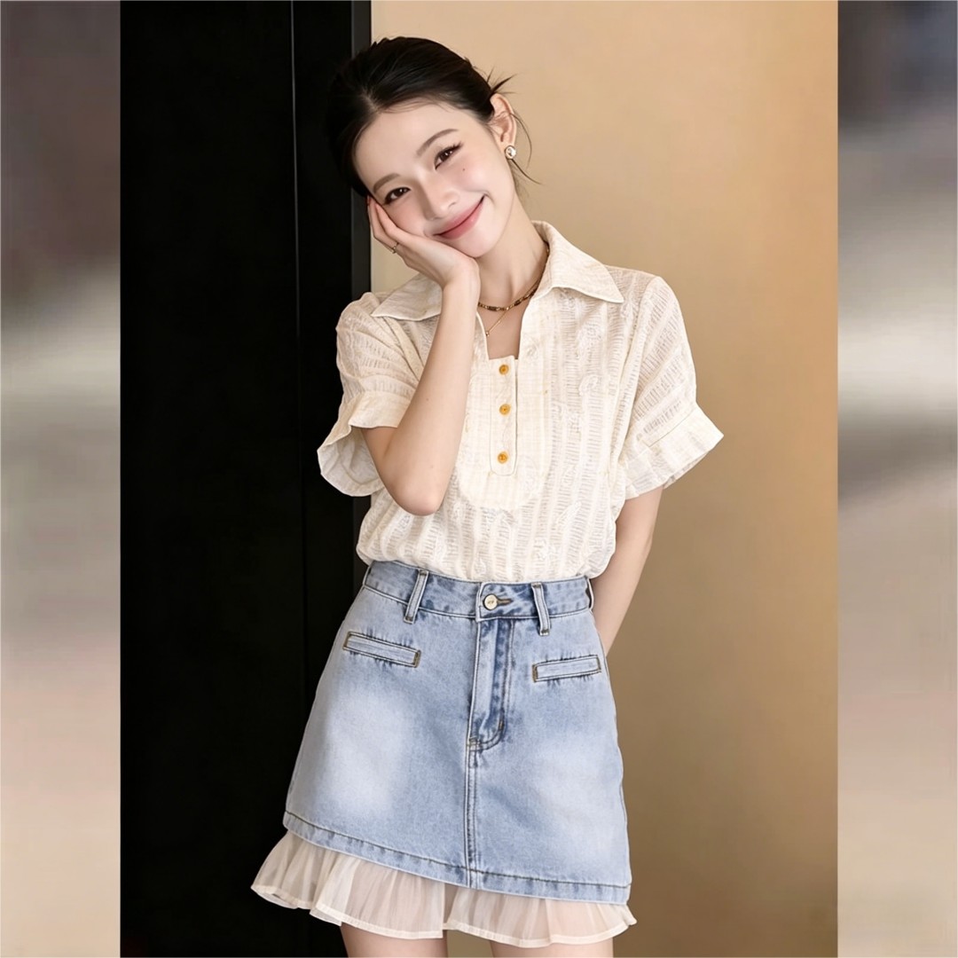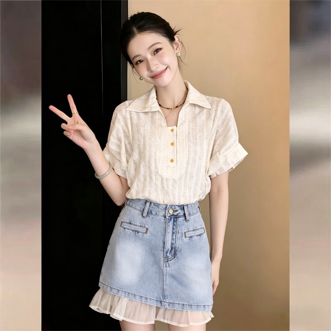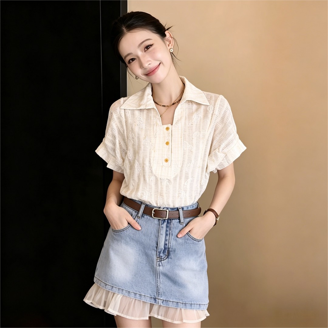 실사 프랑스식 패션 통기성 얇고 가벼운 자카드 POLO 칼라 반팔 여성 셔츠 2026 여름 다용도 맨위