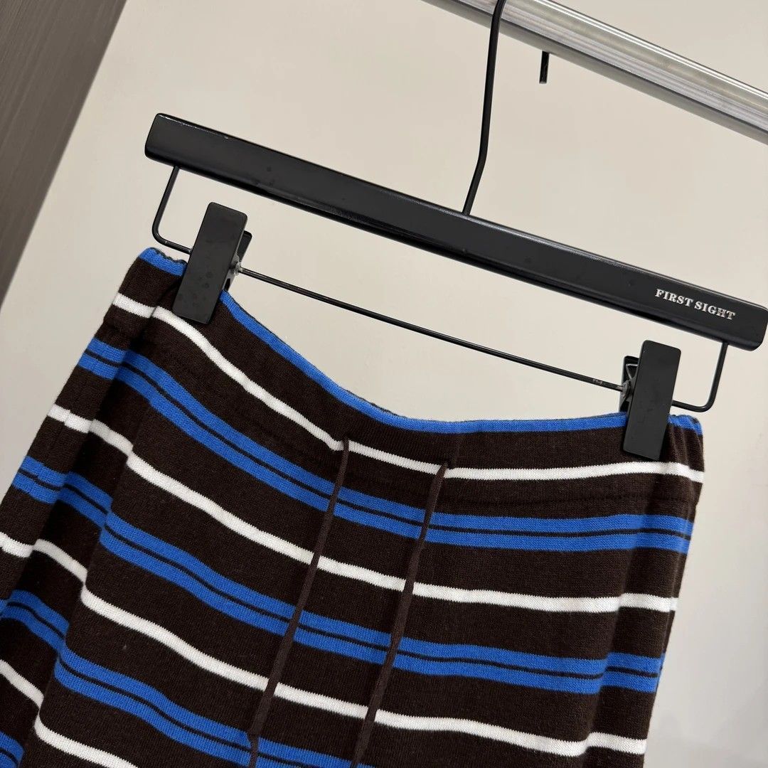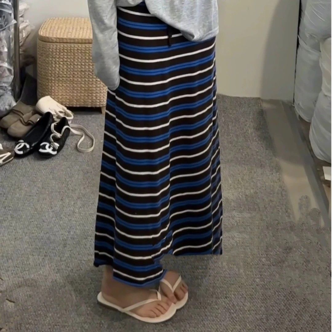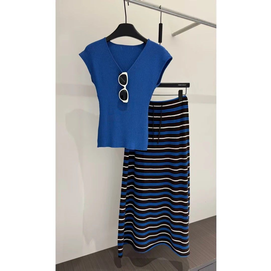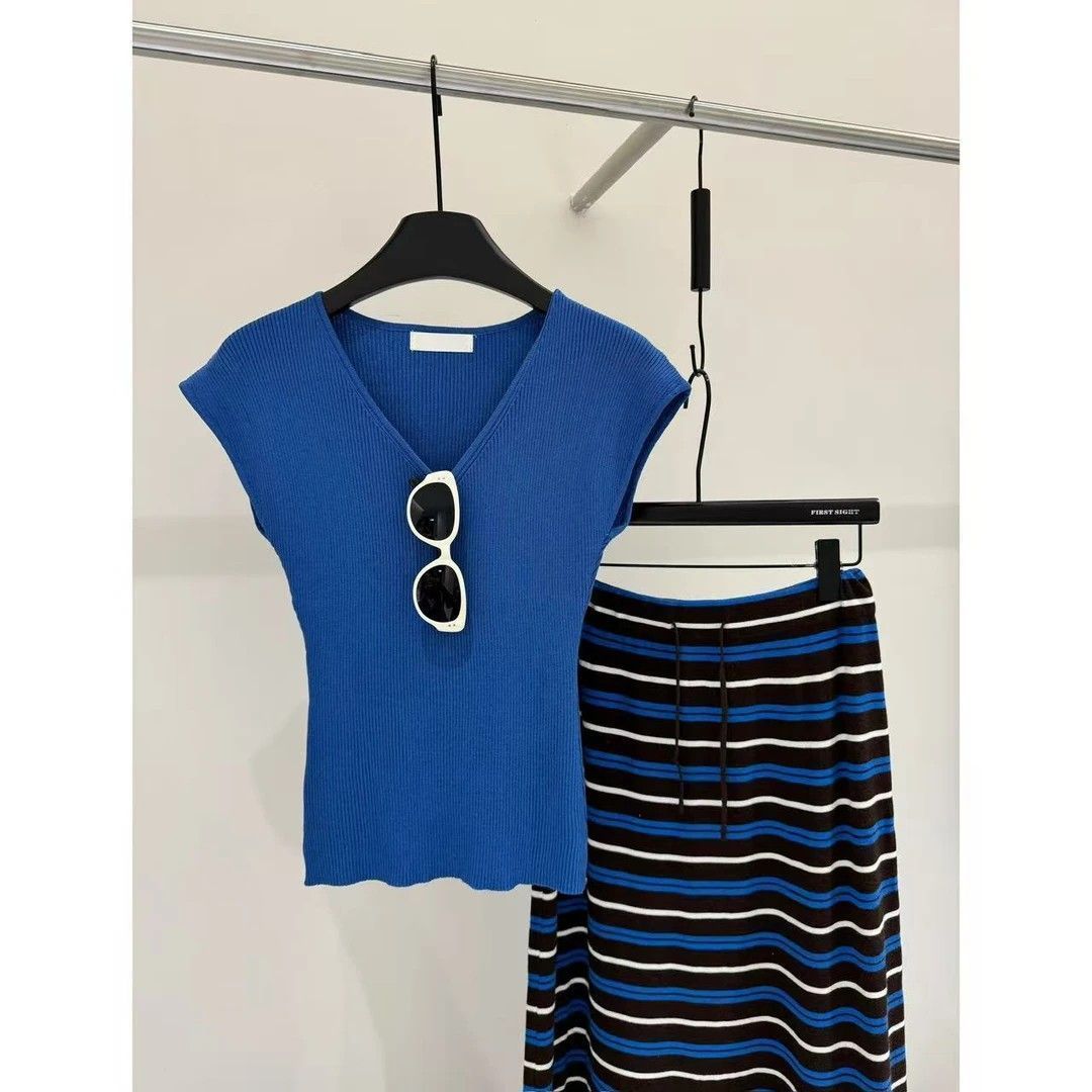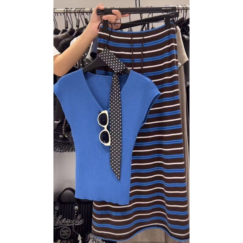 V넥 반팔 몸매 가꾸기 슬림해 보이는 여성 뜨개질 맨위 느긋한 바람 스트라이프 다용도 반신 롱 스커트 여성