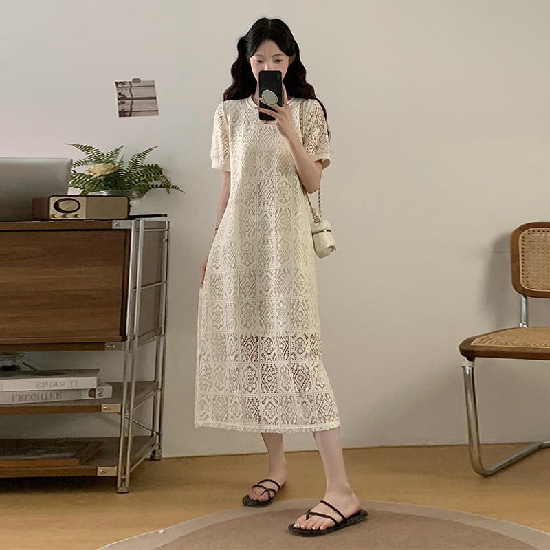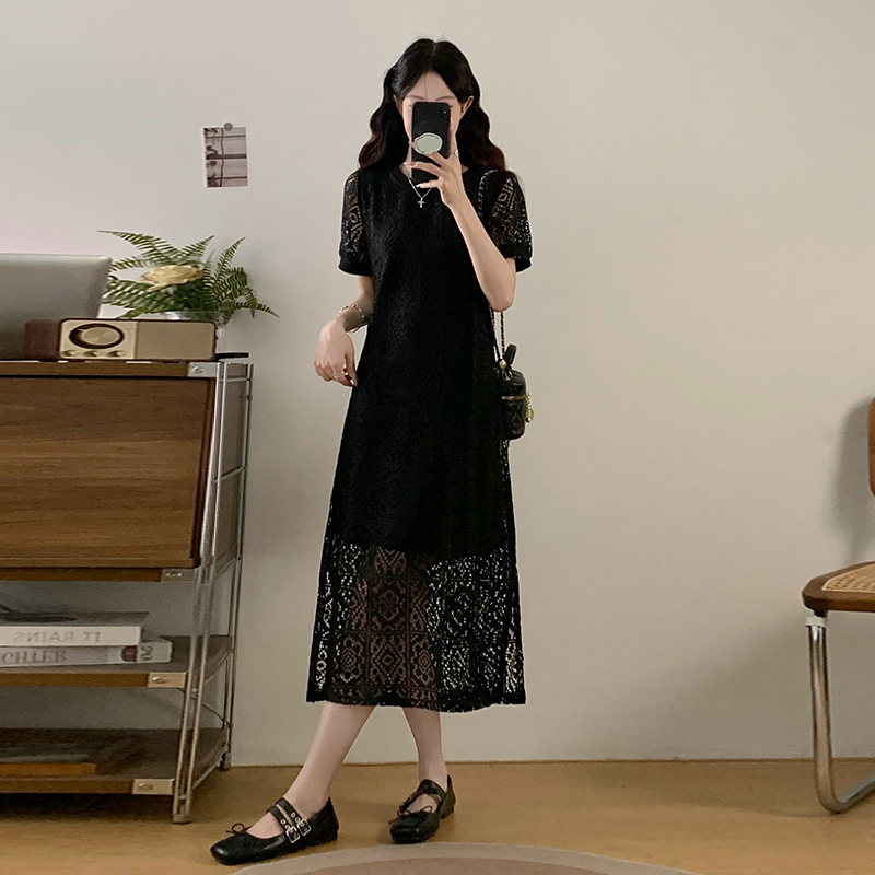 실사 레이스 레이스 드레스 미니멀리즘 패션 표지 고기 슬림해 보이는 하나 여름 중간 길이 빅 사이즈 치마