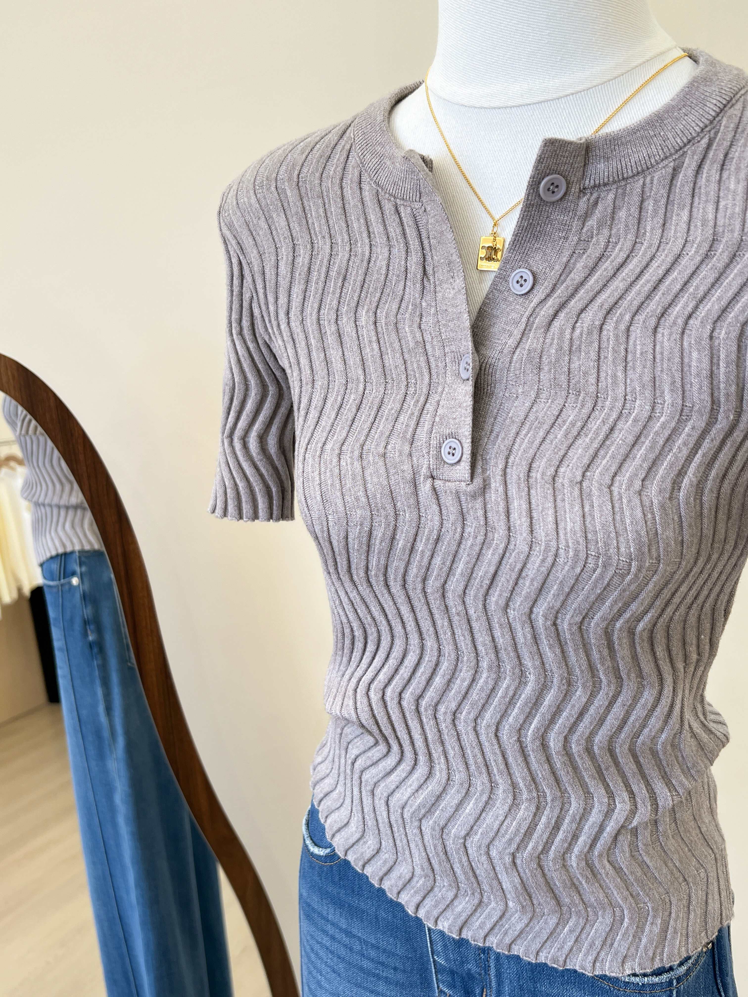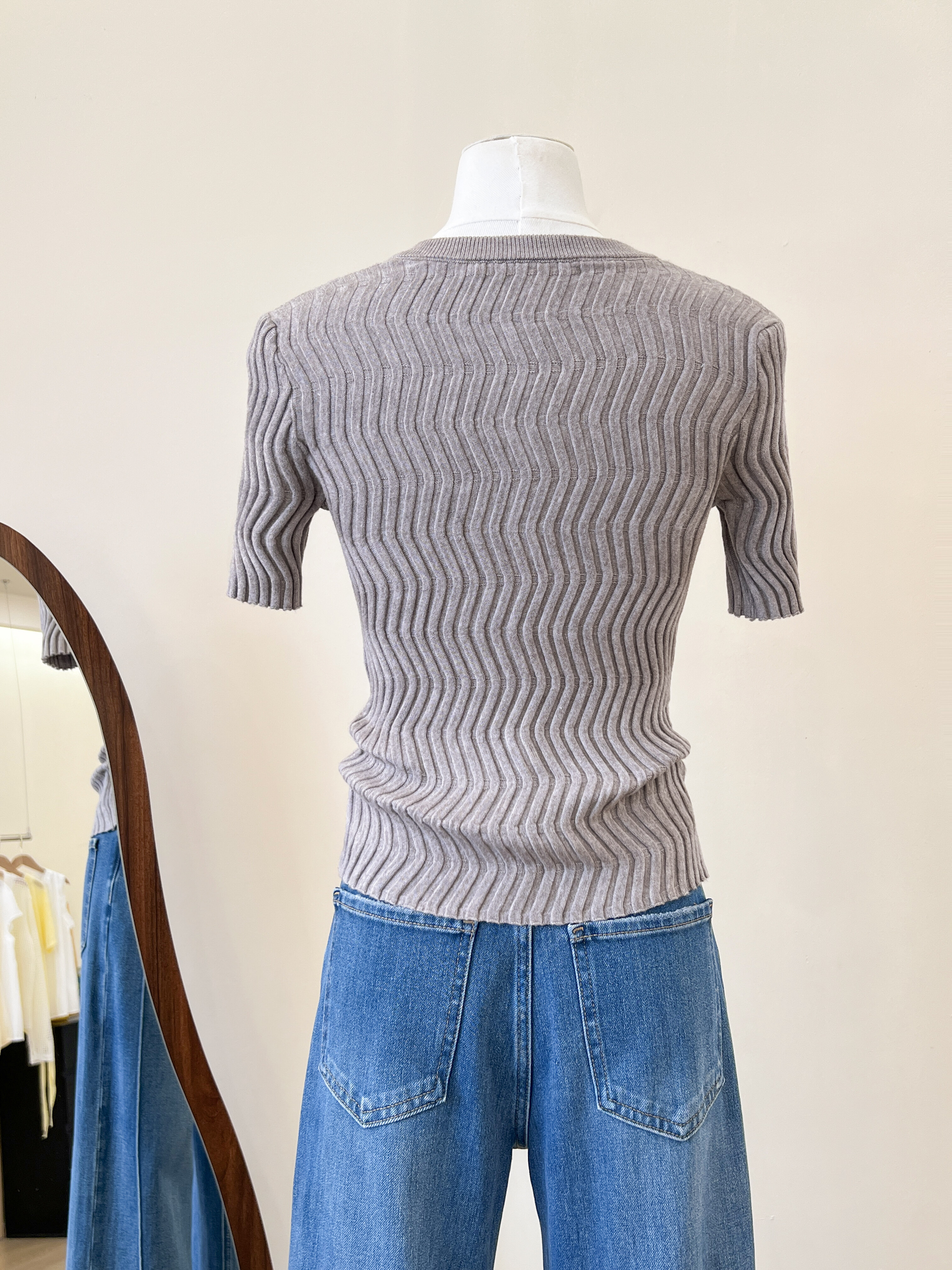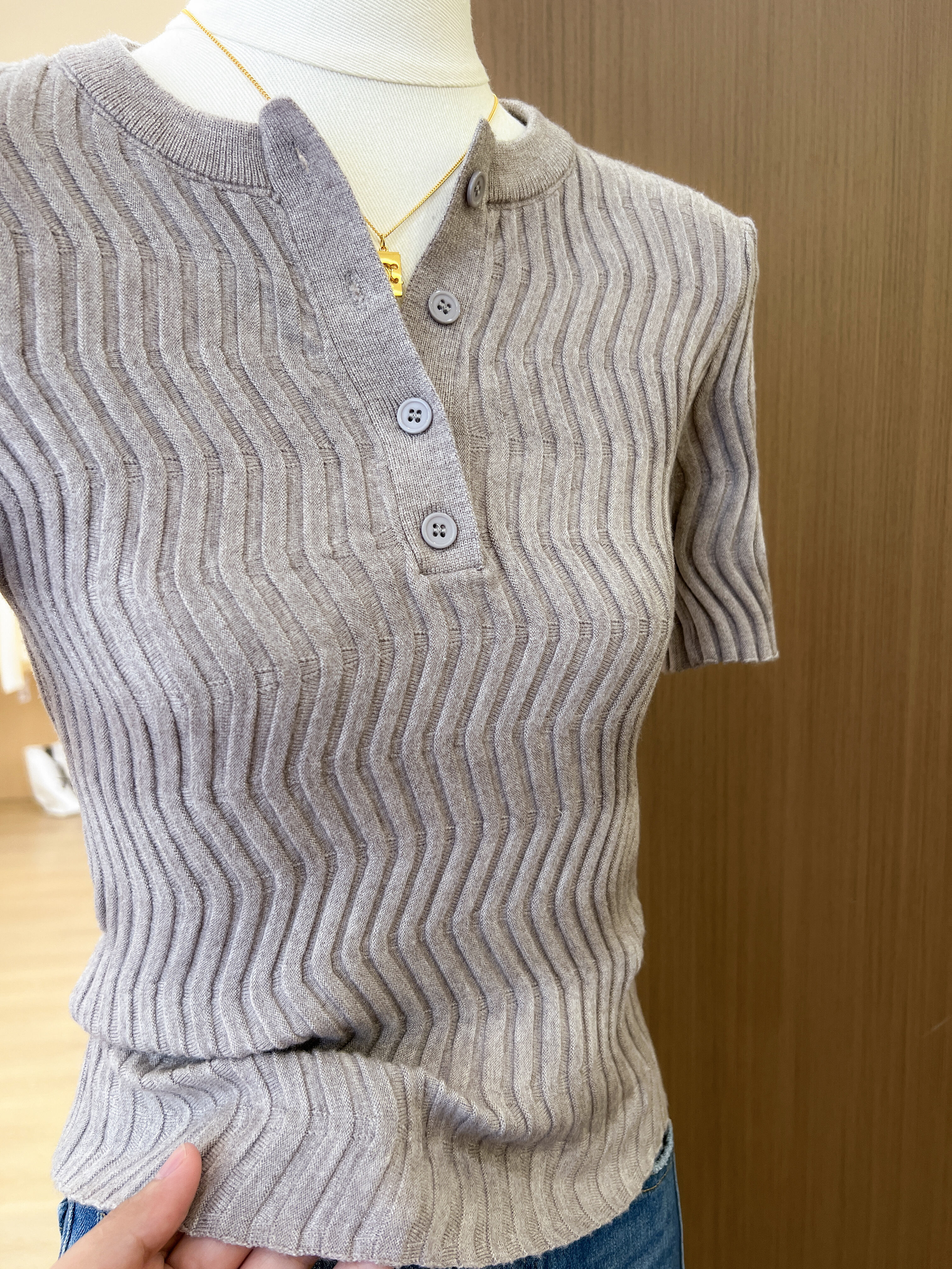 실사 오래된 돈 바람 회색 V넥 구덩이 기사 니트 반팔 티셔츠 여성 여름 고급 센스 몸매 가꾸기 긍정적 인 어깨 의류