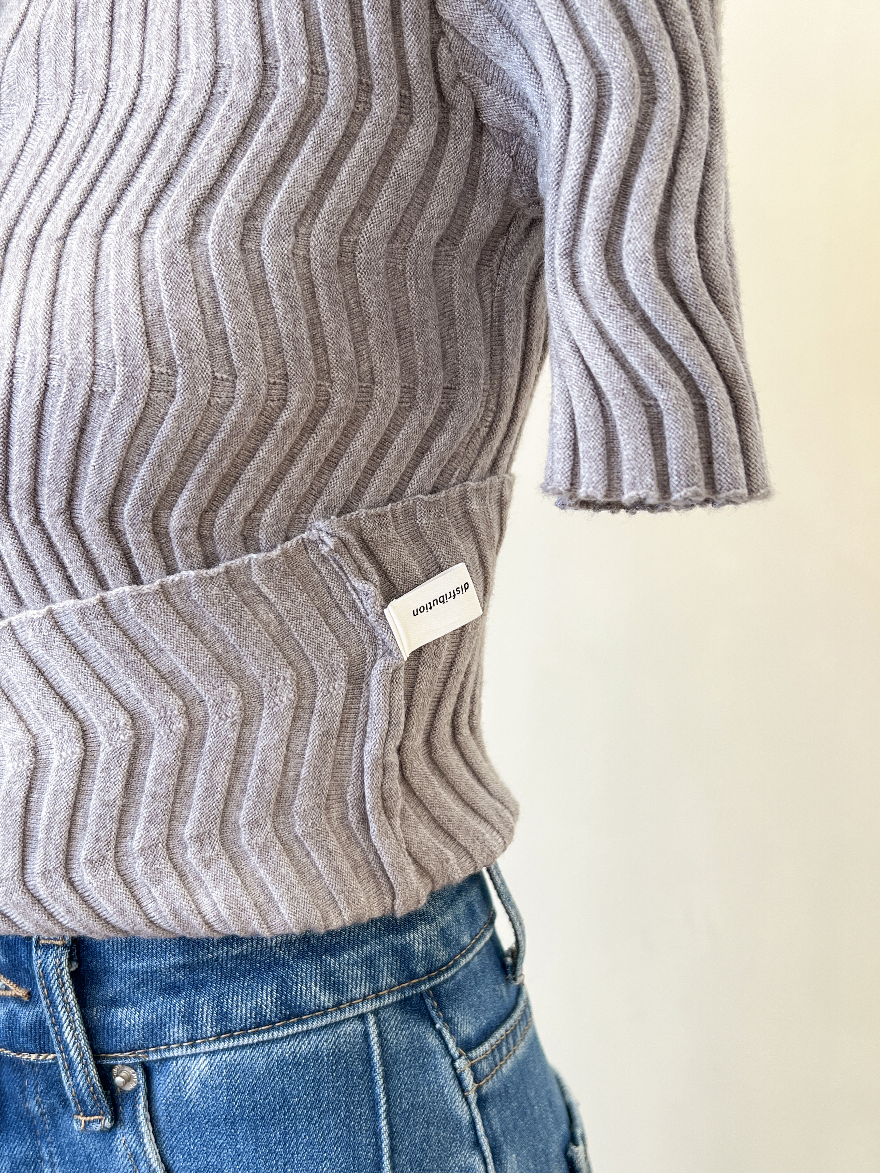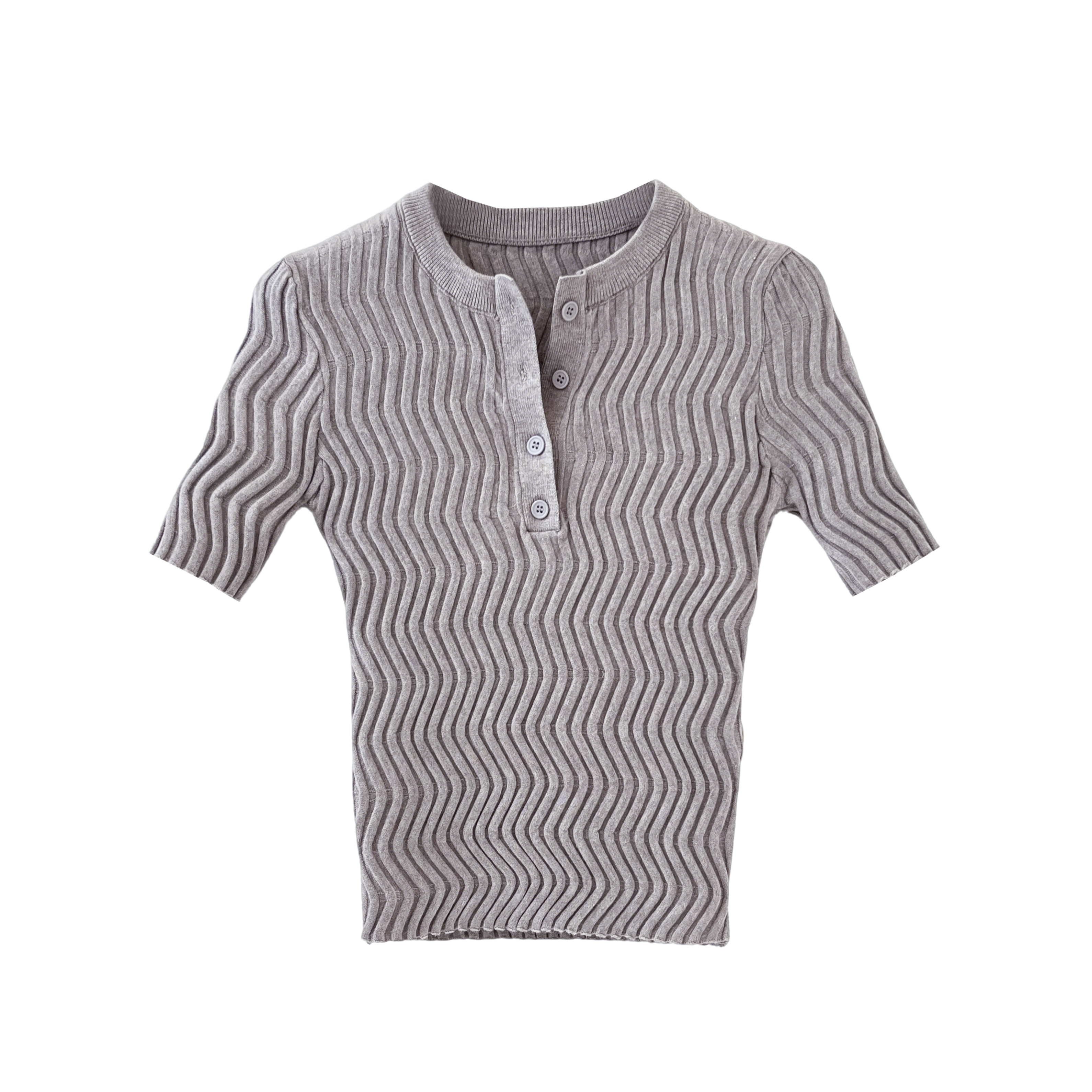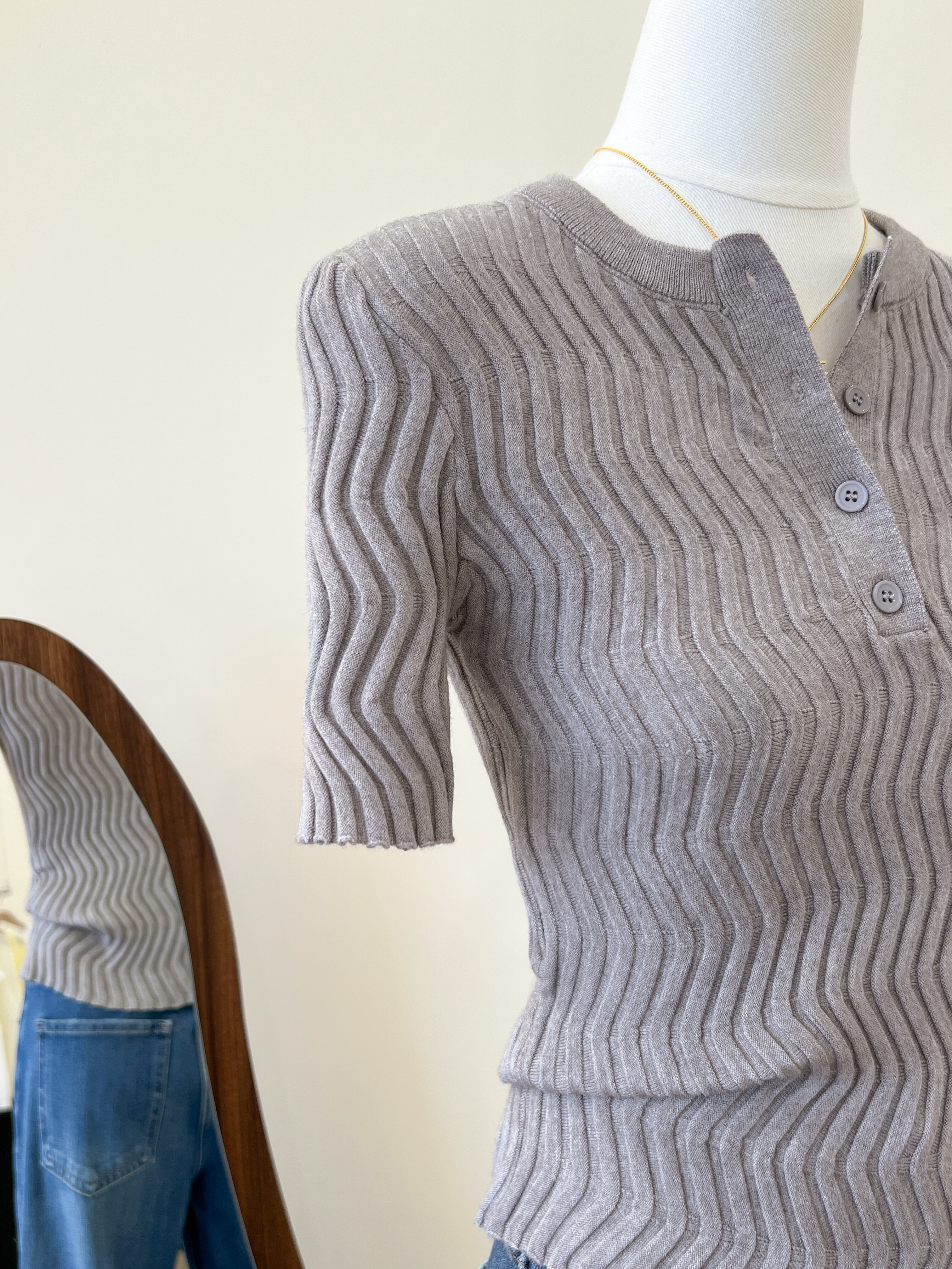 실사 오래된 돈 바람 회색 V넥 구덩이 기사 니트 반팔 티셔츠 여성 여름 고급 센스 몸매 가꾸기 긍정적 인 어깨 의류