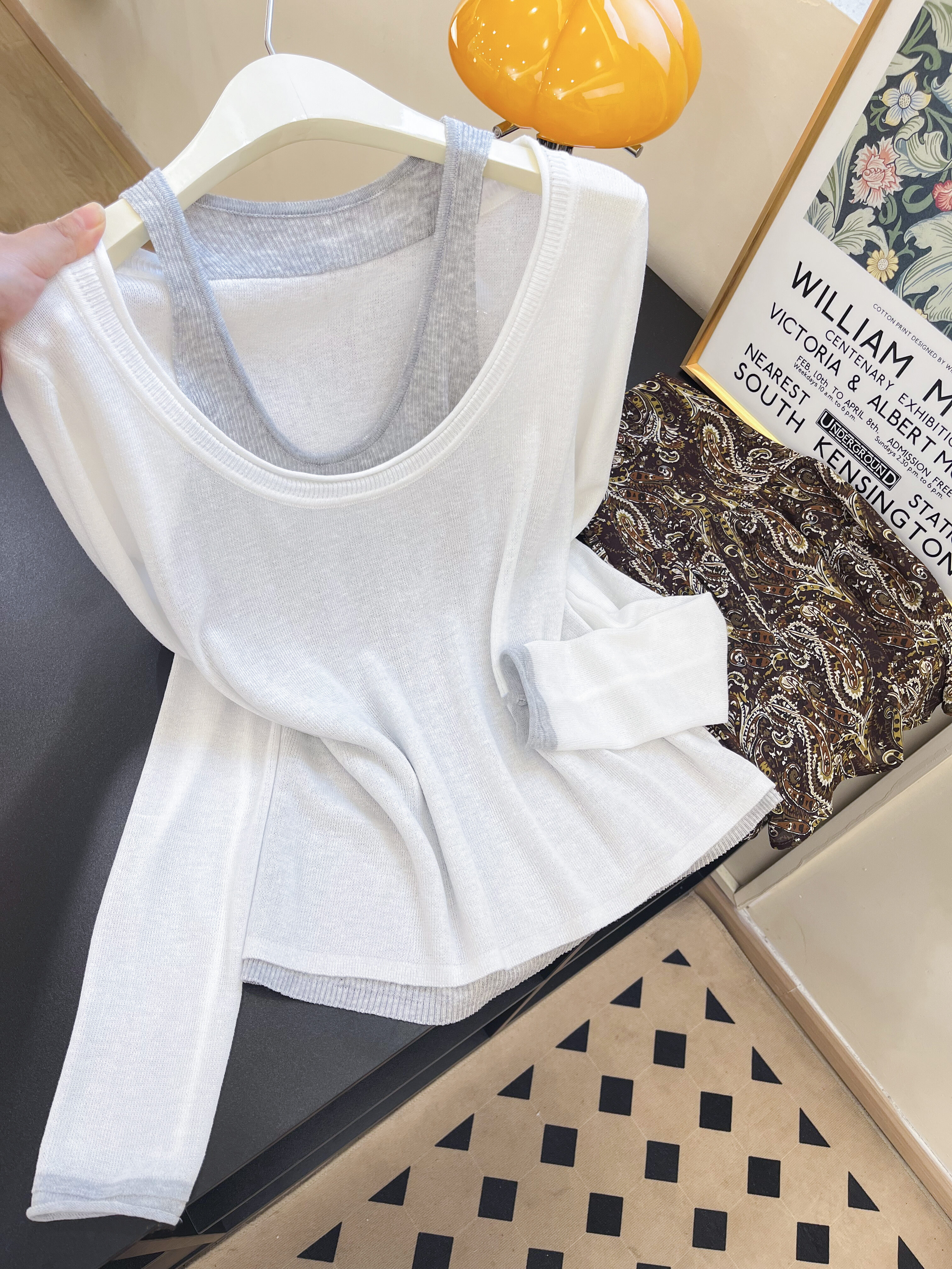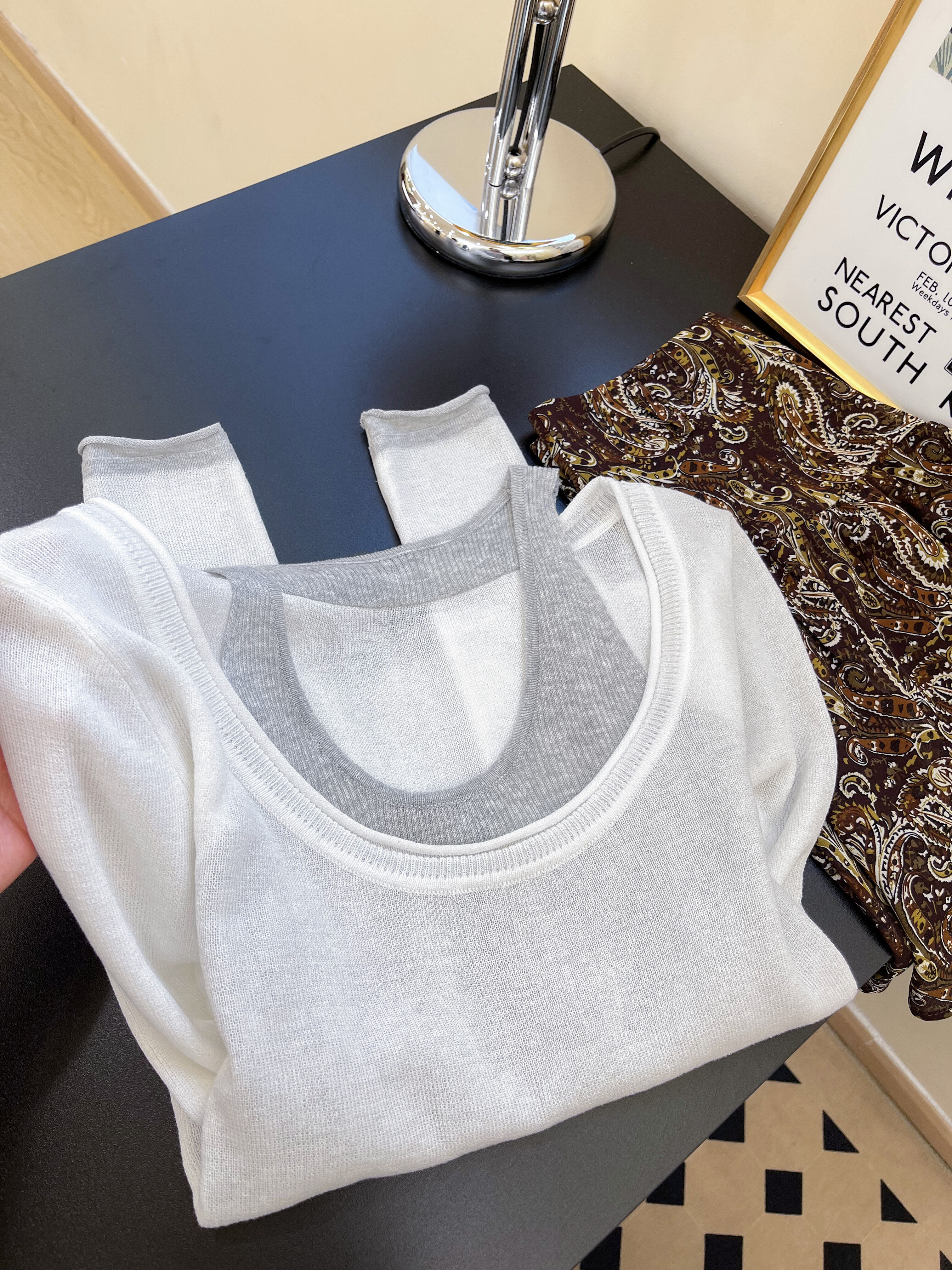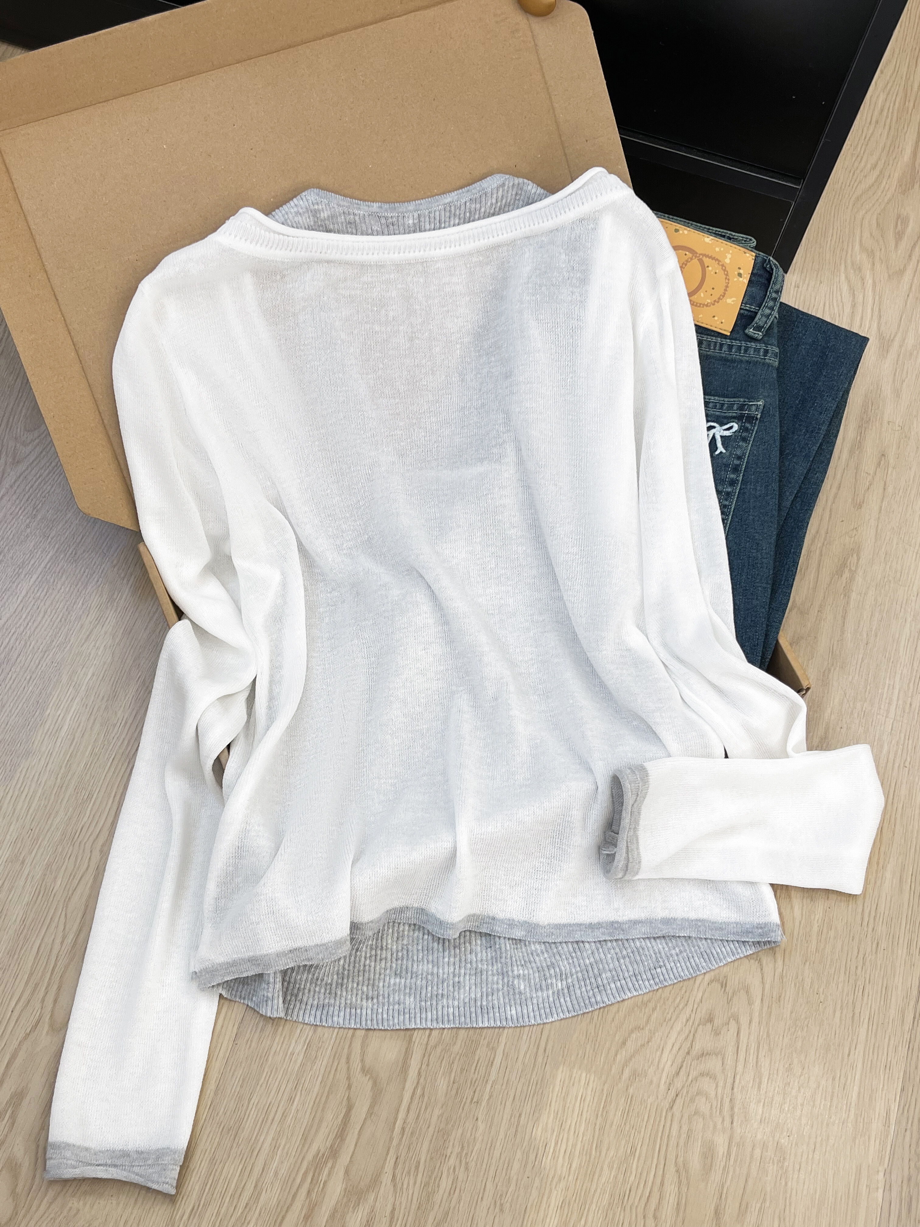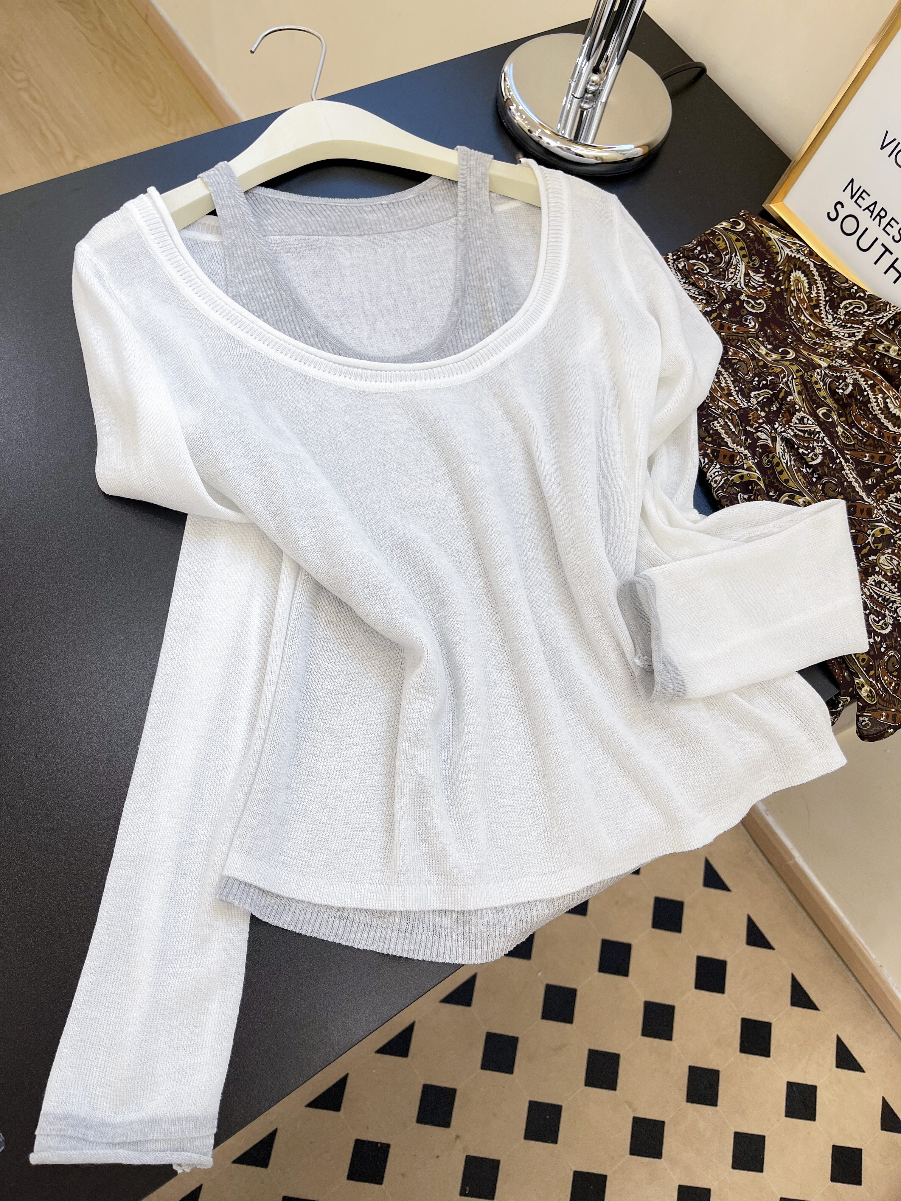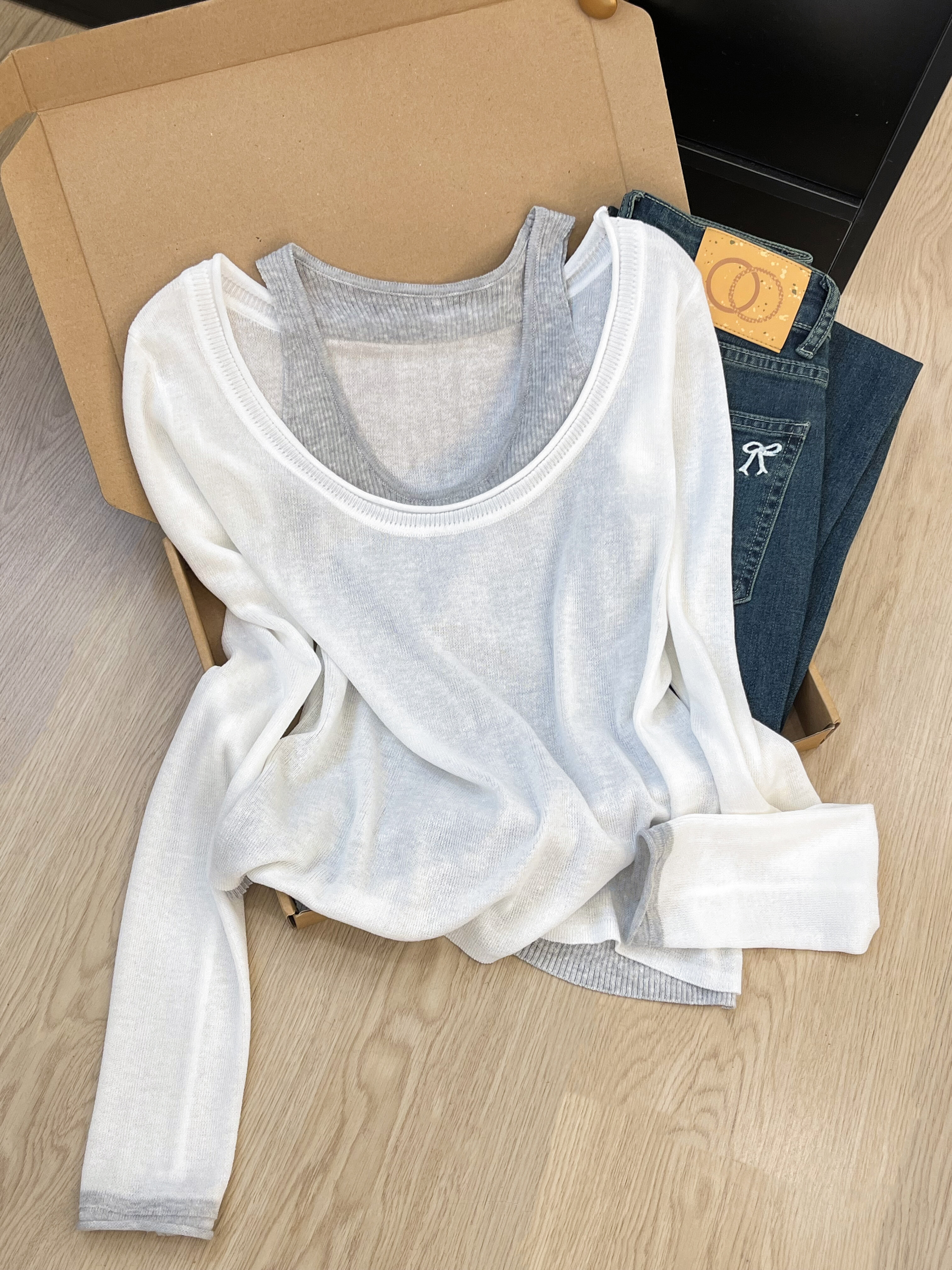 실사 봄 여름 느긋한 니트 스웨터 여성 태양 보호 셔츠 조끼 페이크 레이어드 오래된 돈 맨위
