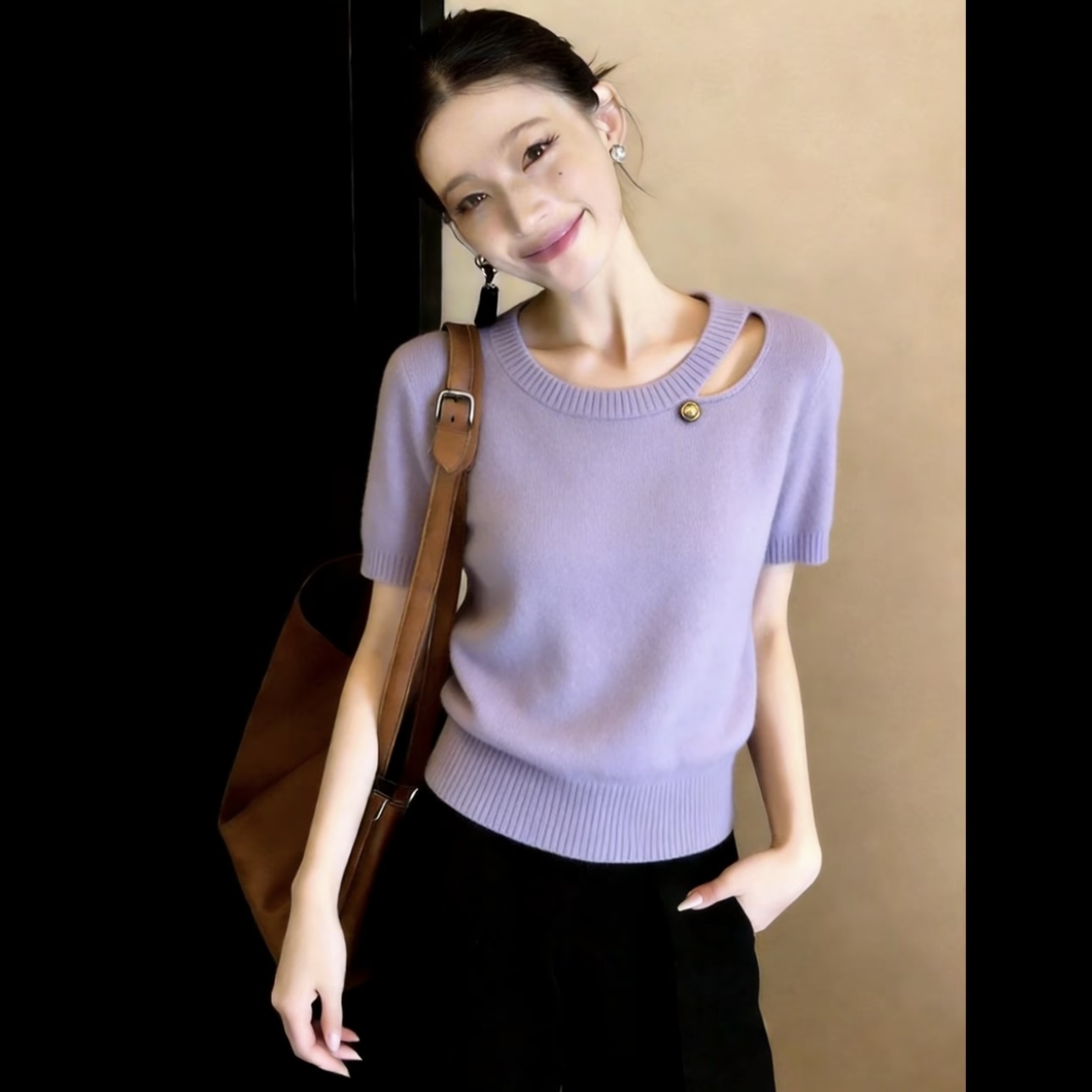 2026 봄 여름 홀로우 아웃 니트 라운드 넥 반팔 직업 신청 계절 외국 가스 연령 감소 하이웨이스트 니트 빛 럭셔리 절묘한 맨위 여성