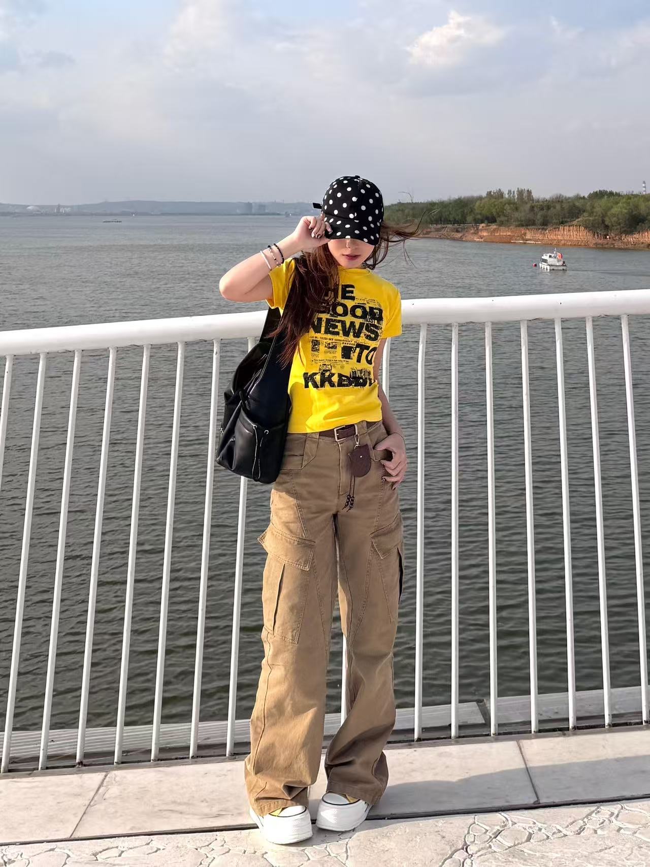 사람들 면 26 년 봄 새로운 조심해. 기계 허리 수축 반팔 티셔츠 여성 단색 맨위 페이크 레이어드 티셔츠