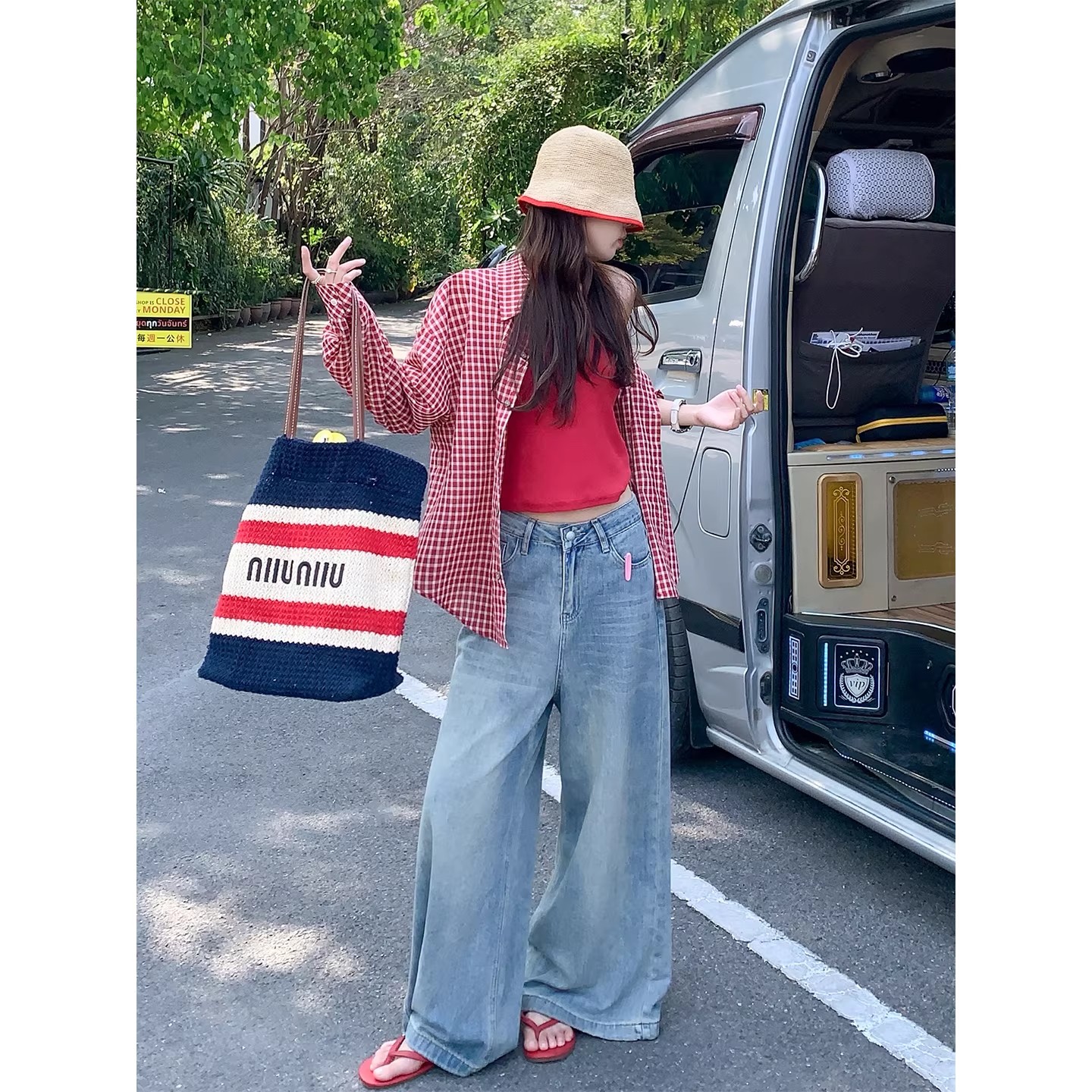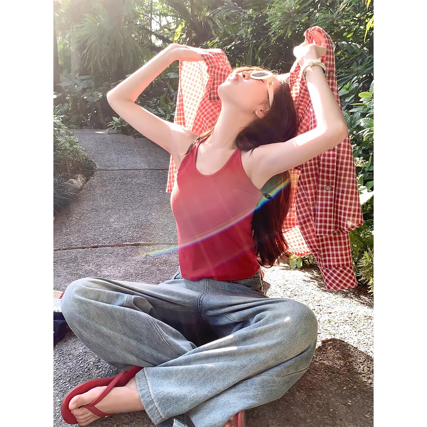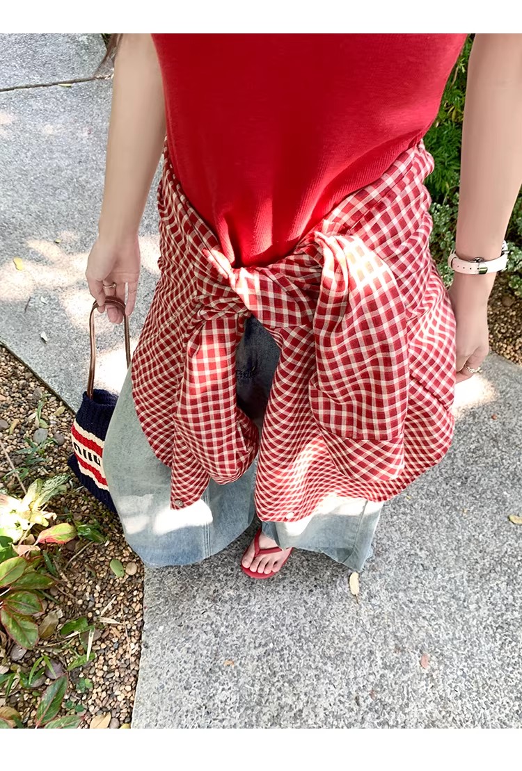 원본 그리드 주름 원단 빨간색 체크무늬 캐주얼 와이드 레그 팬츠 아이들 여름 새로운 루즈핏 와이드 레그 팬츠