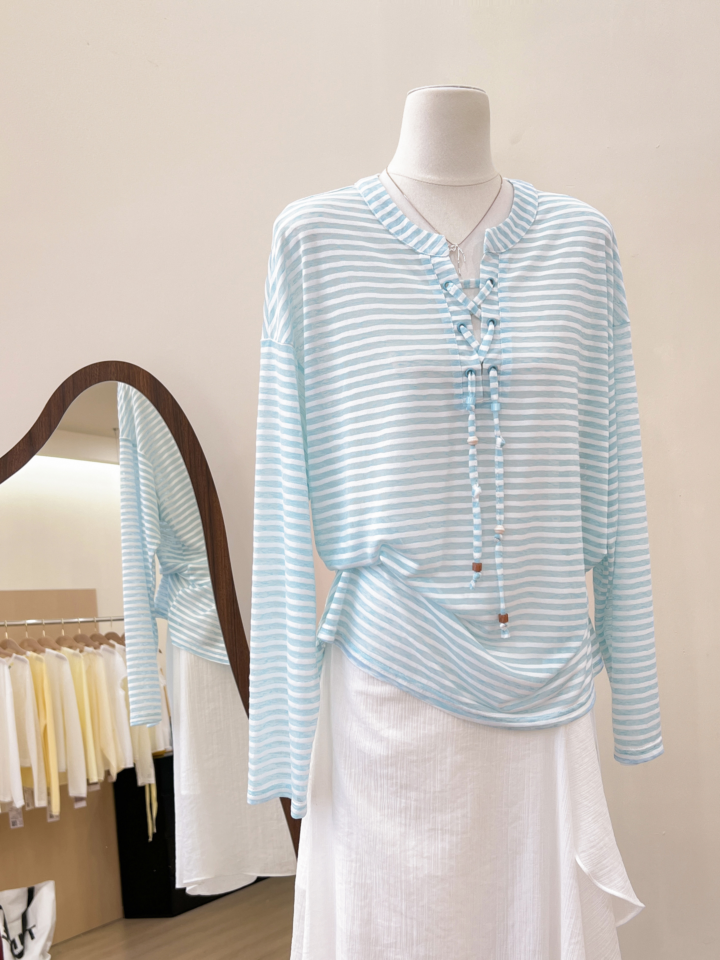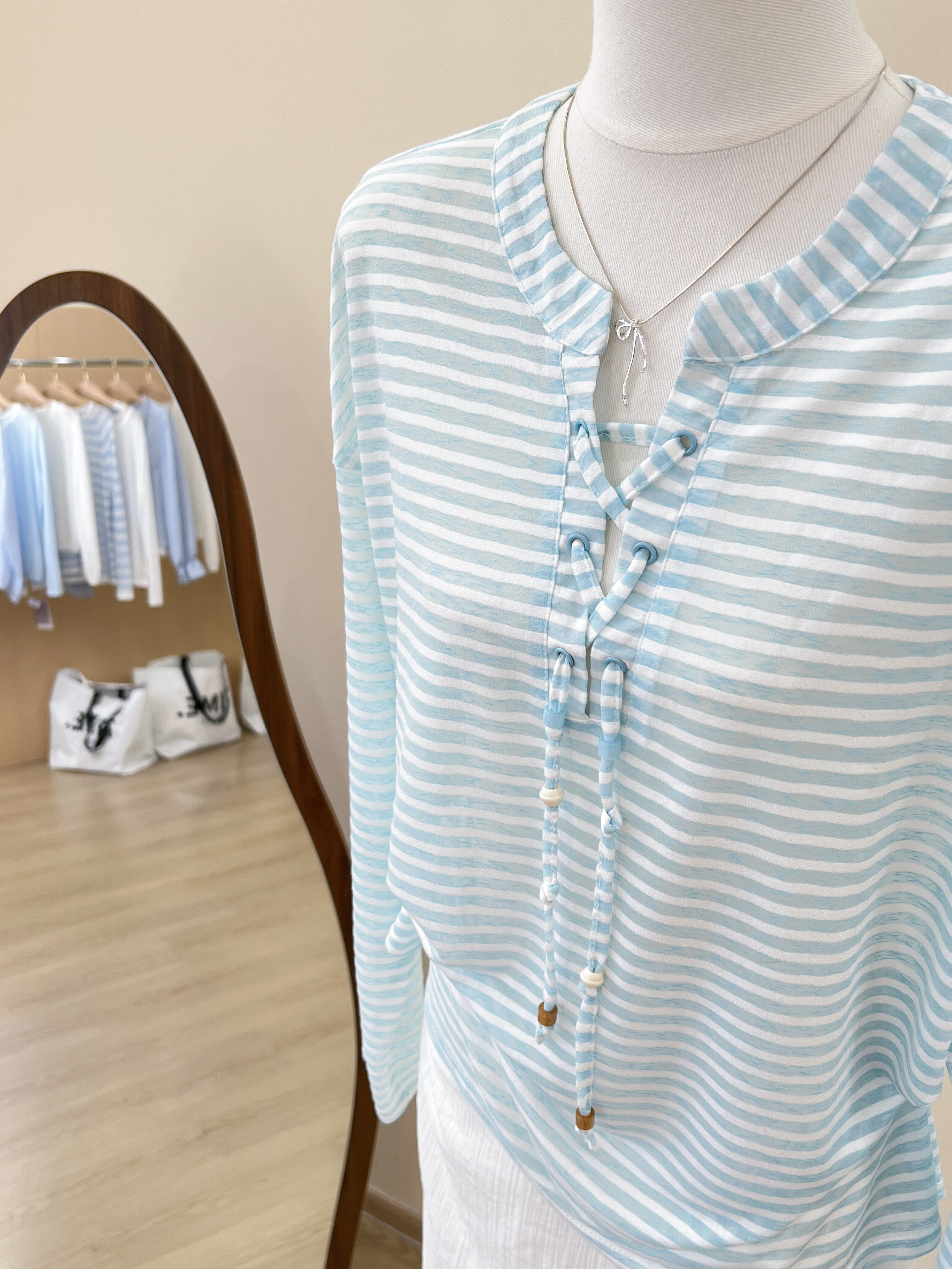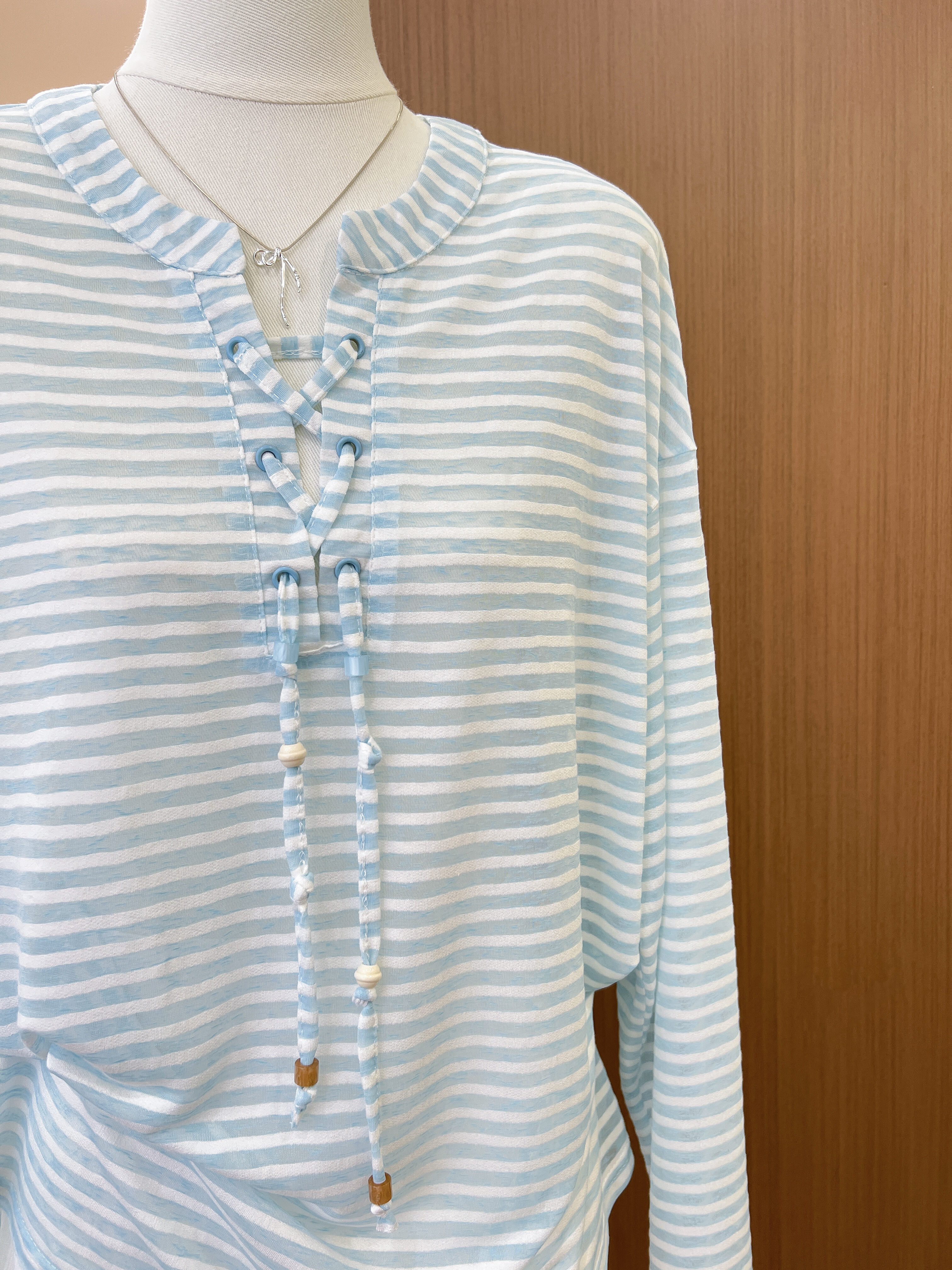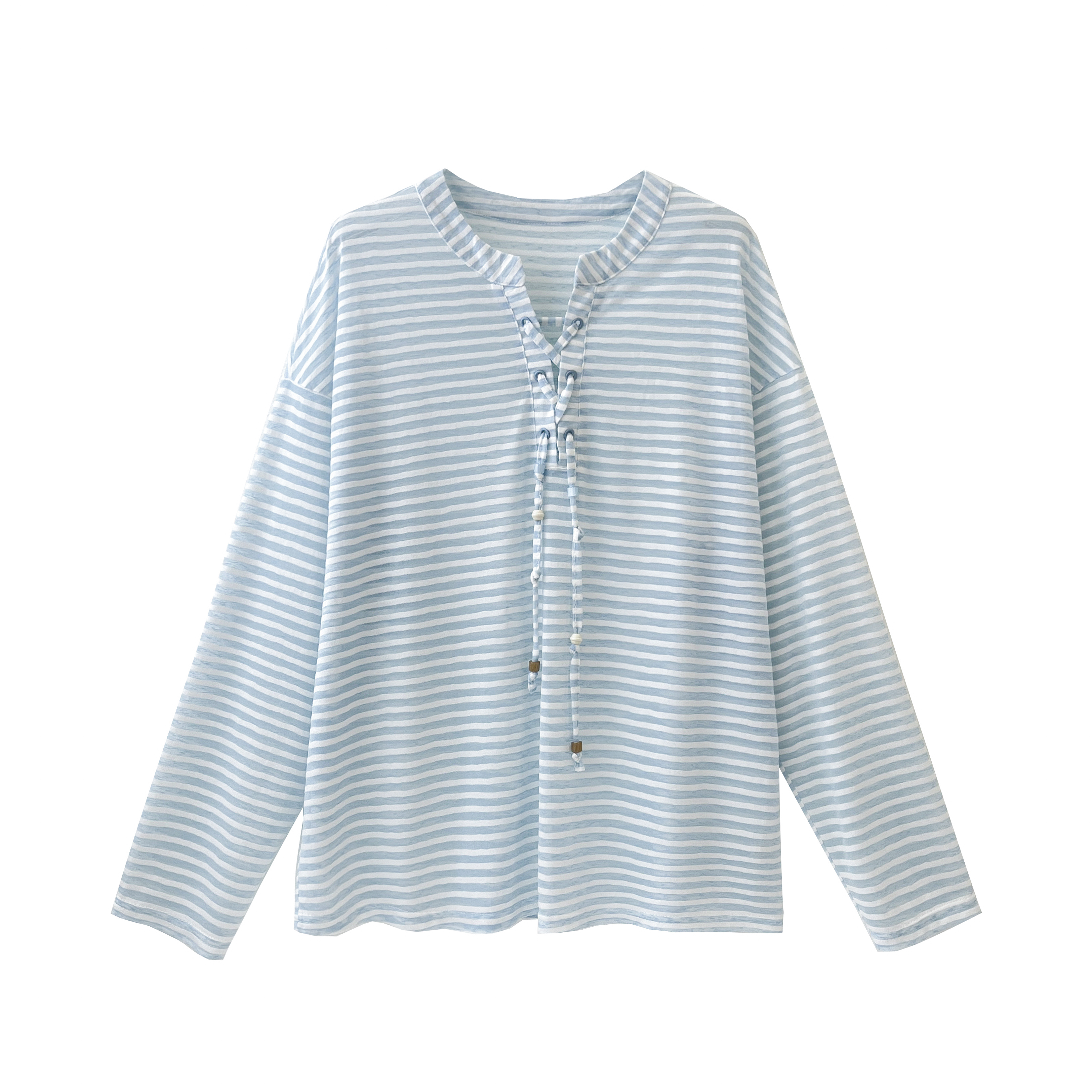 실사 한 부서 파란색 스트라이프 V넥 자외선 차단 긴팔 티셔츠 여성 여름 루즈핏 캐주얼 느긋한 바람 블라우스 맨위