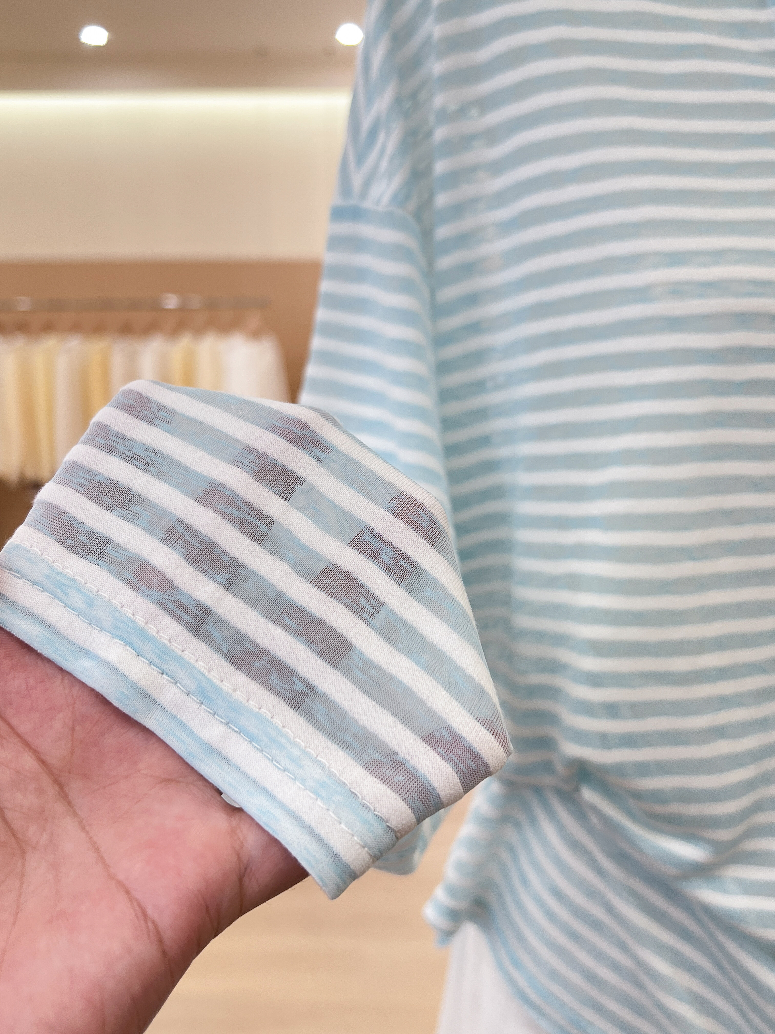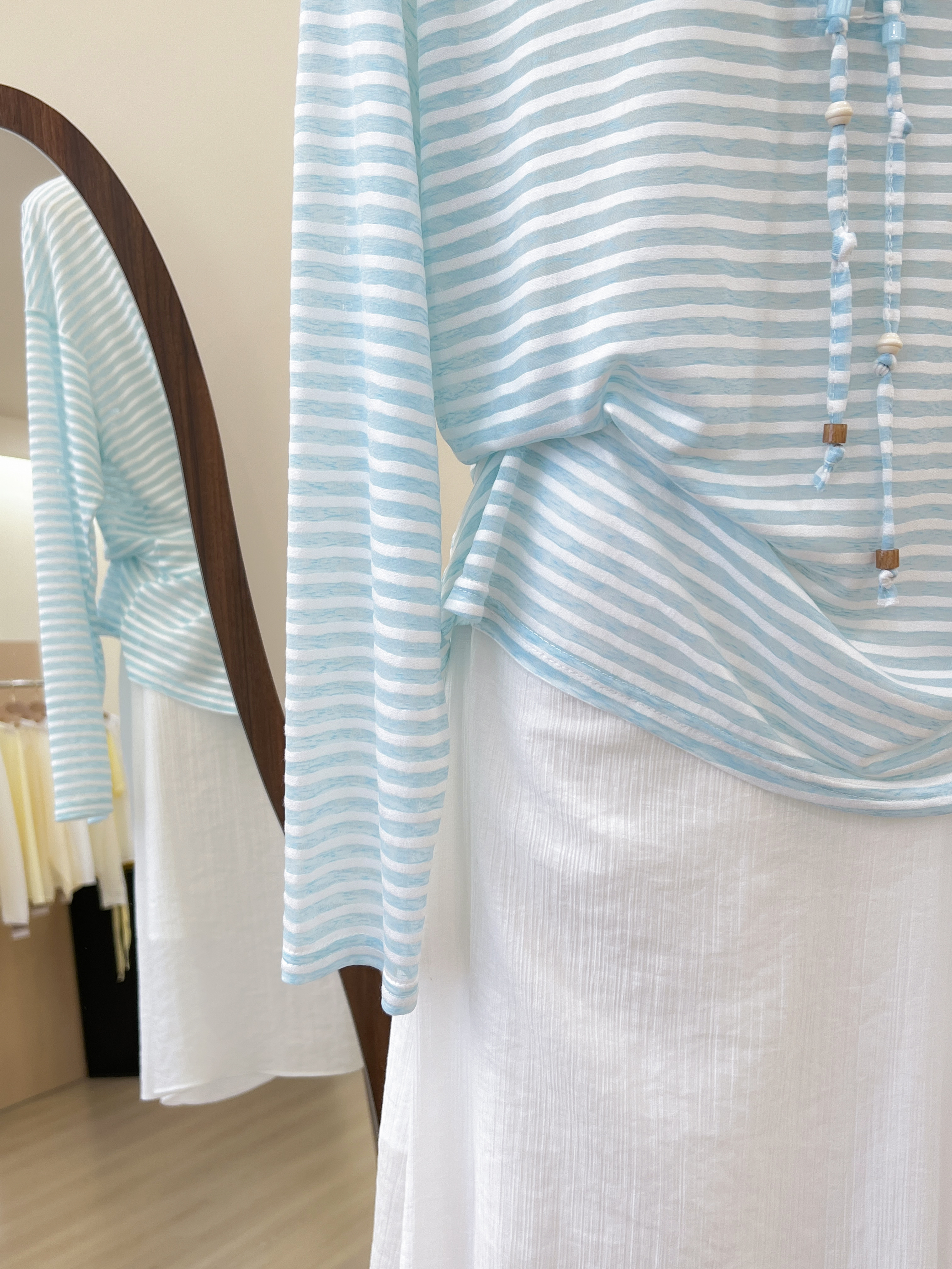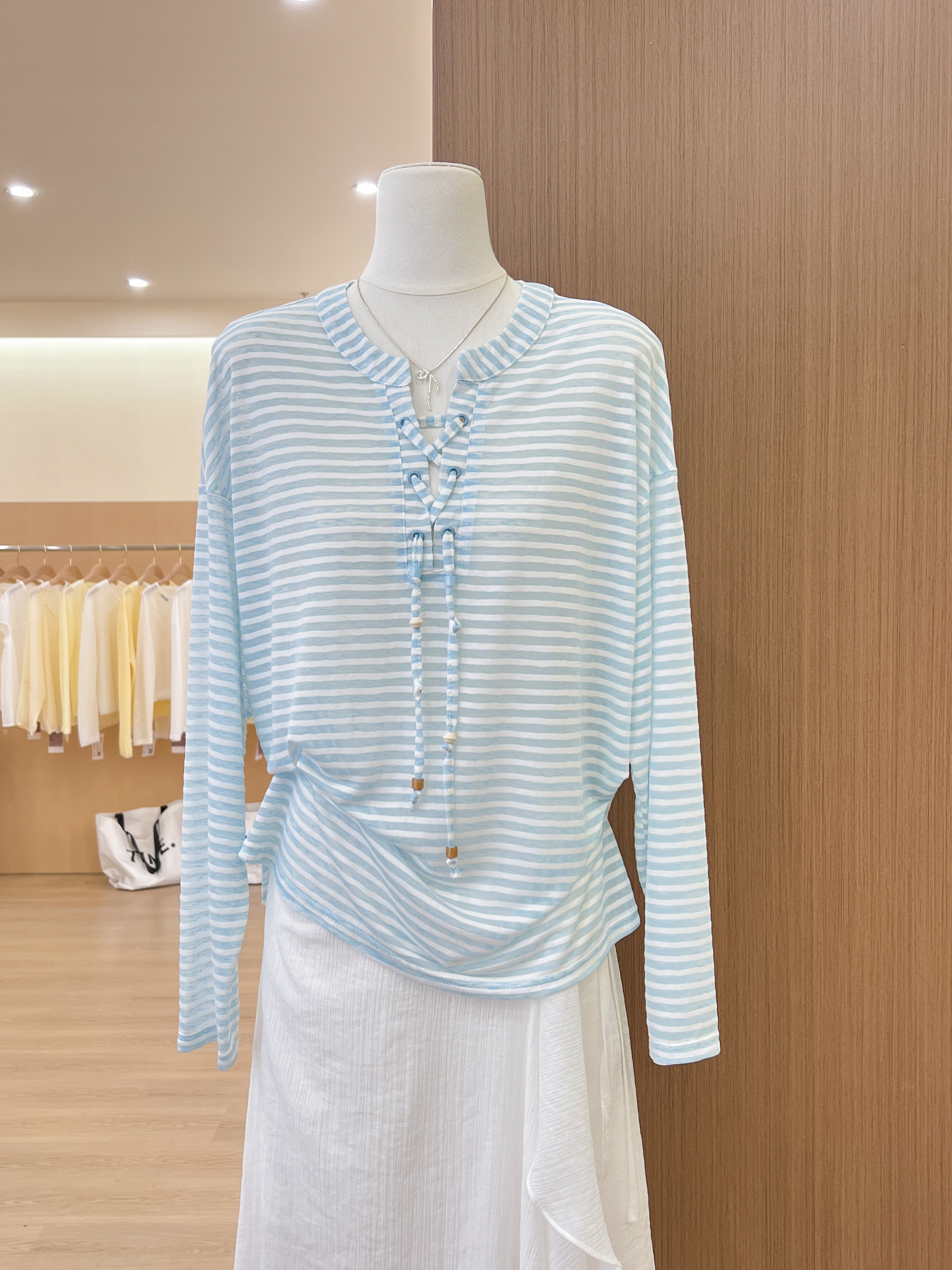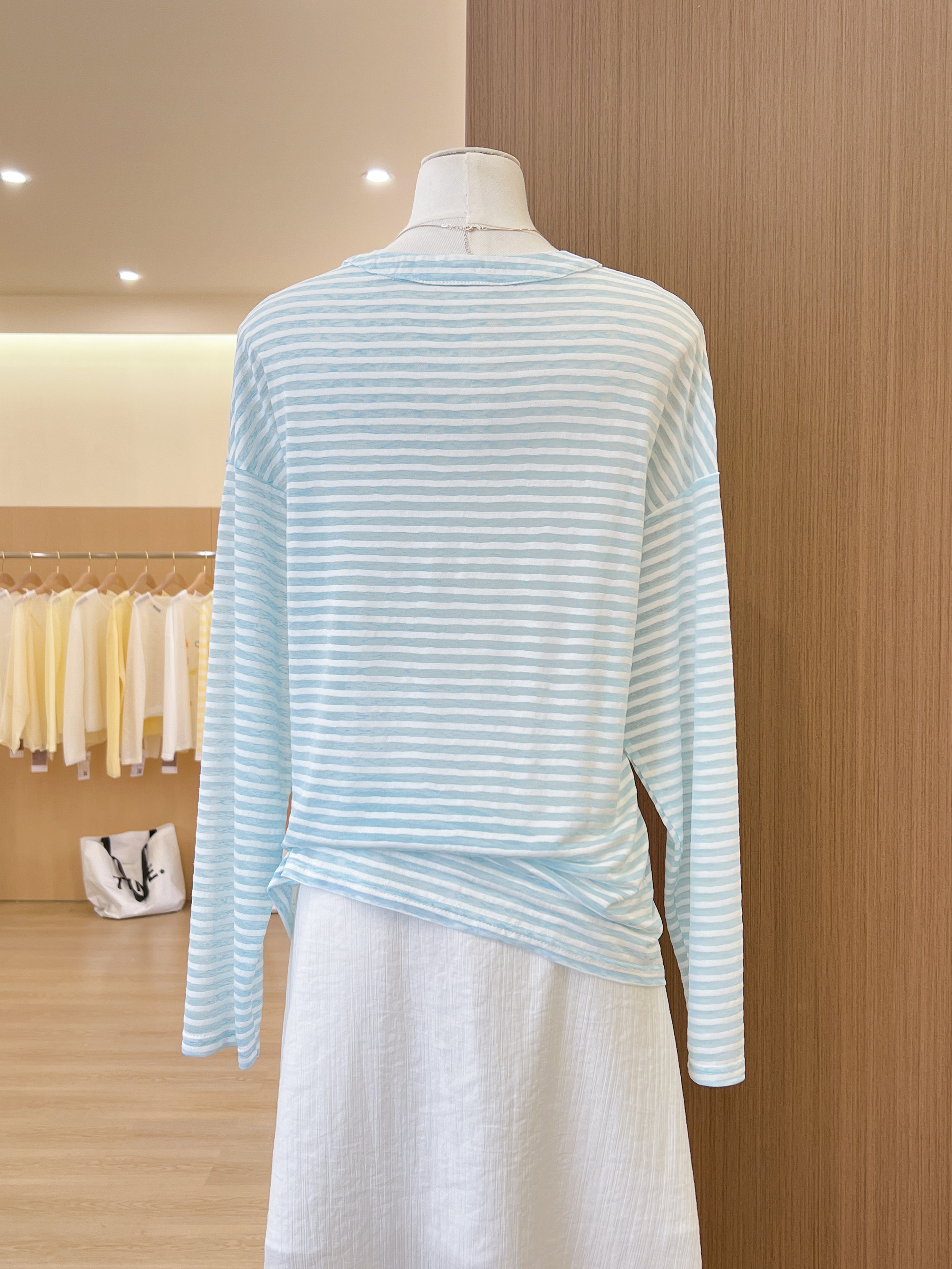 실사 한 부서 파란색 스트라이프 V넥 자외선 차단 긴팔 티셔츠 여성 여름 루즈핏 캐주얼 느긋한 바람 블라우스 맨위