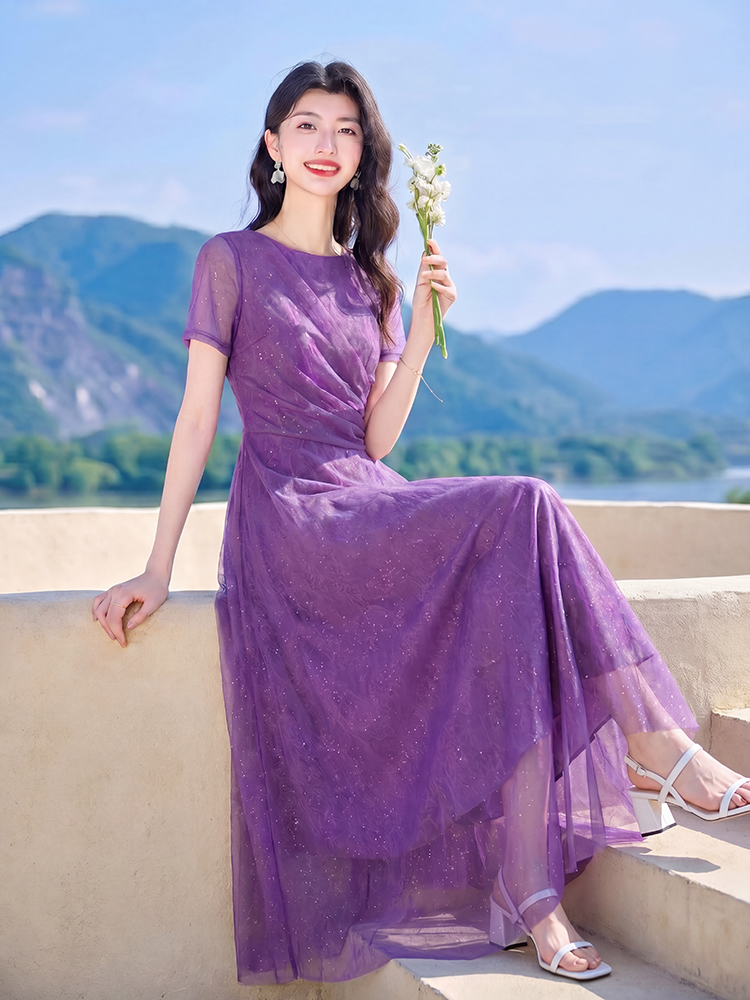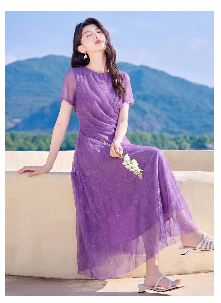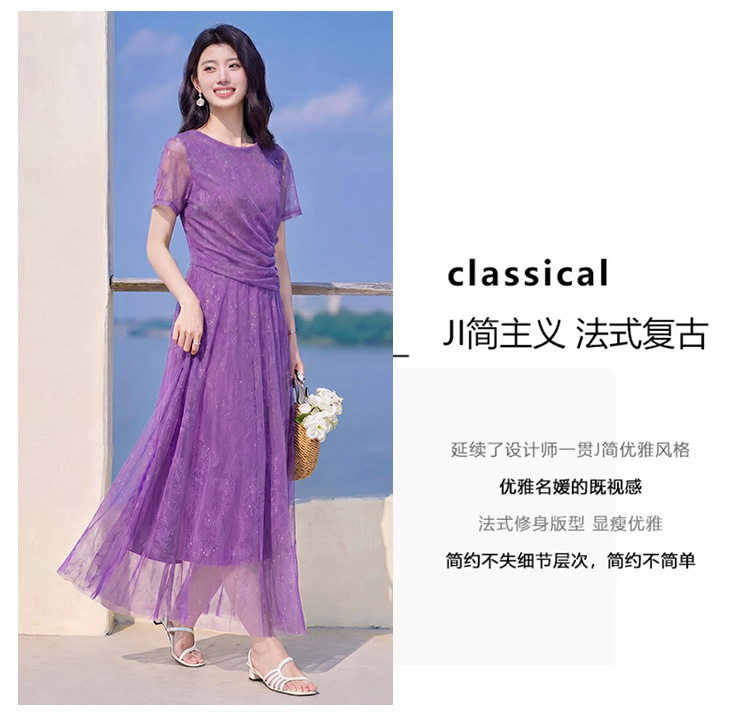 2026 년 새로운 프랑스식 우아함 보라색 허리 수축 여성 드레스 슬림해 보이는 품격 고급 센스 몸매 가꾸기 롱 스커트