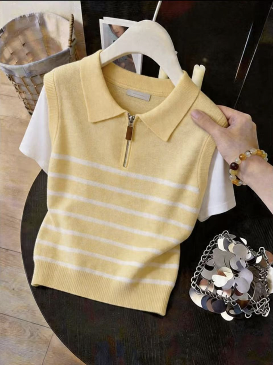 2025 년 여름 새로운 미니멀리즘 스트라이프 싱글 줄 버튼 디자인 민소매 니트 맨위 품격 다용도 여성