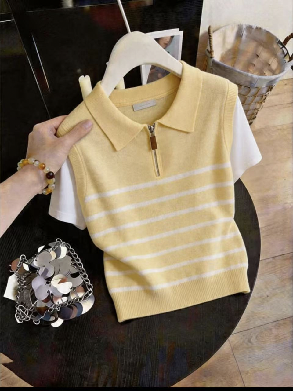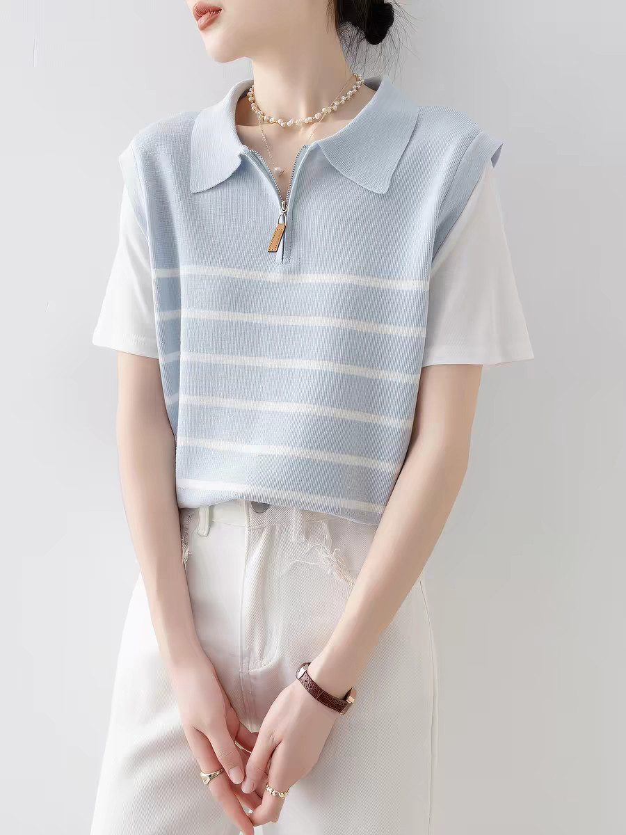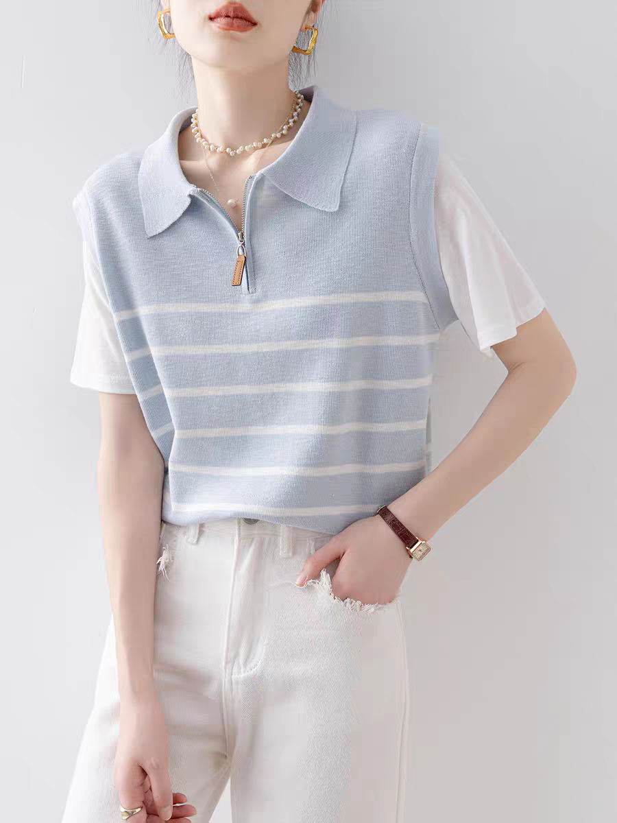 한 부서 배색 페이크 레이어드 니트 스웨터 여성 여름 섹션 학원 스타일 하프 지퍼 반팔 POLO 셔츠 디자인 센스 맨위