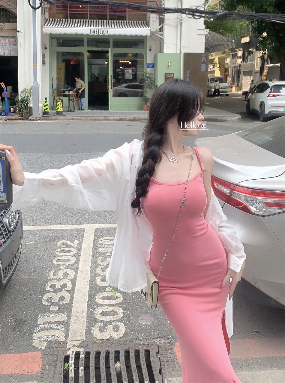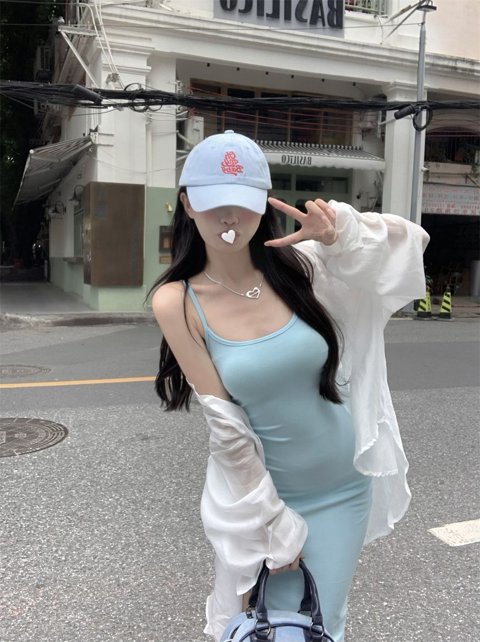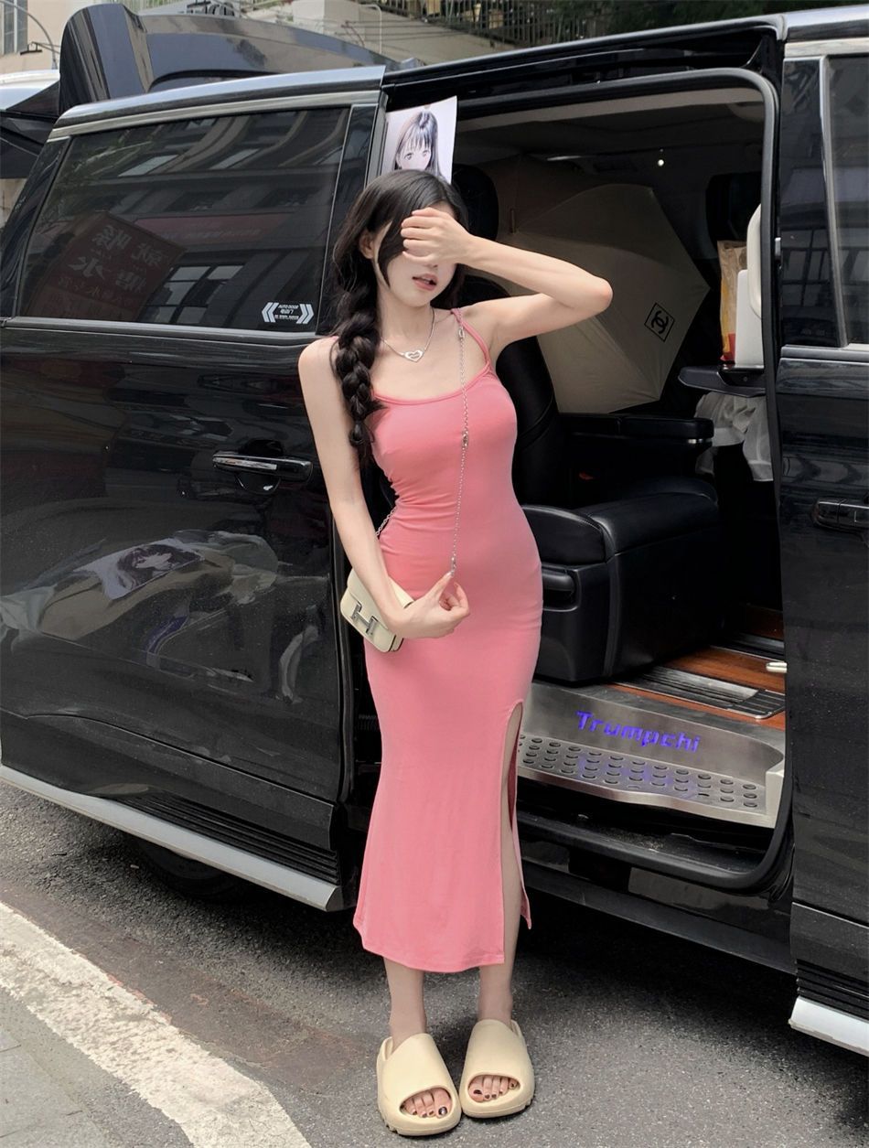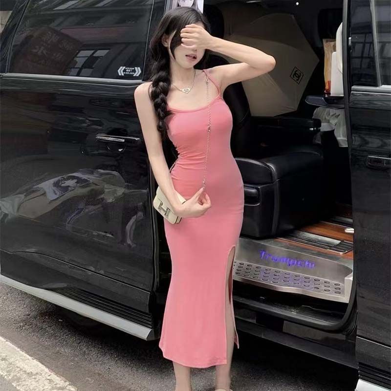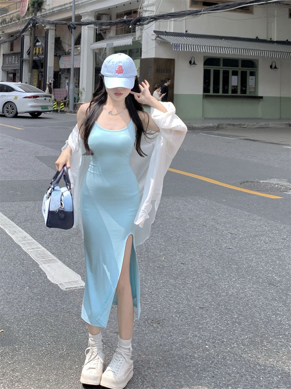 순수한 욕망 바람 슬립 여성 드레스 새로운 파란색 몸매 가꾸기 슬림해 보이는 트임 치마 핫걸 민소매 타이트 스커트 중간 길이 스커트