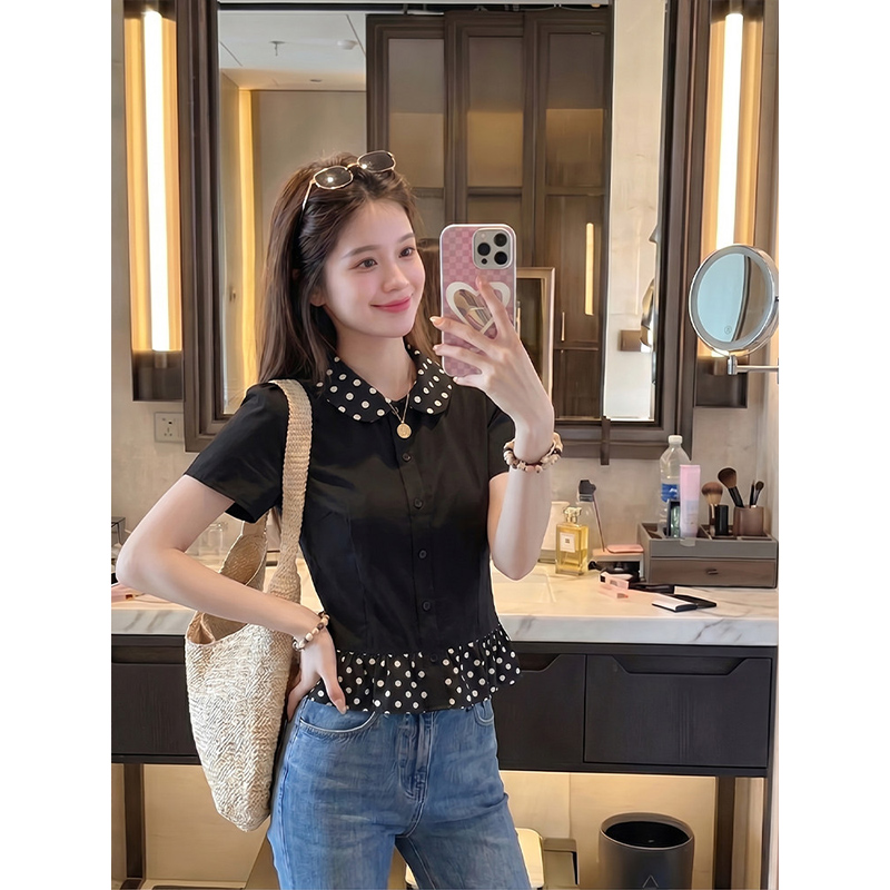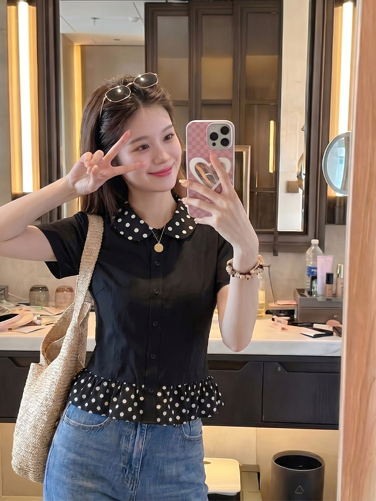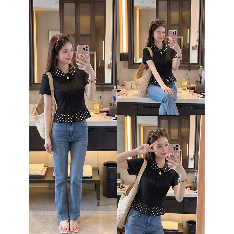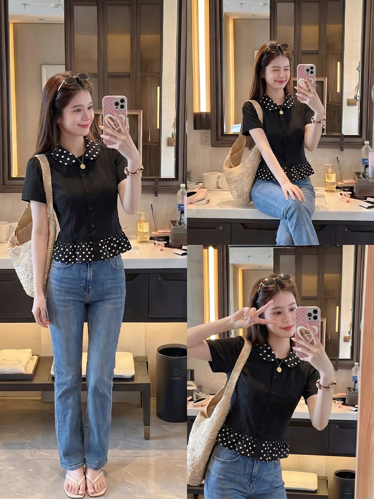 한국 대외 무역 주문 차가운 면 리브 1 1 빅 사이즈 패치워크 도트 무늬 폴로 칼라 몸매 가꾸기 티셔츠 여성 새로운 여름 맨위