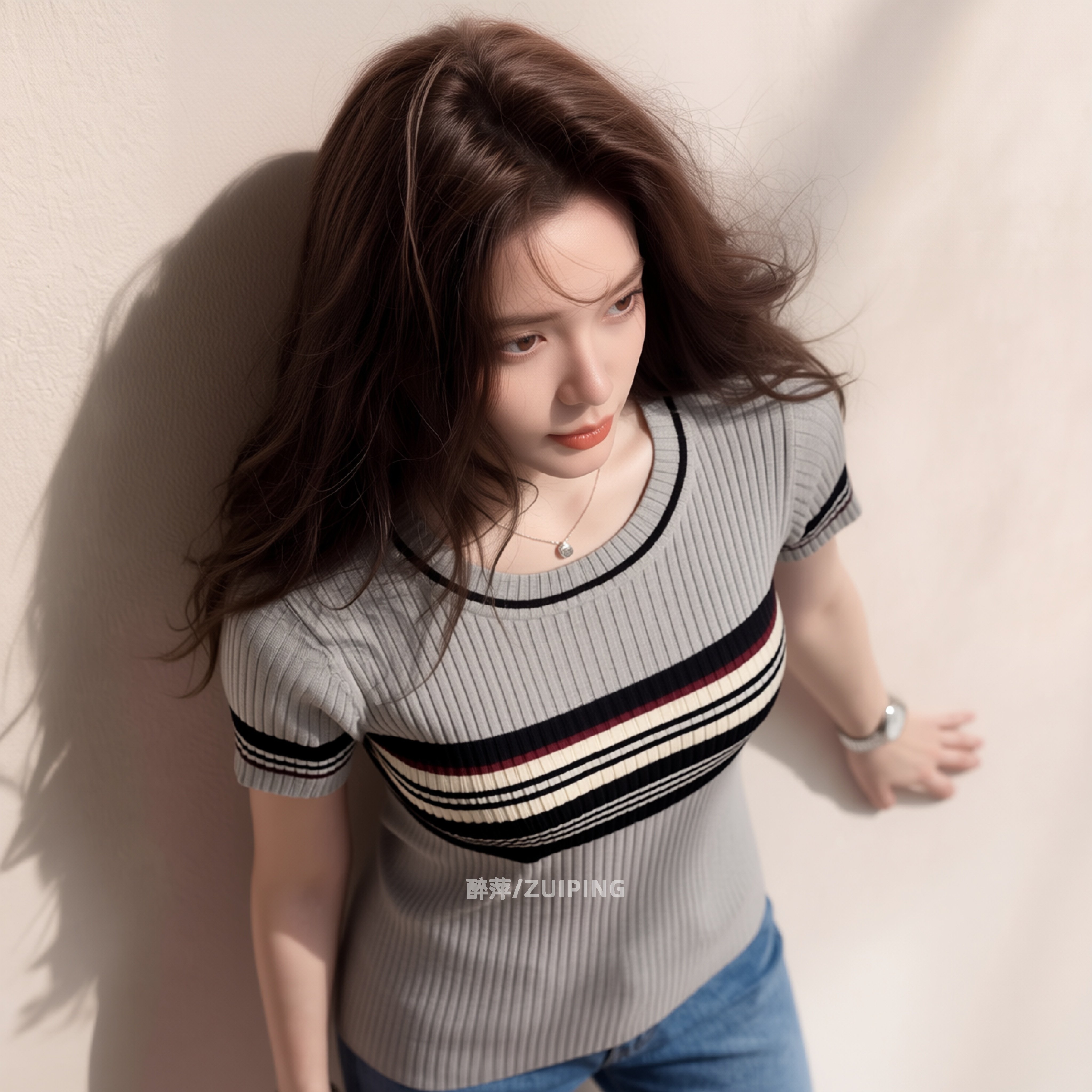 2026 여름 새로운 패션 여성 고급 디자인 센스 회색 라운드 넥 반팔 니트 스웨터 다용도 슬림해 보이는 맨위