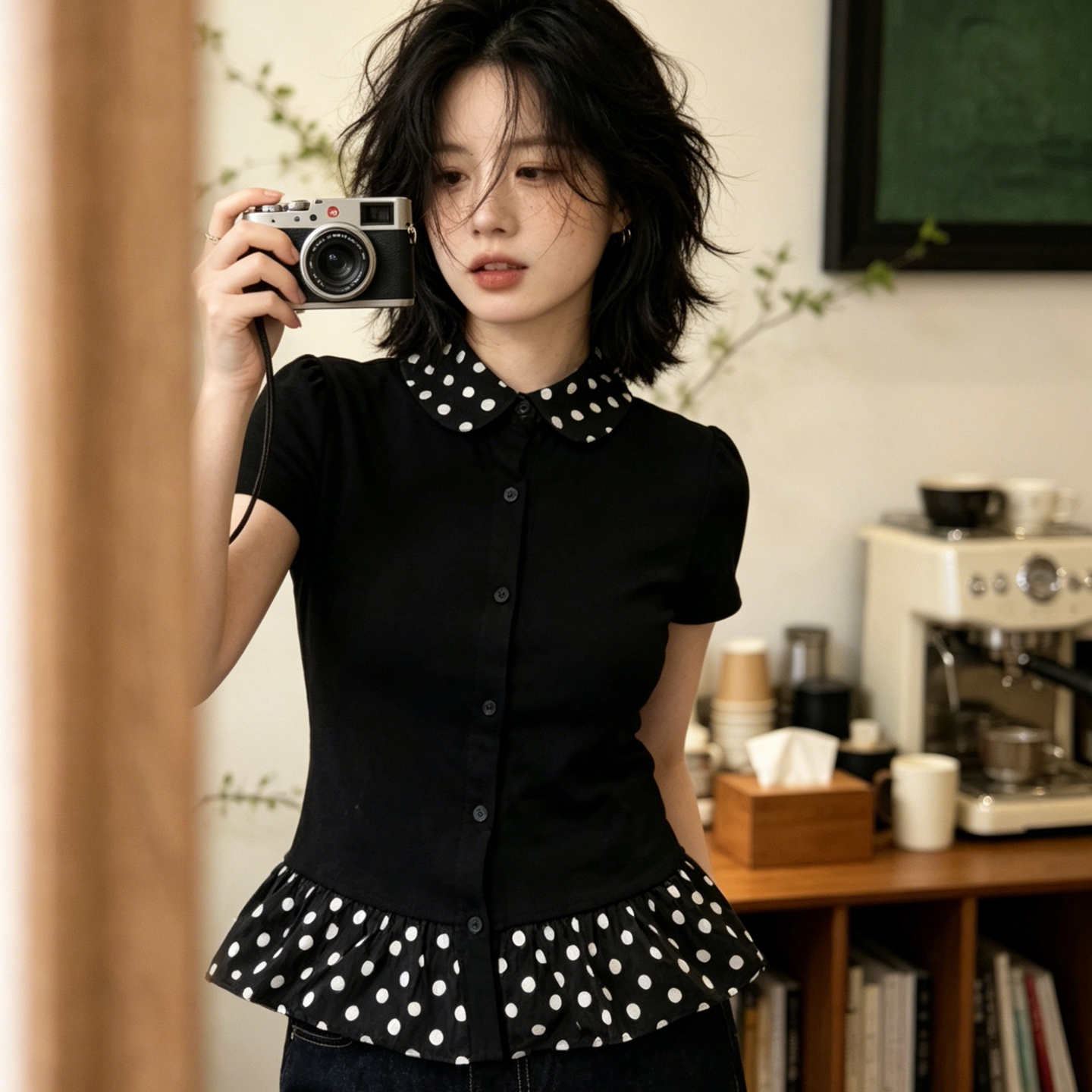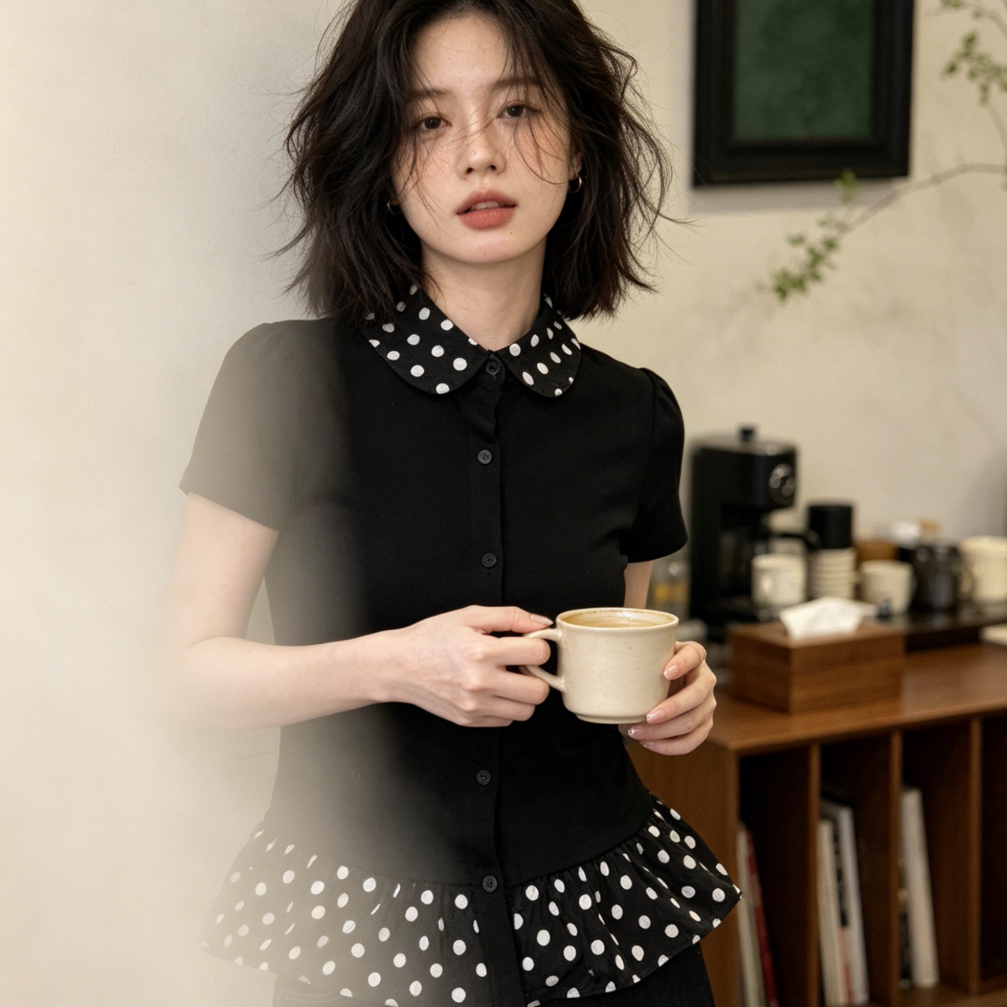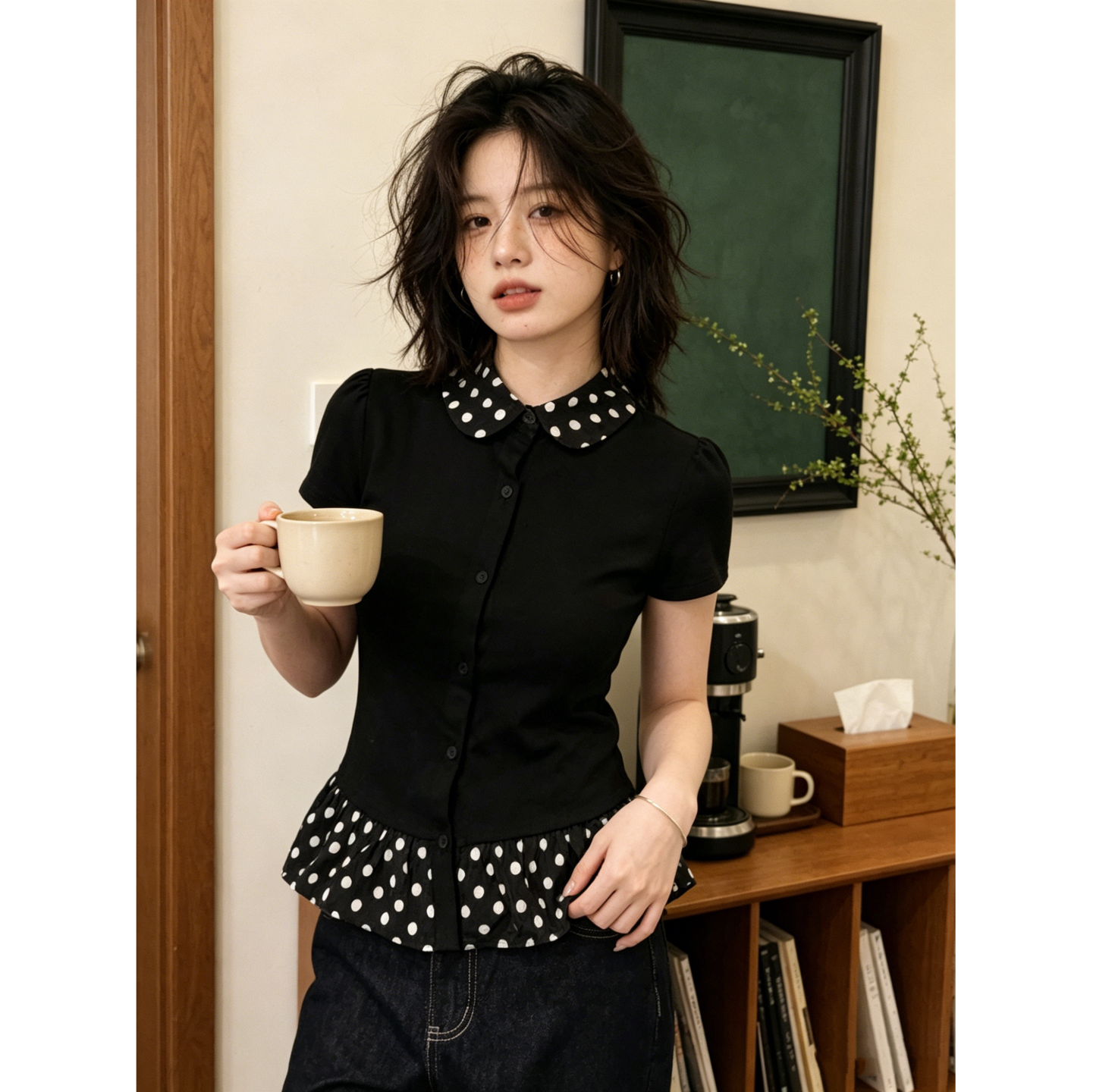 한국 대외 무역 주문 차가운 면 리브 1 1 빅 사이즈 패치워크 도트 무늬 폴로 칼라 몸매 가꾸기 티셔츠 여성 새로운 여름 맨위