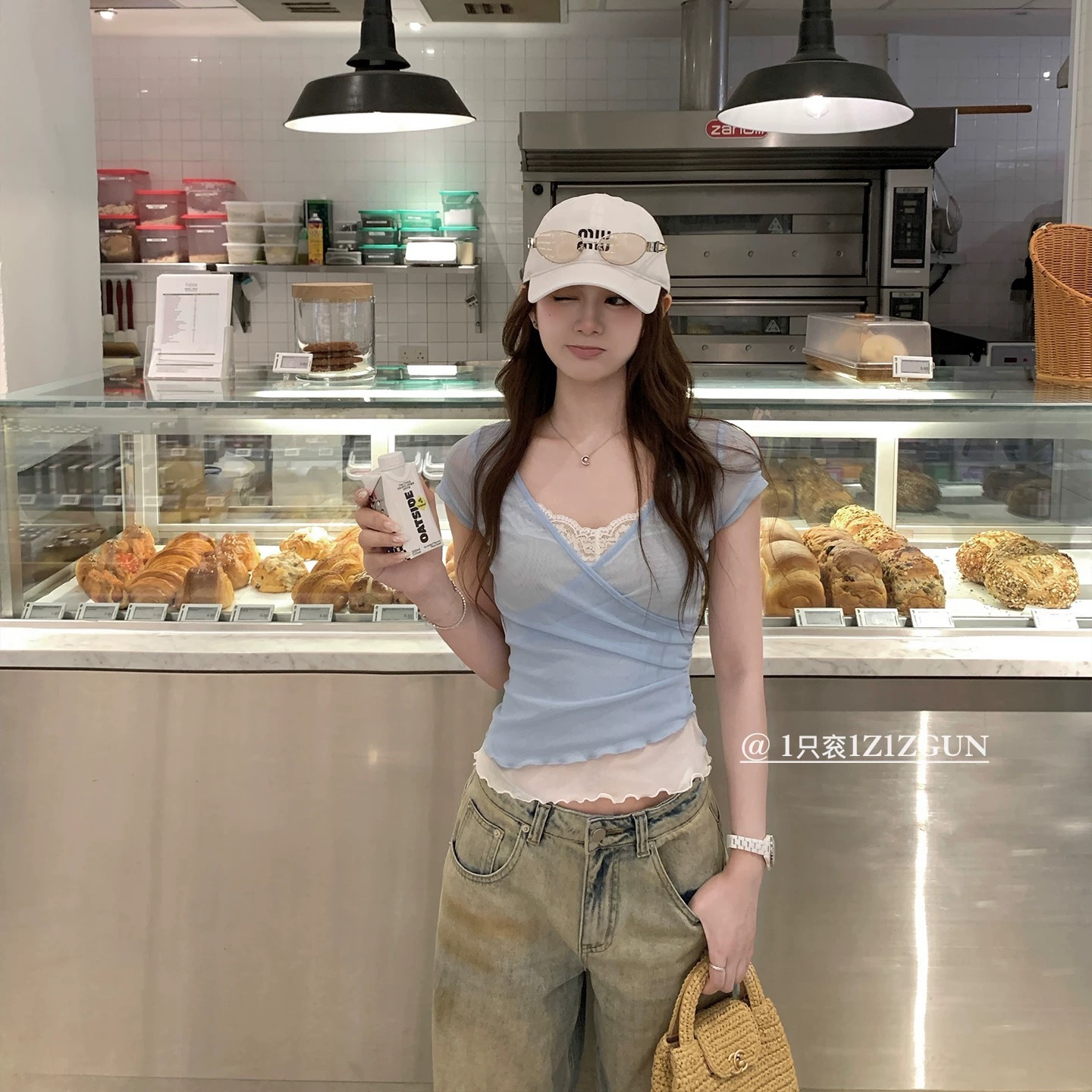 1개 다곤 1z1zgun 차가운 센스 물 빛 t 작은 섹시함 청 ~을 통해 페이크 레이어드 레이스 조각 망사 반팔 여성 여름