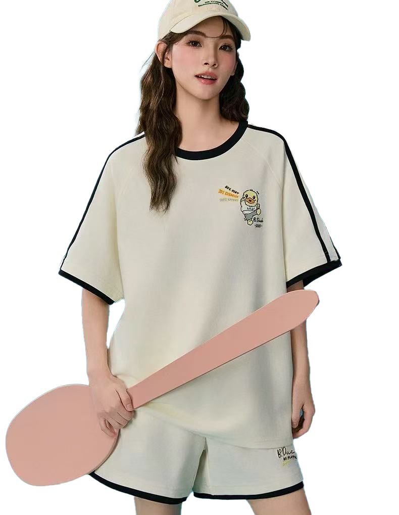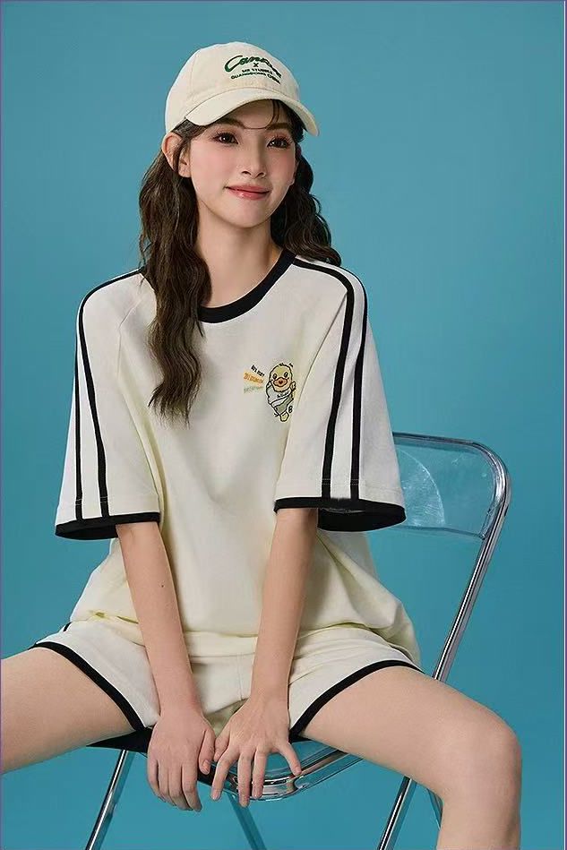 원본 솜씨 오리 새끼 만화 자수 루즈핏 귀여운 POLO 셔츠 반팔 반바지 세트 여성 투피스 세트 여름