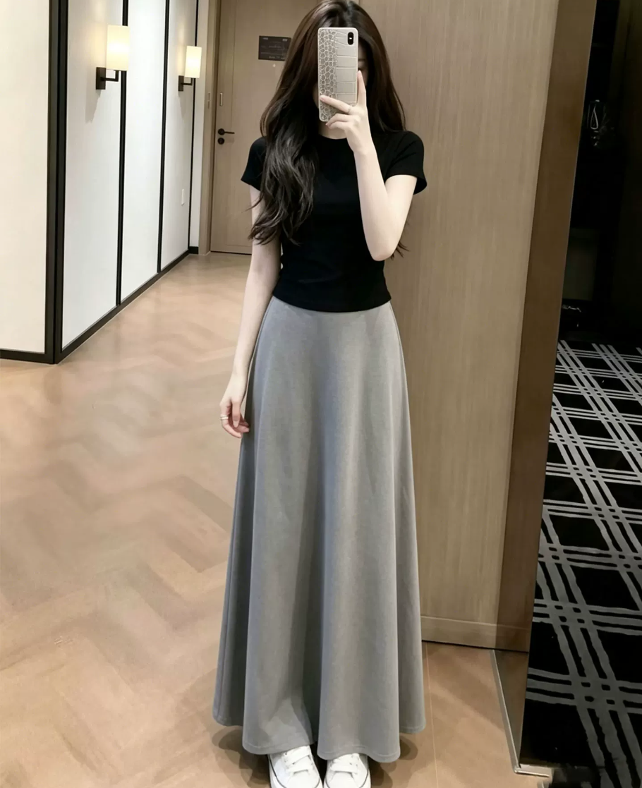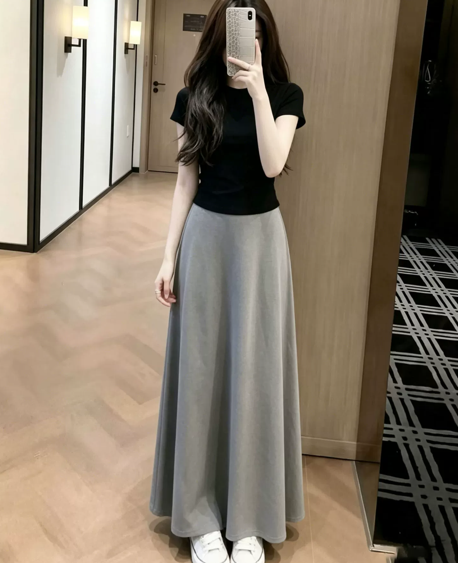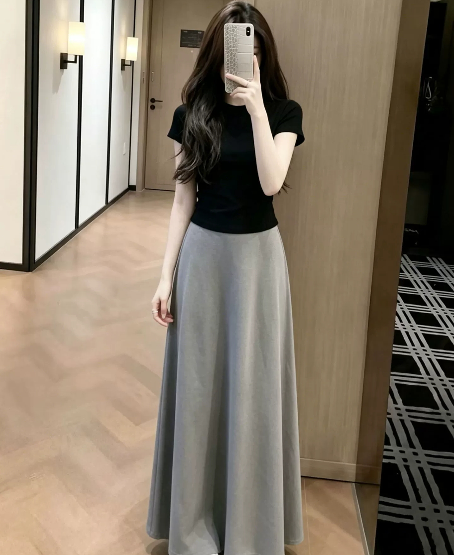 여름 새로운 2026 슈퍼 화재 그레이트 봐 그래. 한 부서 패션 몸매 가꾸기 슬림해 보이는 맨위 회색 반신 스커트 투피스 세트