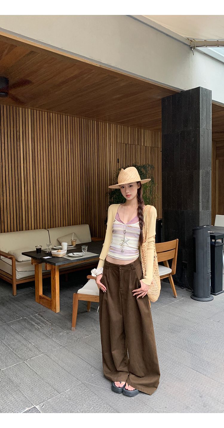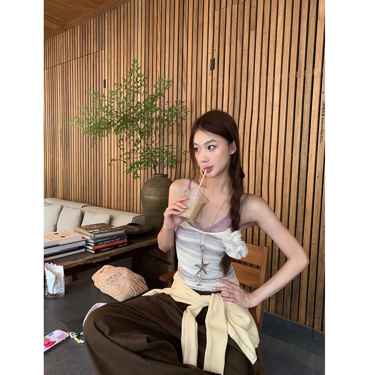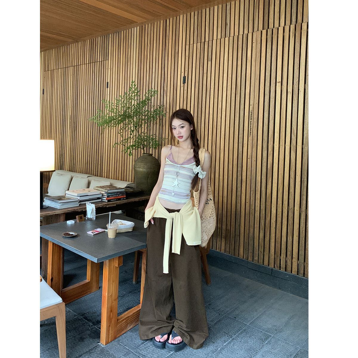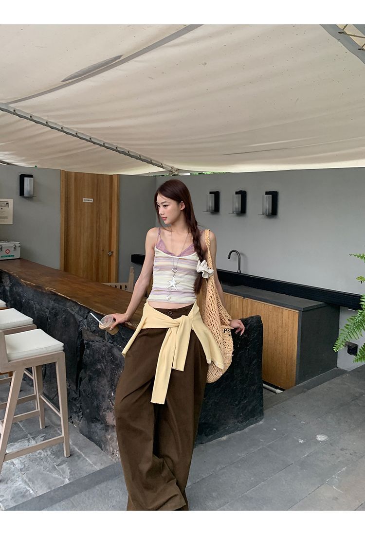 프랑스식 황색 V넥 민소매 캐미솔 2026 여름 허리 수축 슬림해 보이는 외출용 맨위 트렌디