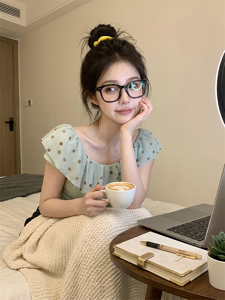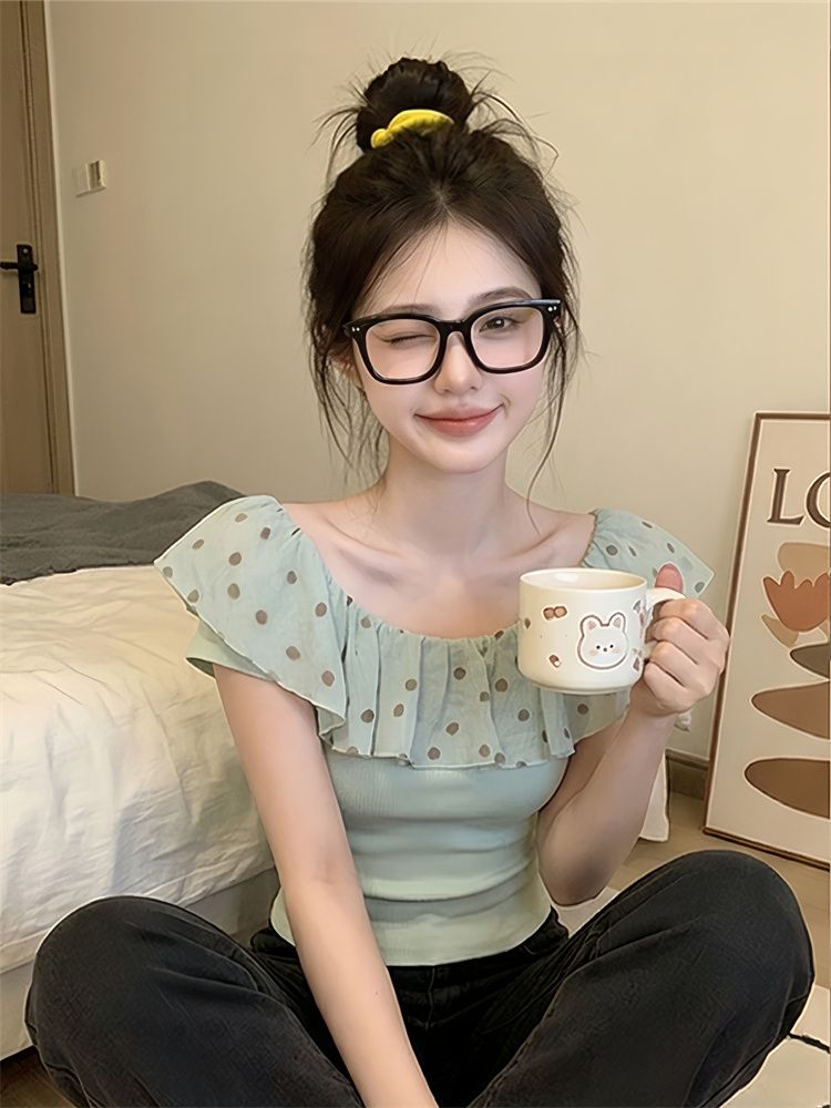 2 2 와 사고 방식 한 부서 도트 무늬 오프숄더 프릴 반팔 티셔츠 여성 여름 몸매 가꾸기 쇼트 스타일 Chic 아름다운 맨위