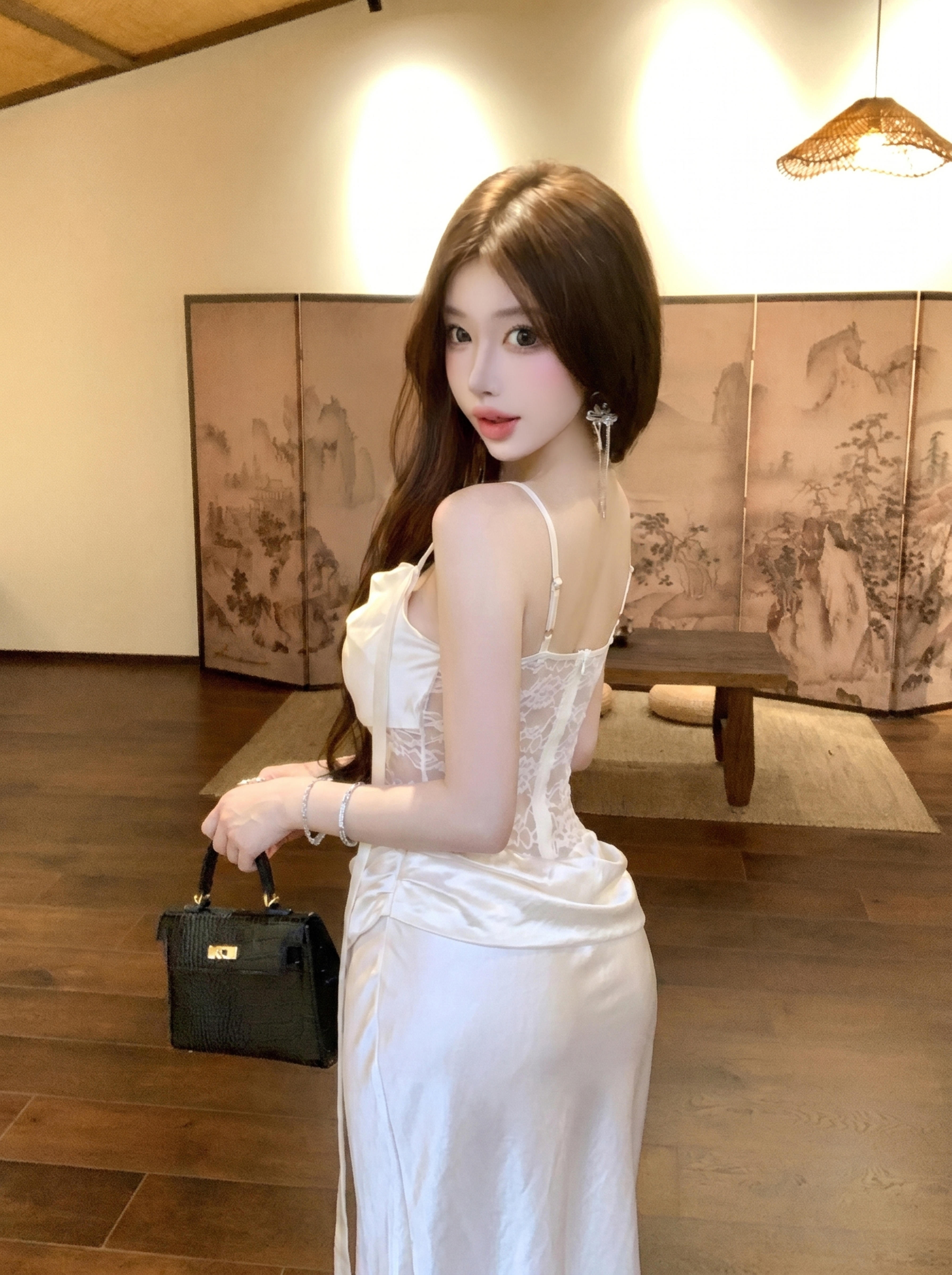 실사 핫걸 순수한 욕망 바람 오프숄더 드레스 디자인 센스 망사 시스루 품격 아름다운 허리 수축 타이트 스커트 롱 스커트
