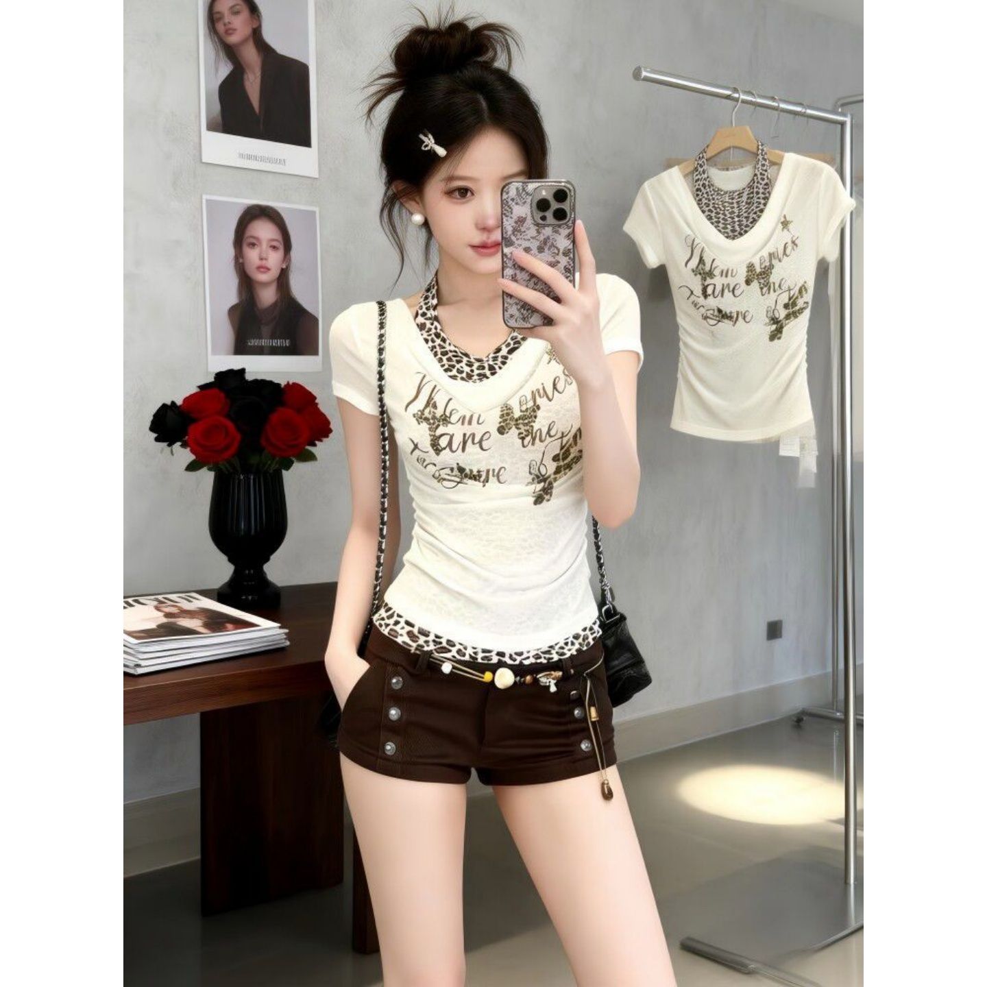 경관 그림 주간 실크 리브 110 크 모달 핫걸 바람 레오파드 무늬 페이크 레이어드 행침 목 반팔 티셔츠