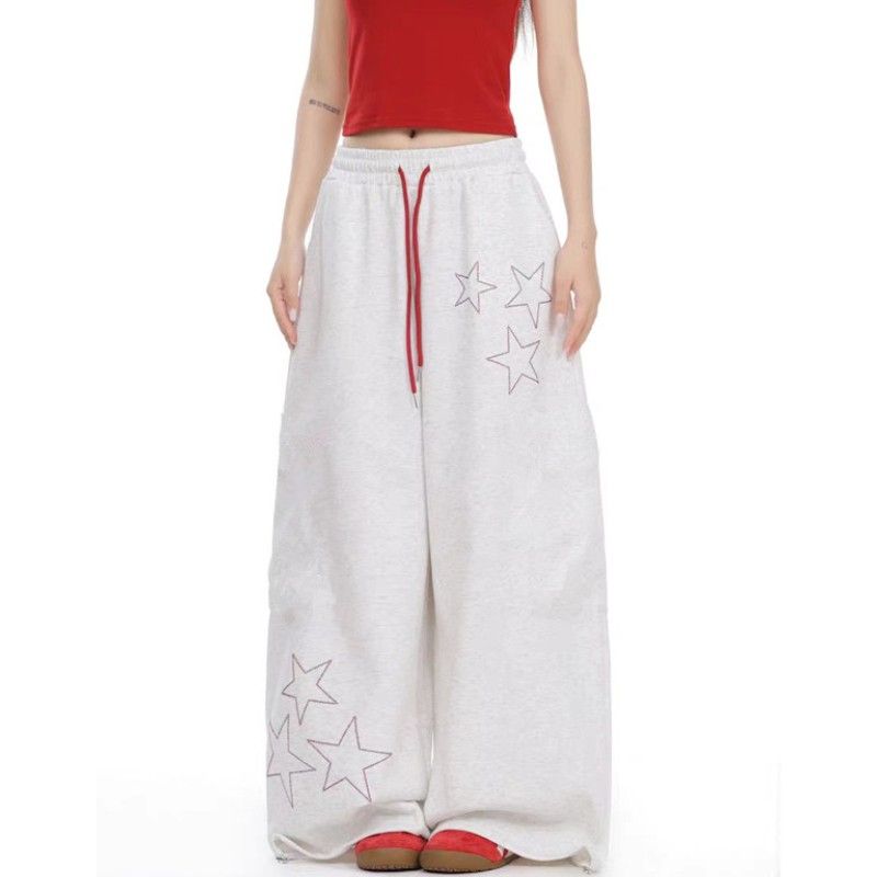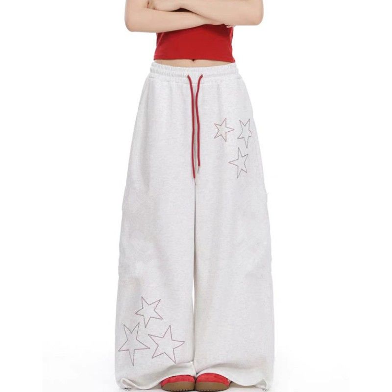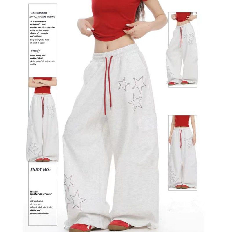 아메리칸 레트로 거리 바람 별 알파벳 프린트 와이드 레깅스 바지 봄 루즈핏 레이스업 작은 대중 디자인 모통이 칼 바지