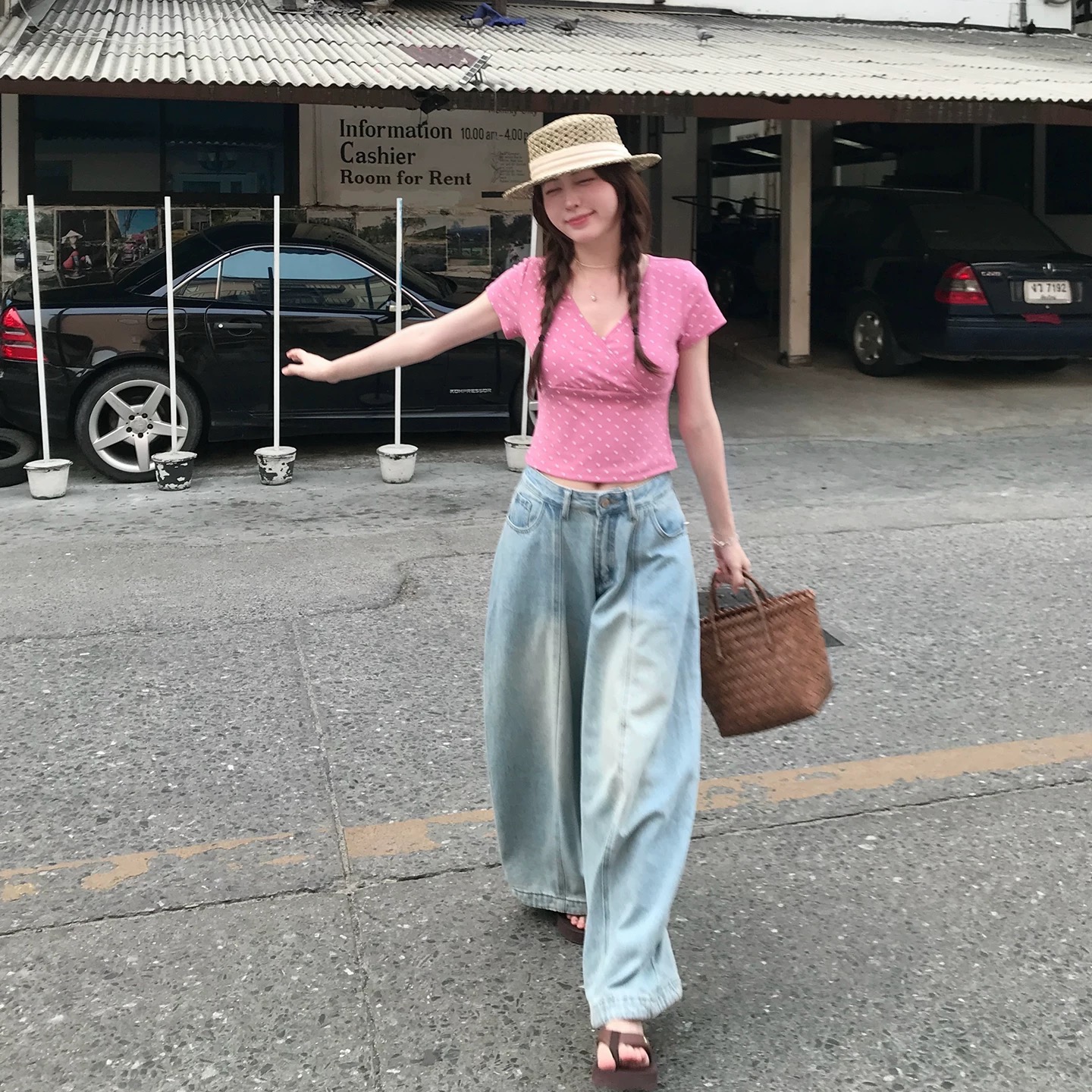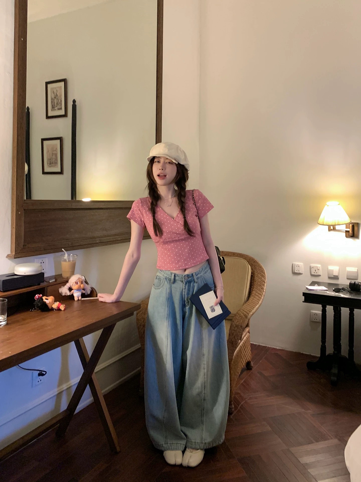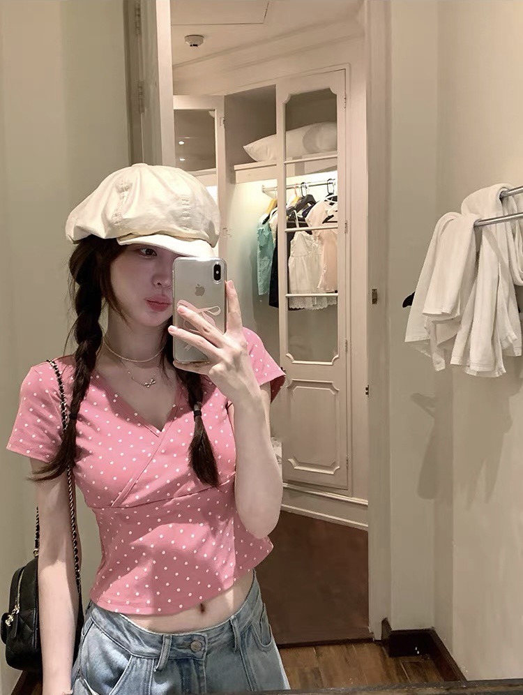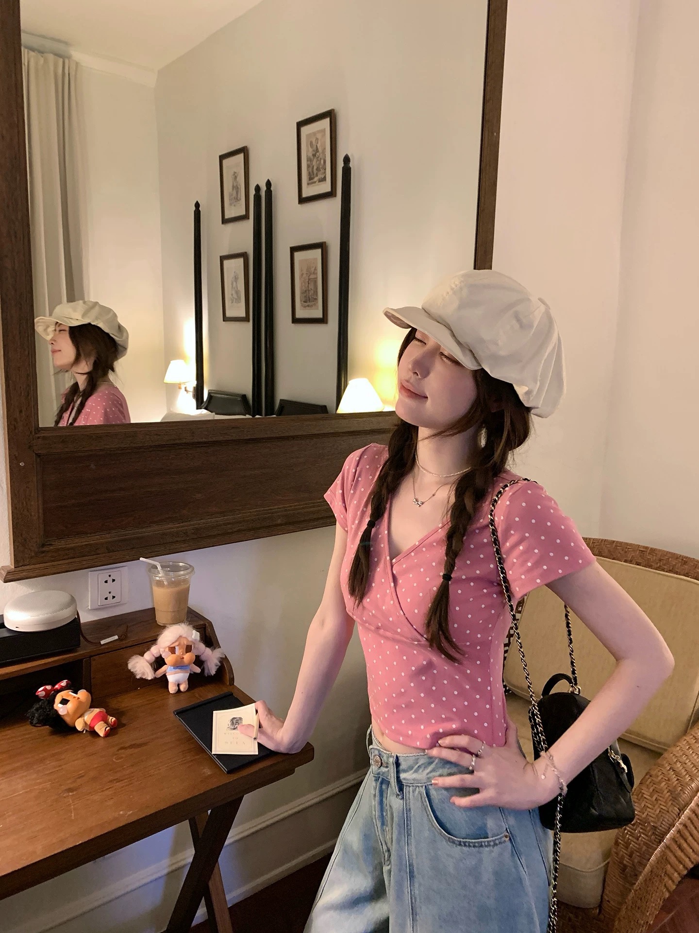 ptonumi 한여름 매화 와인 십자가 빅 브이 넥 도트 무늬 반팔 티셔츠 여성 Z아 어깨 순수한 욕망 맨위 쇼트 스타일