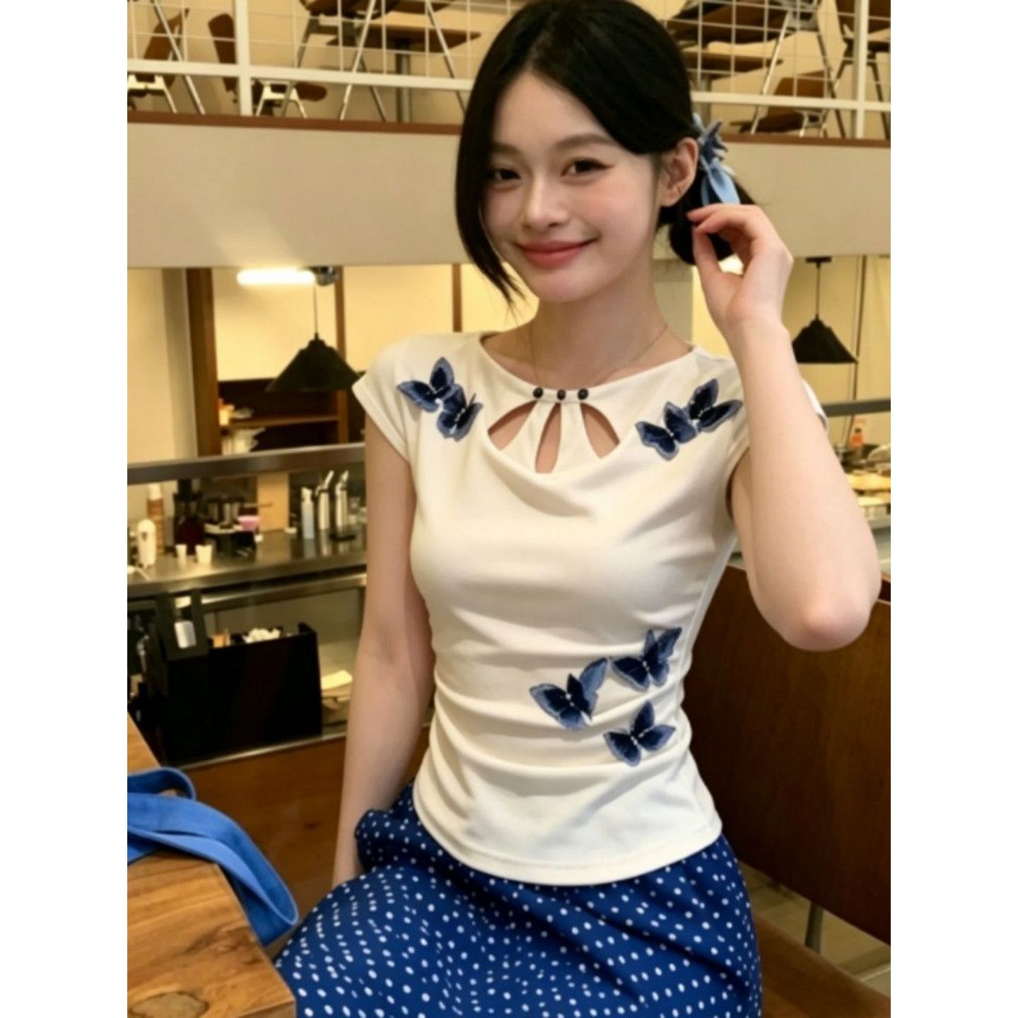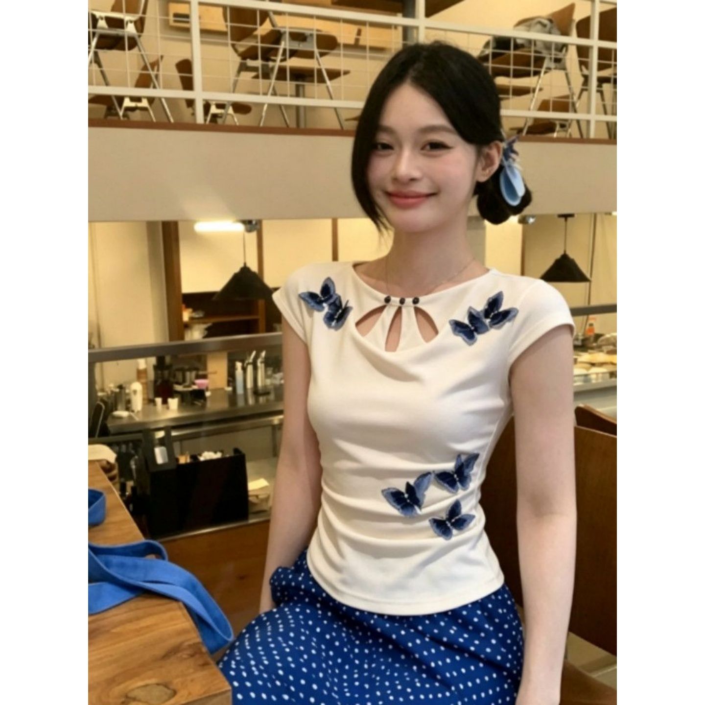 원본 자수 네리 플러스 스티커 몸매 가꾸기 라운드 넥 소뿔 소매 쇼트 스타일 티셔츠