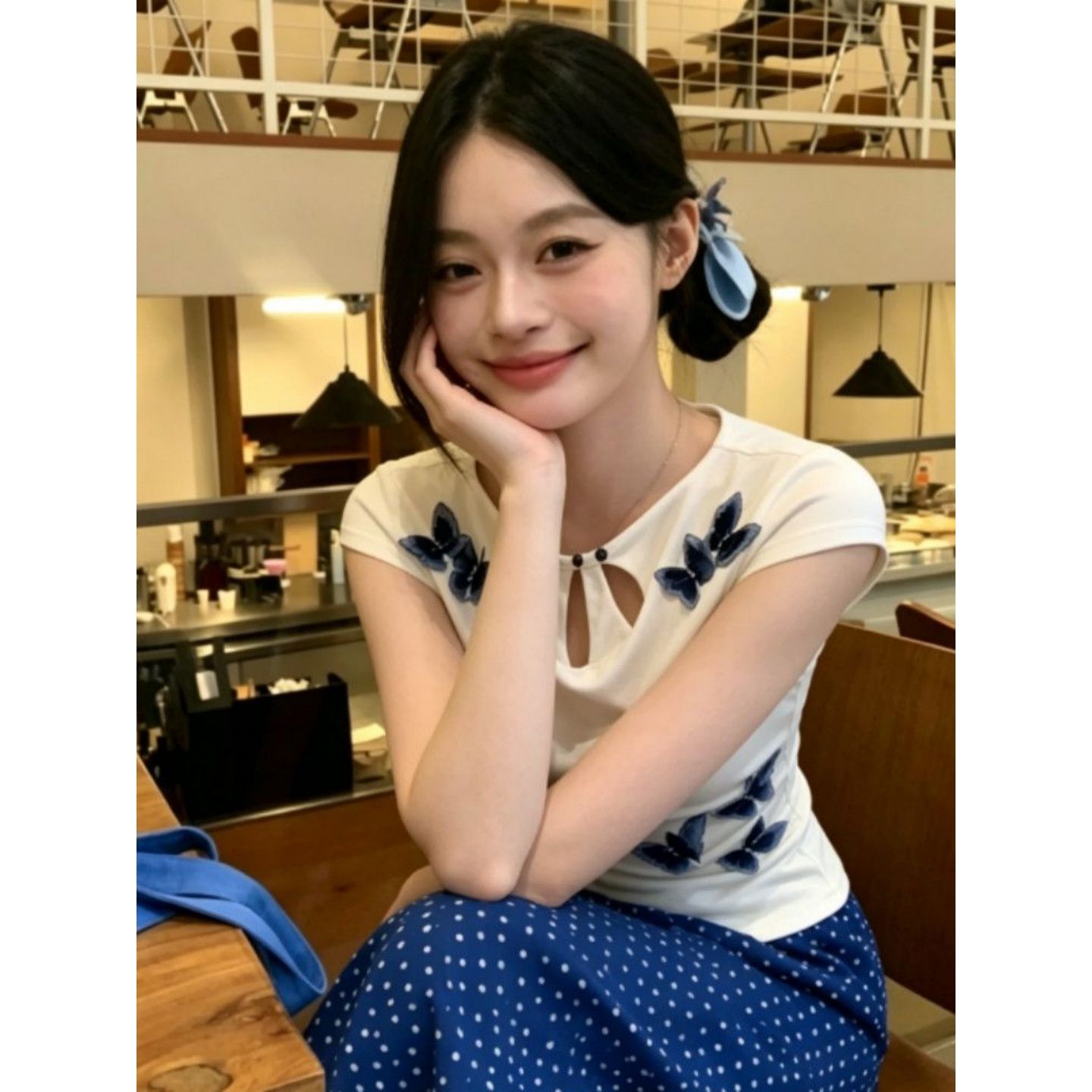배색 스트라이프 패치워크 나비 매듭 V넥 반팔 티셔츠 여성 여름 2026 새로운 핫걸 몸매 가꾸기 Chic